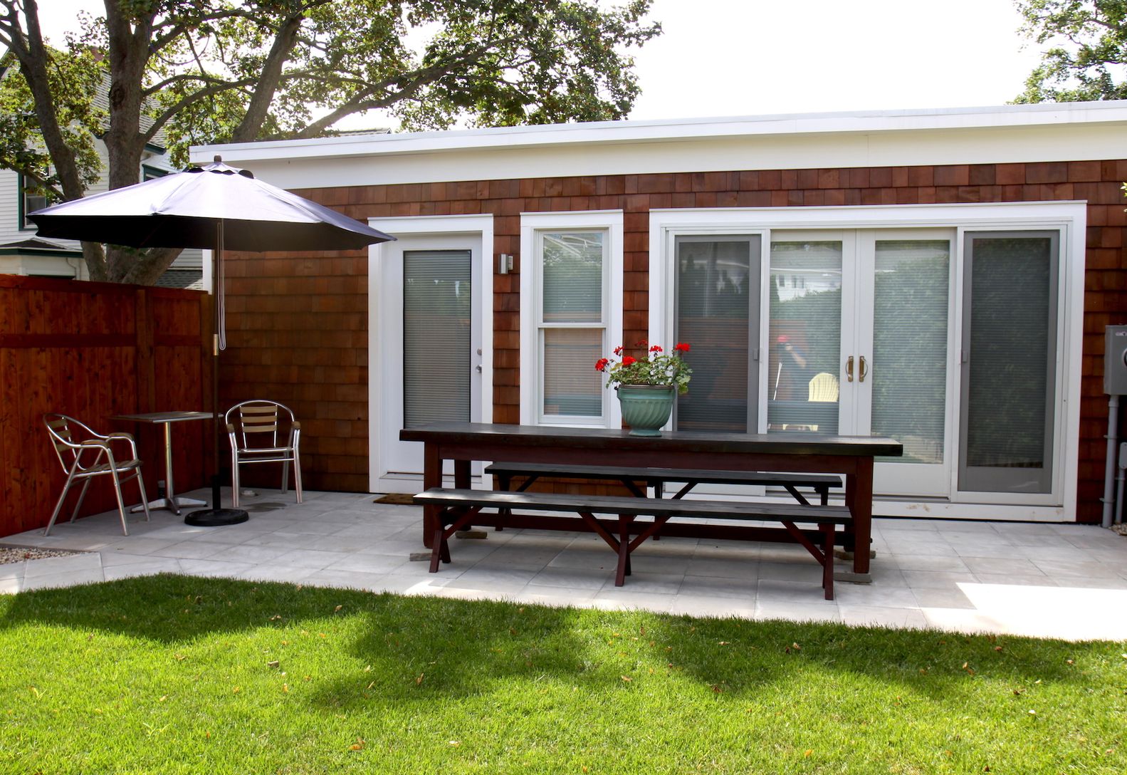 No car needed! This freshly converted brick building with great natural light offers a uniquely contemporary studio, with a distinctly industrial feel and a private fenced yard, hidden away in the heart of the village. In addition to a queen bed, there is a super comfortable queen convertible sofa and a full kitchen. It has sliding glass doors to a private garden with stone patio and Arts & Crafts table for 8 under a giant cantilevered um
