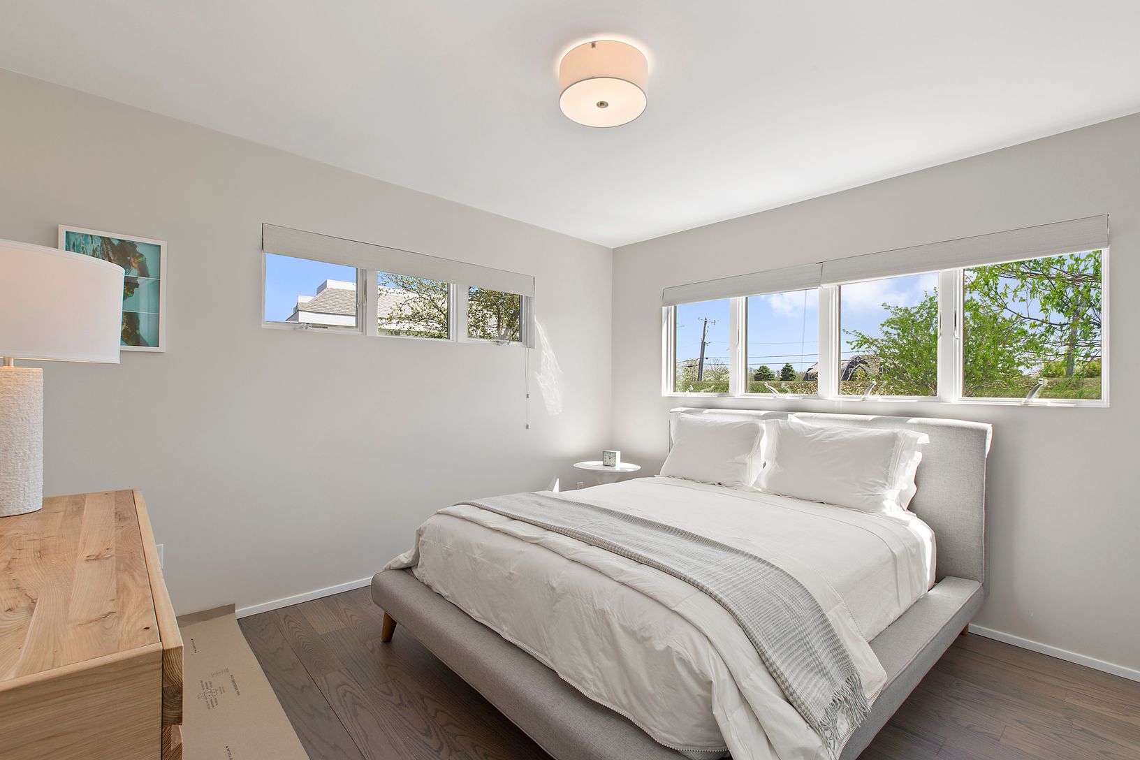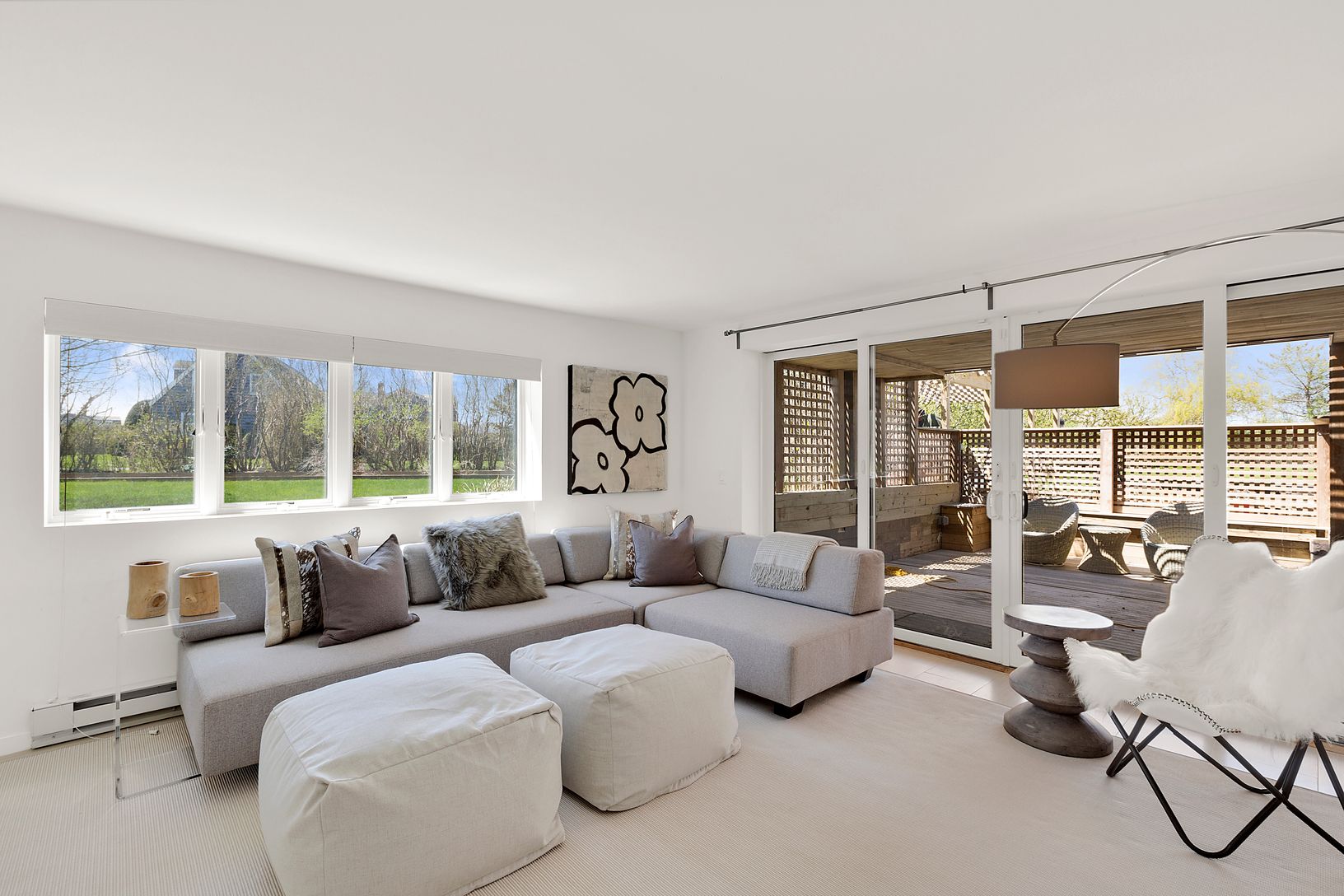 Situated on a full acre in a coveted Bridgehampton South location, this light-filled beach home is just a few lots from the ocean. The living room boasts soaring double-height ceilings and a dramatic wall of windows, showcasing sweeping views of the pristine grounds and capturing the stunning western light. The home features three bedrooms, including a primary suite with views of Mecox Bay, three full baths, a versatile loft space, and an open