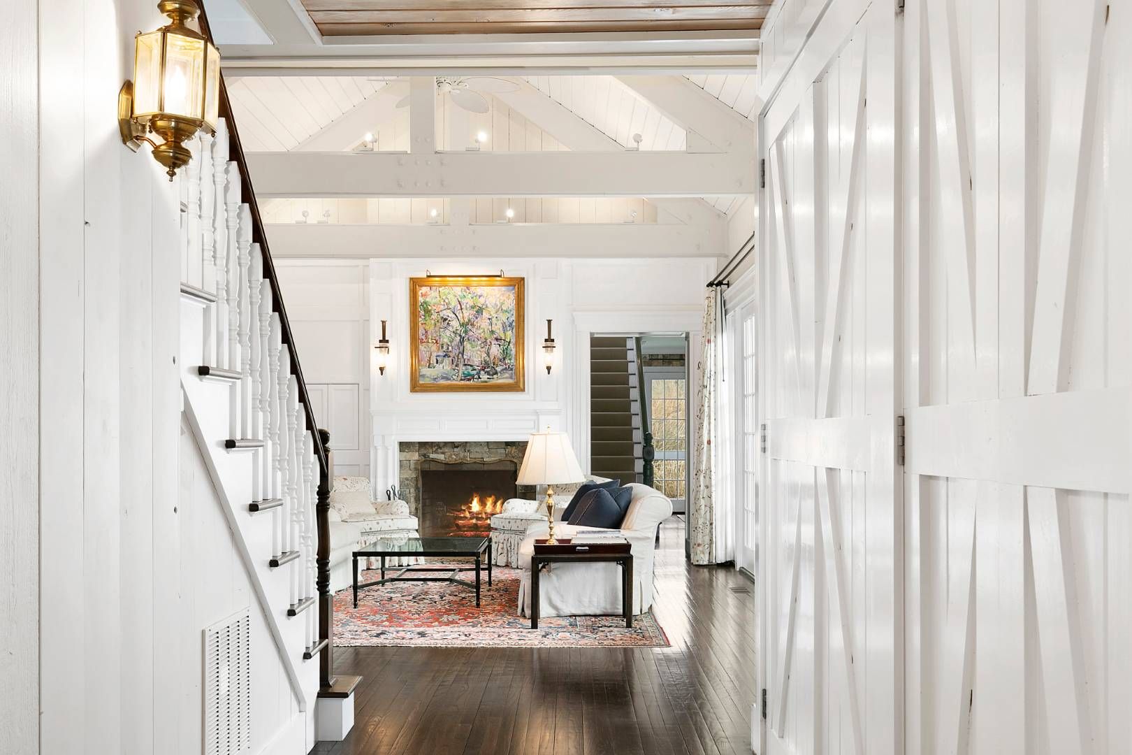 This five-bedroom, five and one-half bath, Sagaponack, Traditional, is nestled on a lush acre, surrounded by mature hedges, hydrangeas, and stunning rhododendrons. Situated across from a 32 +/- acre farm preserve, and less than one half mile from the ocean, enjoy the sounds of the ocean from this peaceful escape. A spacious 4,230 +/- square feet, with the cozy feeling of a Hamptons cottage. The living room is at the center of the house and was