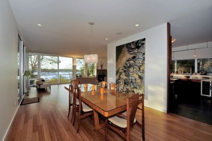 Water and woods converge in a setting of great natural beauty, tranquility and remarkable views. Architect Jonathan Foster has taken full advantage of this environment and has created a unique waterfront compound. The main house is positioned to enjoy ideal waterfront views and sunsets while at the same time embracing the natural wooded setting of its surroundings. Cleverly designed decks can be accessed from most rooms, and the open living/di