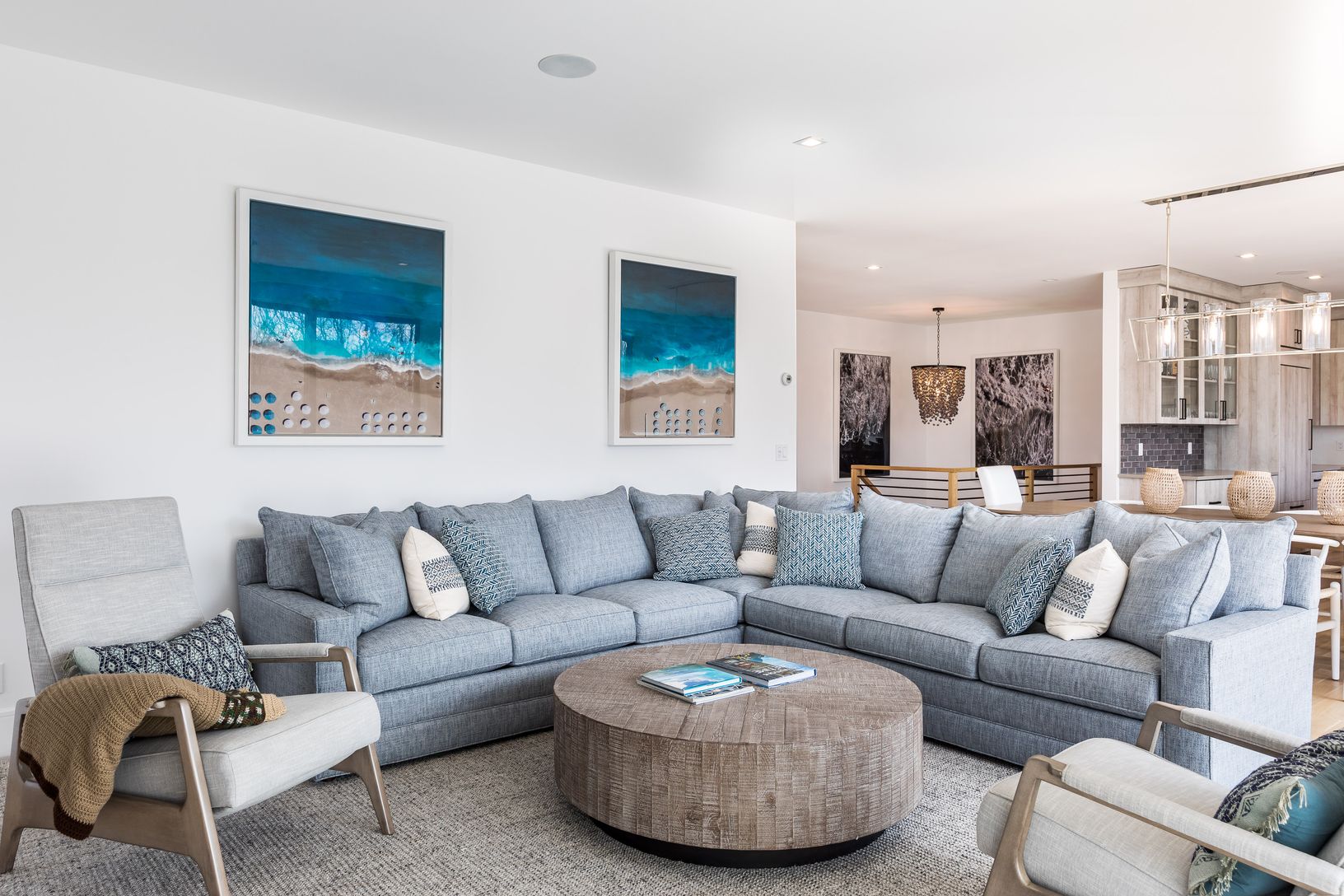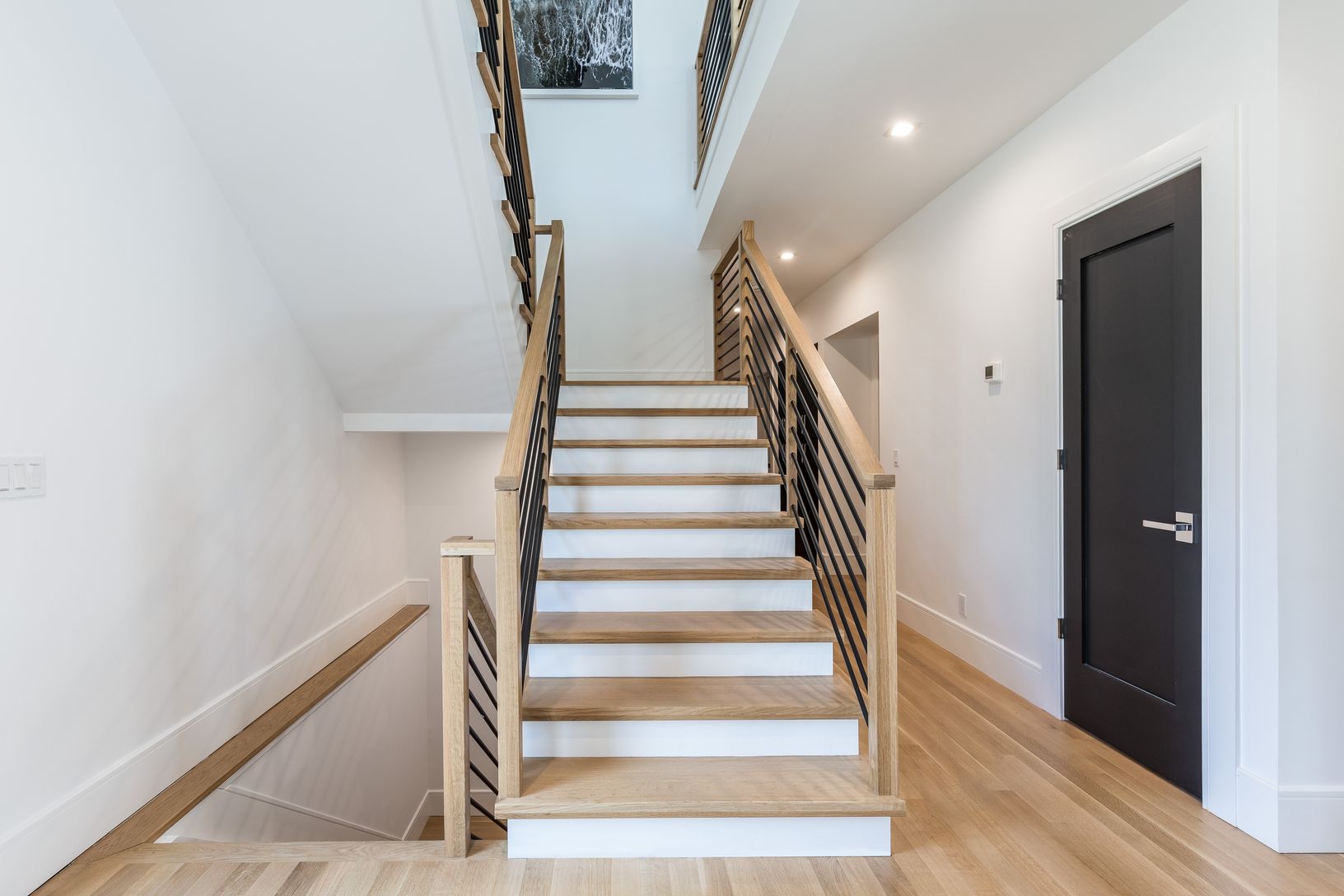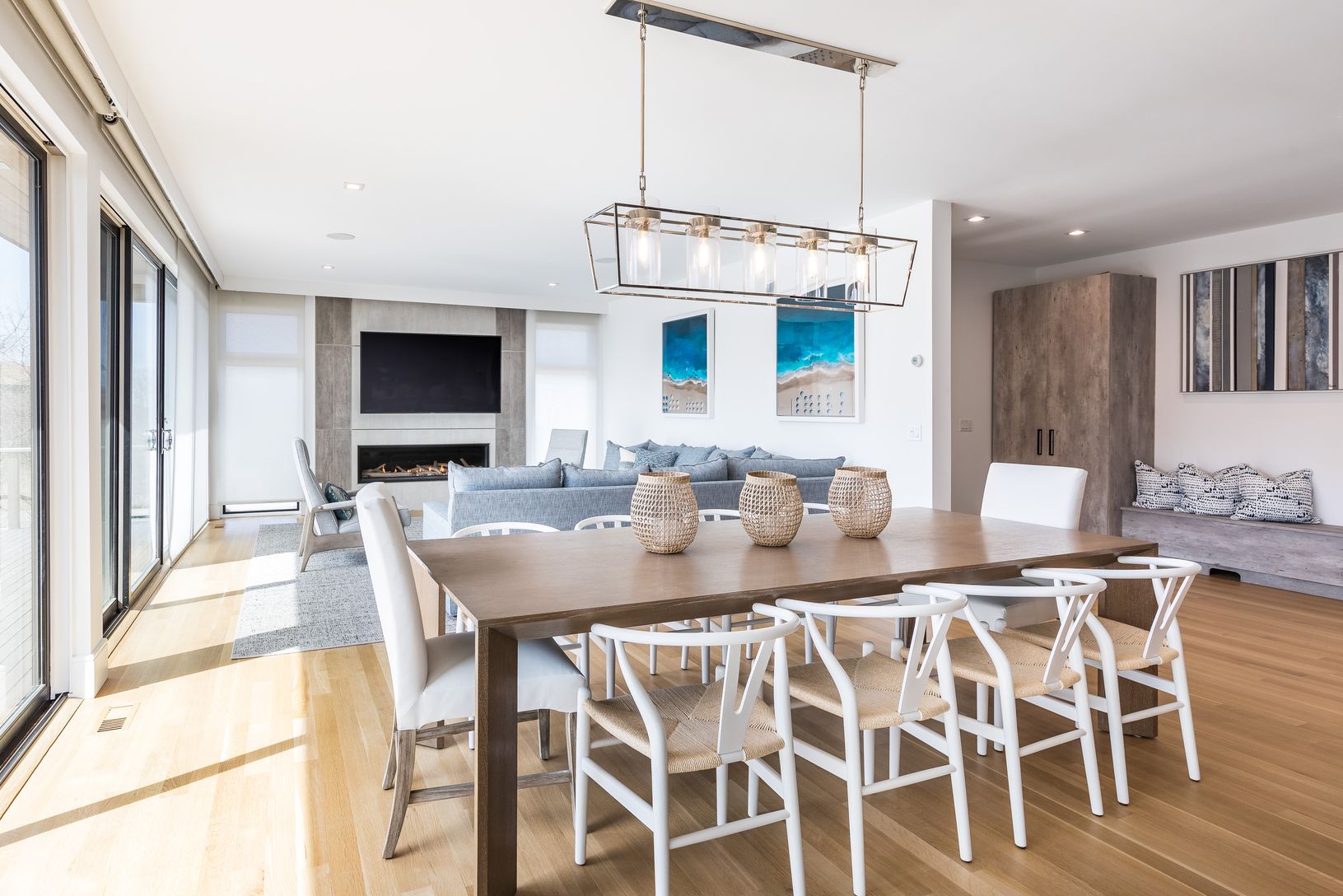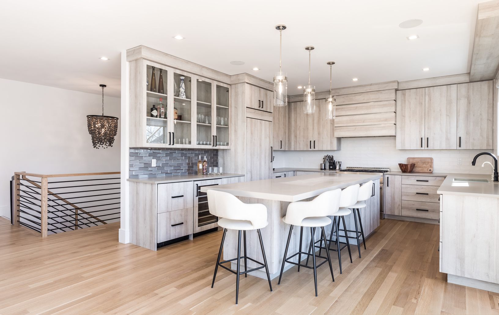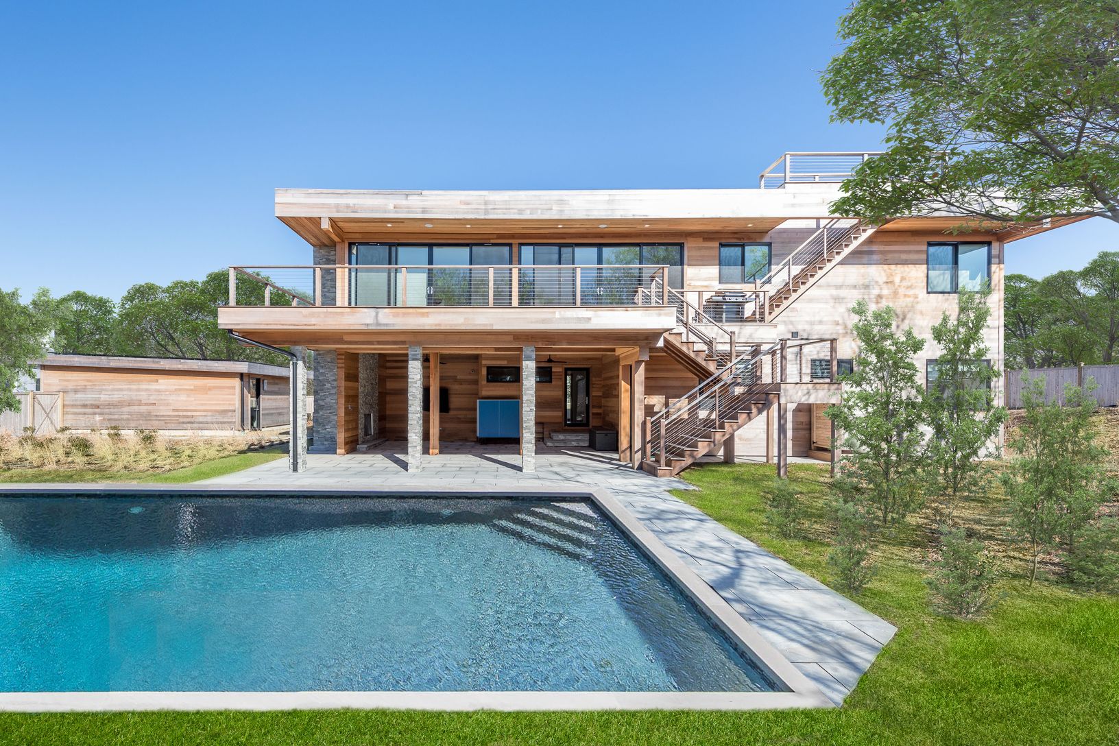 This gorgeous modern home was recently completed and offers comfortable sleek living spaces both indoors and out. Conveniently located a quiet street, central to Montauk town amenities, the ocean, and harbor shops and dining. The first level of the home features two guest bedrooms with a shared full bathroom, an ensuite guest bedroom, laundry room with double washer and dryers, and a full bathroom. Upstairs, the gourmet kitchen is open to a di