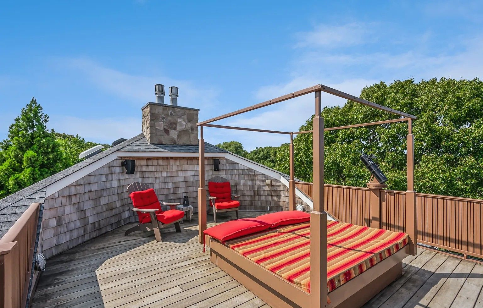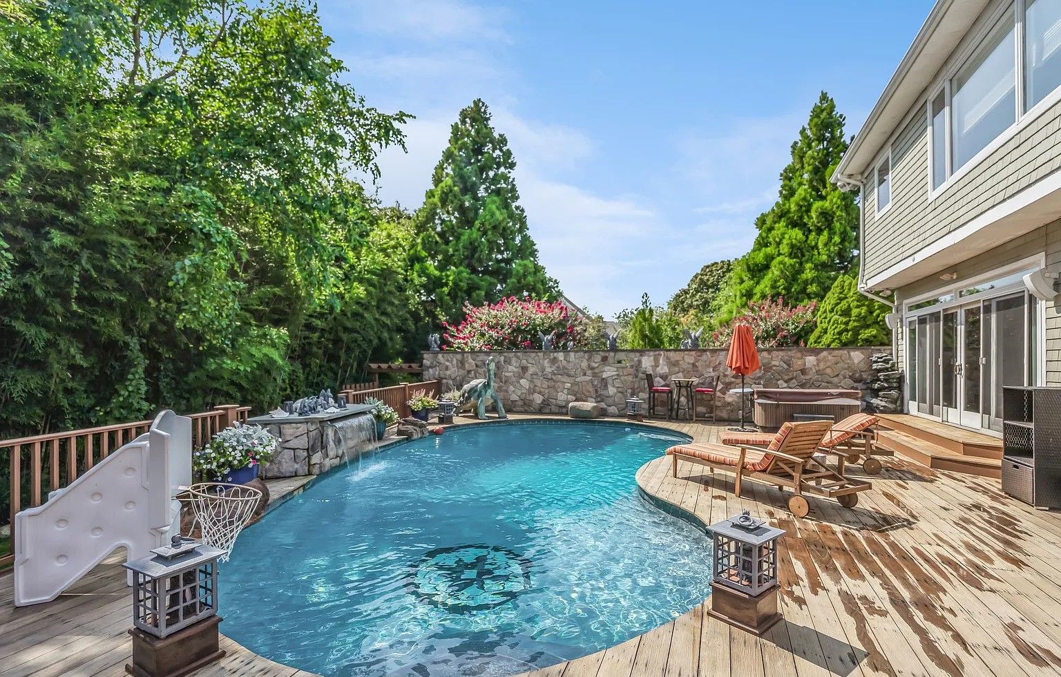 Custom built unique 4 bedroom, 2 1/2 bath, 3 level home on a quiet street in an upscale neighborhood close to the beach (Ditch Plains), shops, the harbor, and town. Private and secluded yard with kidney shaped gunite pool and a hot tub, outdoor shower and kitchen, beautifully landscaped grounds with stunning stone work, recently upgraded or renovated with many brand new amenities, all new deck furniture and grill, and rooftop deck with gorgeou