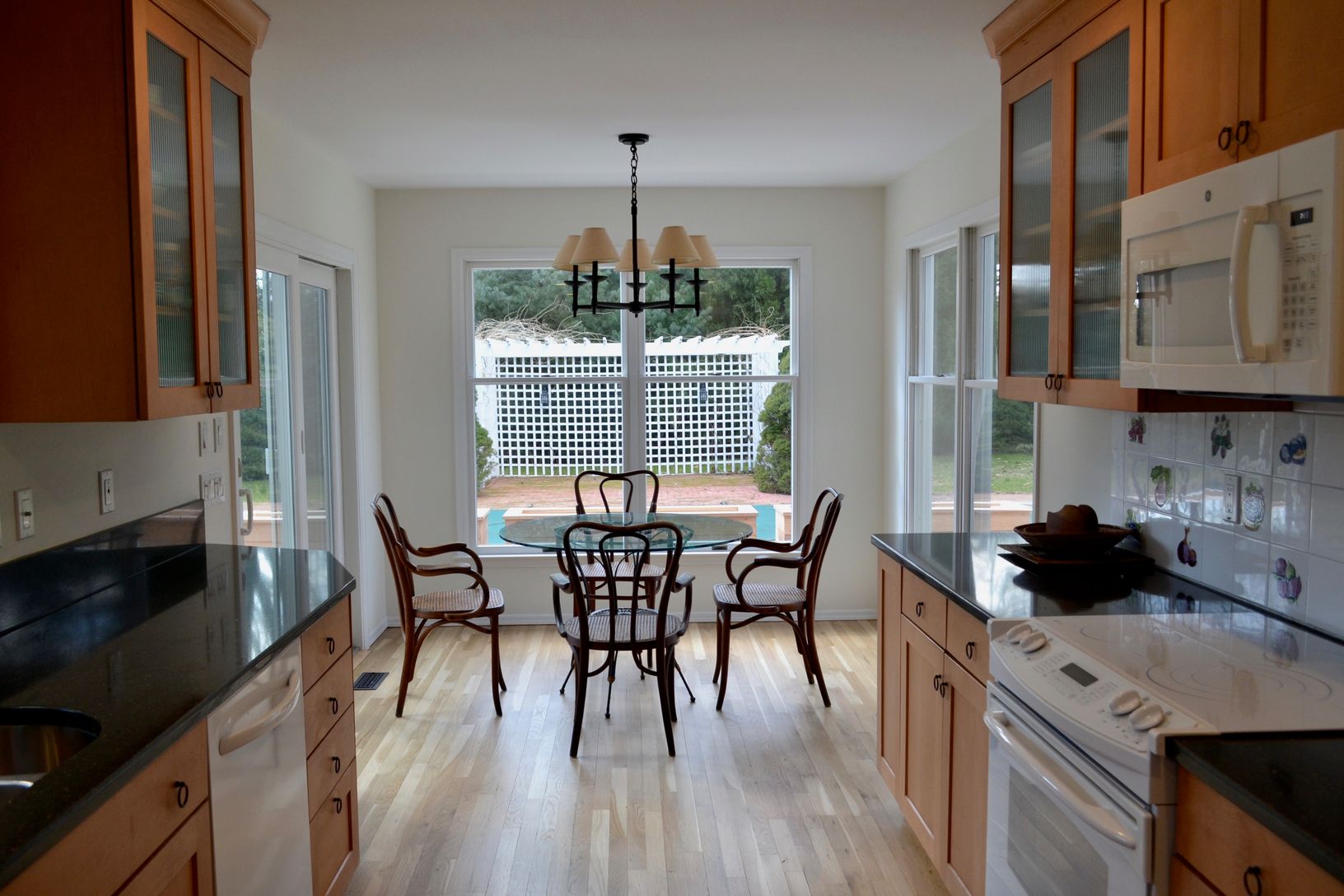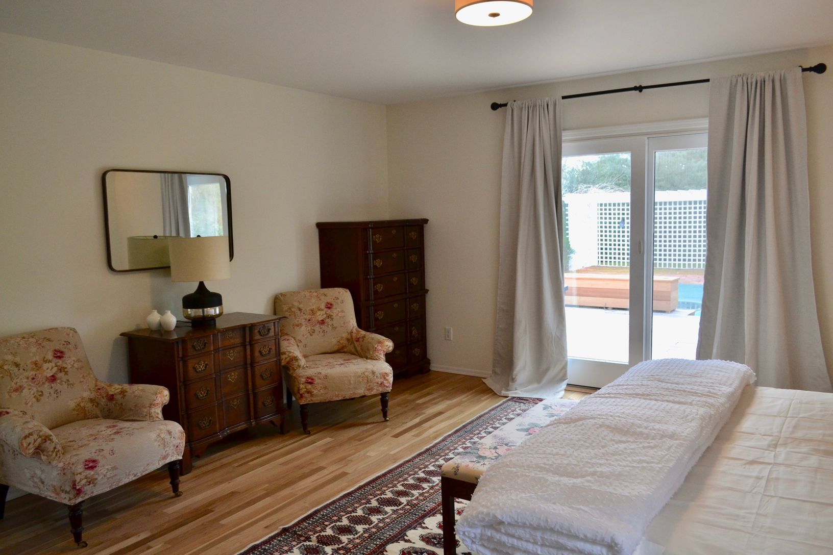 Rental Registration#: 19-271. Very close to East Hampton Village on a quiet, dead end street. This traditional home is almost like new - freshly painted, wood floors redone, new linens and furniture! The homes features a light filled open living room and dining room with high cathedral ceilings and skylights; there is an eat in kitchen all with access to the back deck and very private pool area. There is a first floor en suite master bedroom w