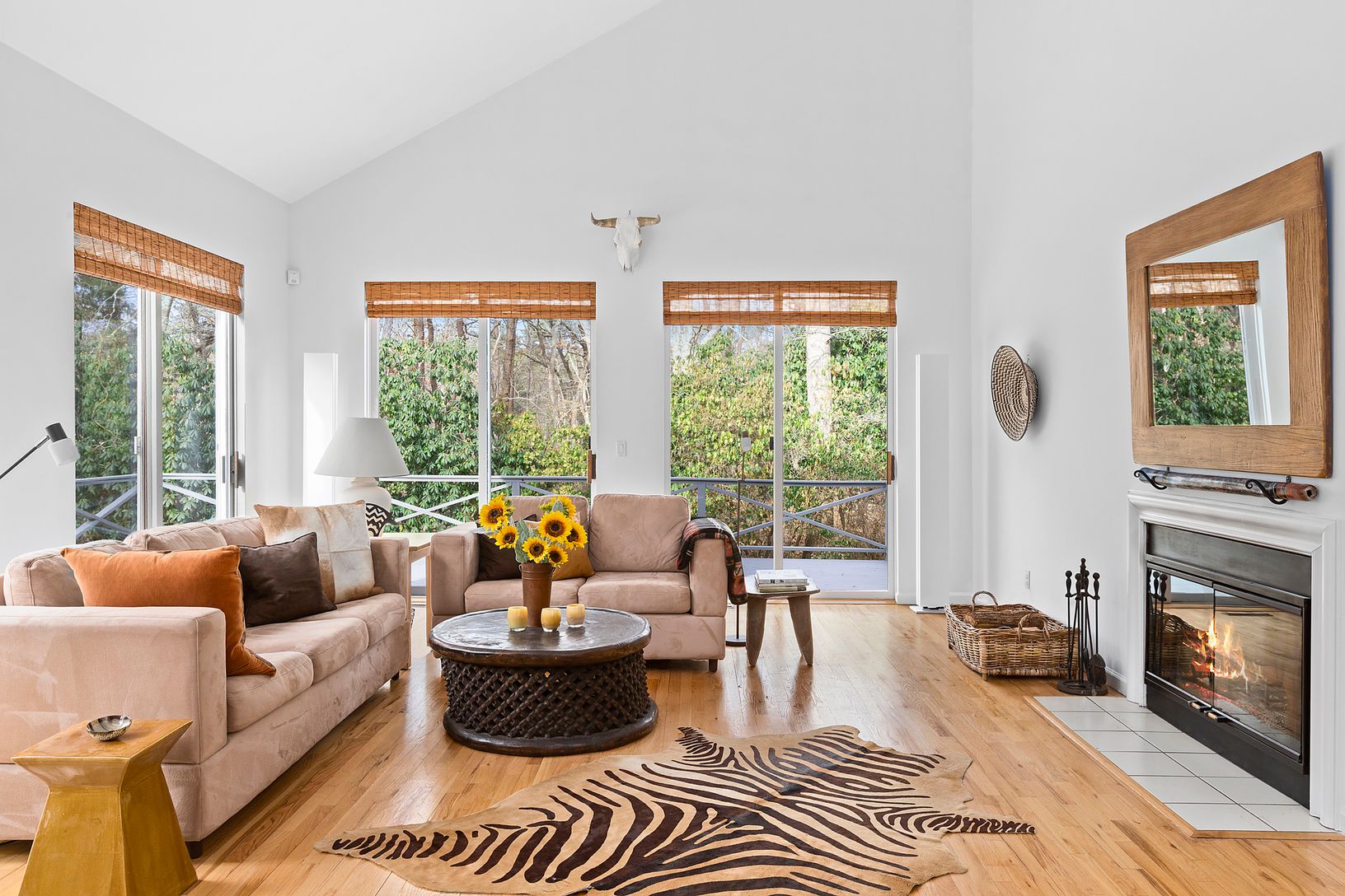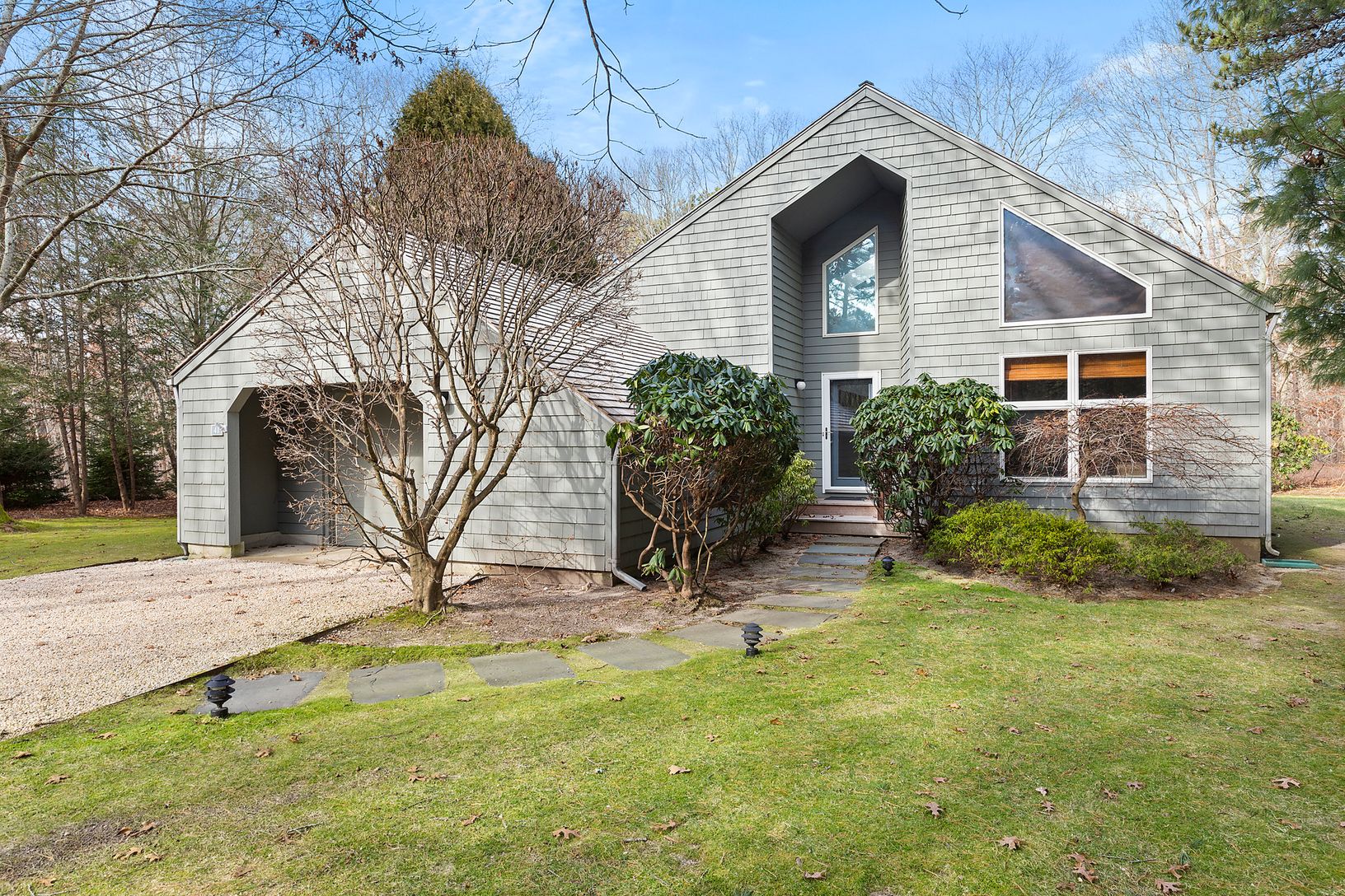 Located in exclusive Georgica Estates, a condominium community of 65 free standing modern houses, this single-level, three bedroom home features a grand two story entrance gallery, wonderful spacious living room with cathedral ceiling, fireplace and two full walls of glass opening onto a huge wrap around sundeck. The kitchen opens to the dining area as well as the third bedroom, allowing the bedroom to work as a den if you so desire. The overs