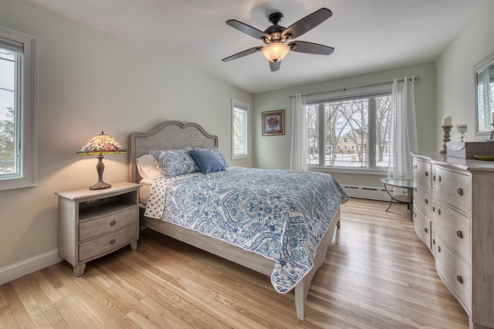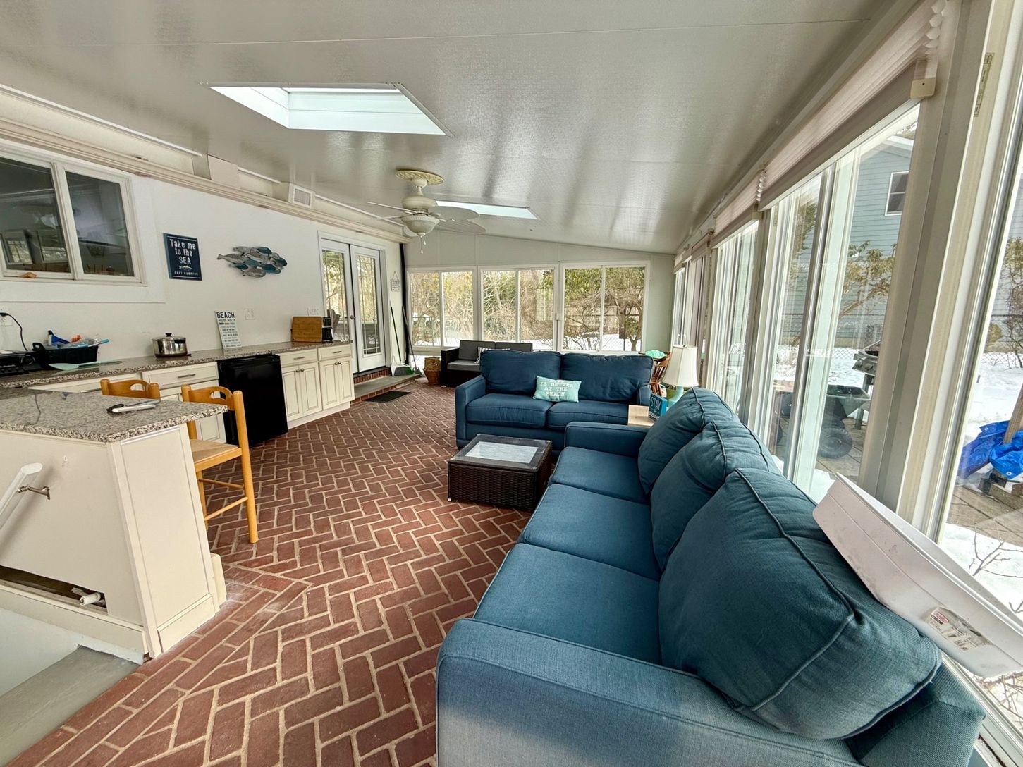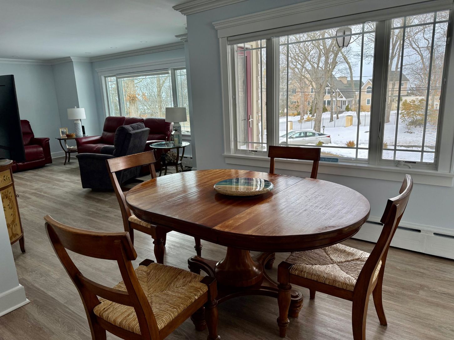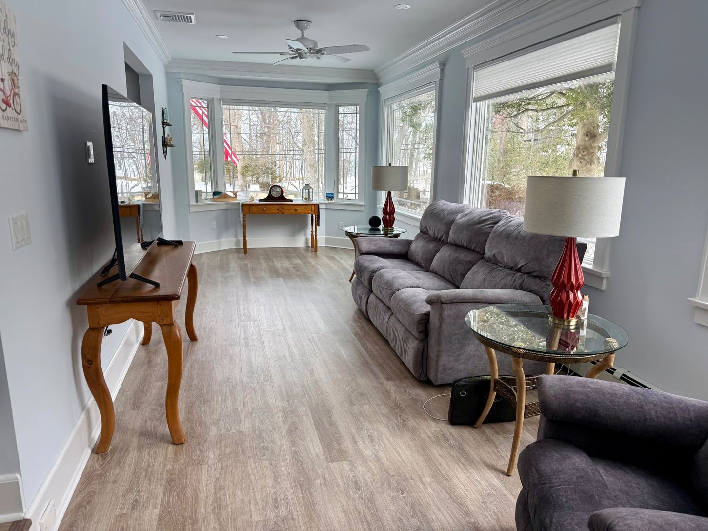 Set high atop a hill with winter water views over Peconic Bay, this private retreat is located within the coveted Red Cedar Point Association, offering access to three sandy bay beaches and unforgettable sunsets every evening. The spacious, light-filled traditional features an open, flowing layout with living room and fireplace, dining room, and kitchen-perfect for both relaxed living and entertaining. A den and sunroom add flexible living spa