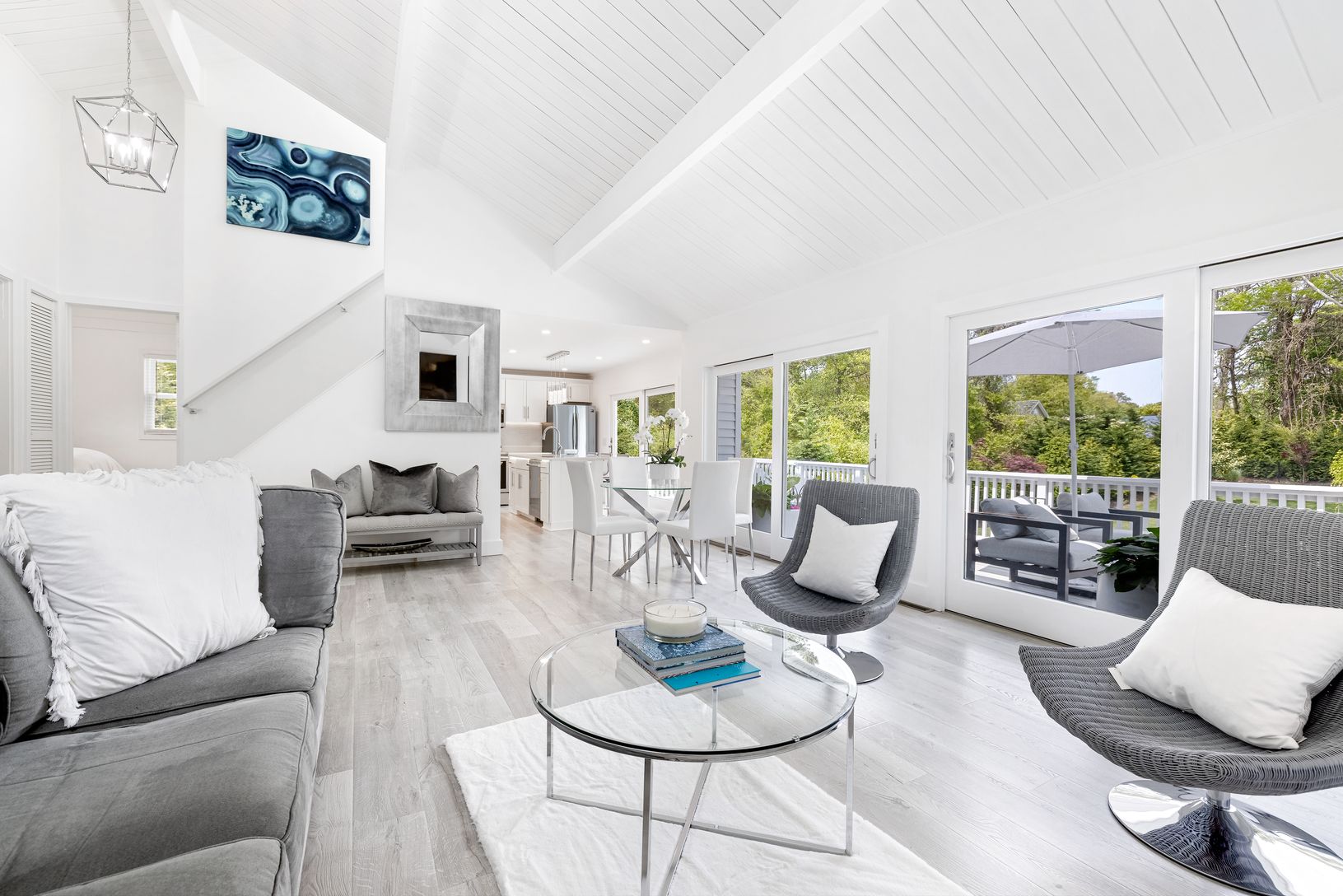 Move right in to this newly refreshed home surrounded by beautifully landscaped grounds. The main floor boasts two guest bedrooms and one full bath, an open living area with double height ceilings and fireplace, open kitchen with center Island. Great Room. Upstairs offers you a private primary en-suite. There are sliding glass doors that lead from the kitchen and great room to a perfect deck for entertaining and dining outdoors. In the yard y