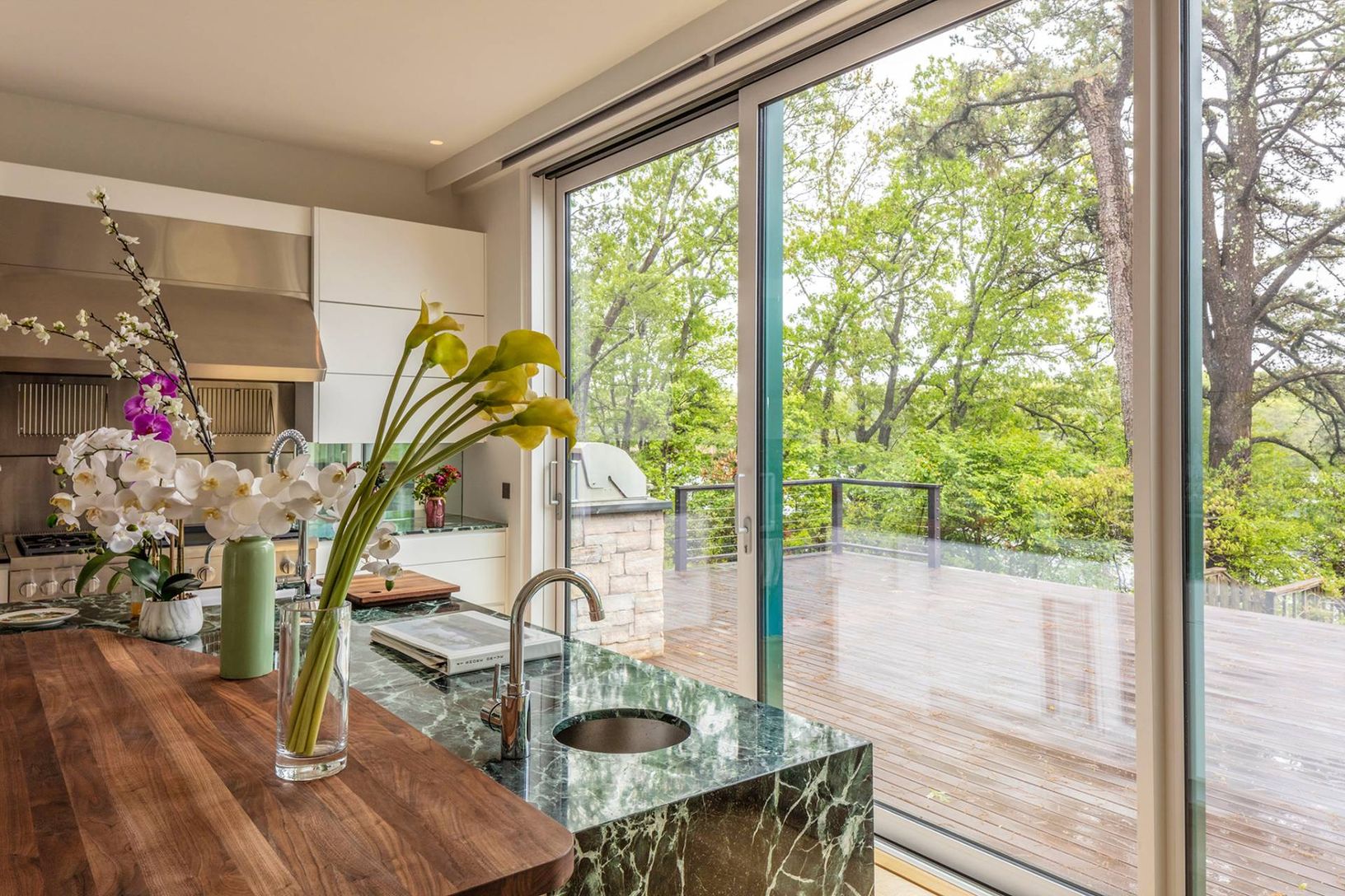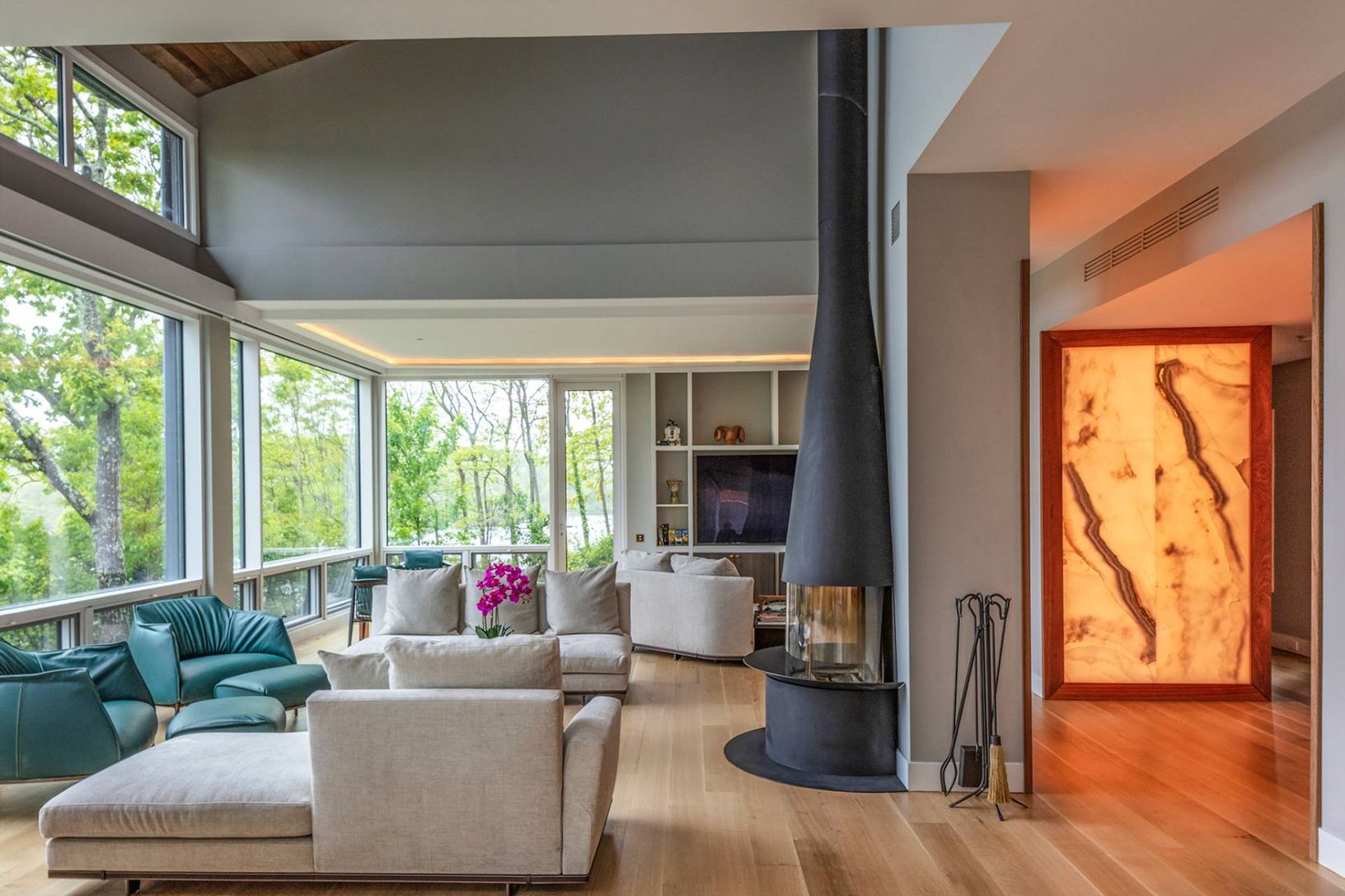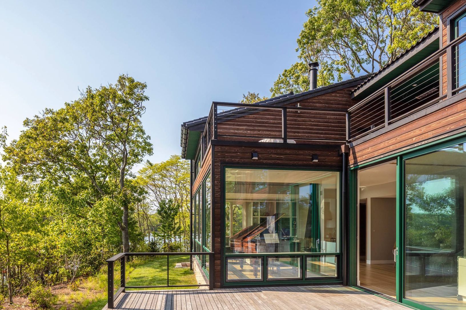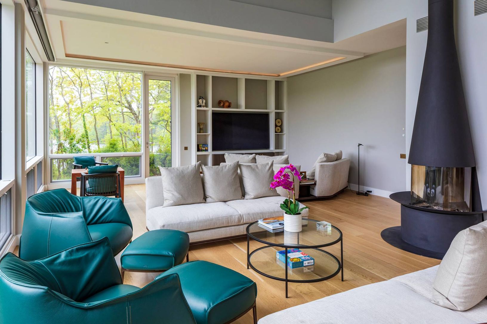 Architecturally stunning and exceptionally private, this unique Hamptons home abutts over 200 acres of pristine nature in your backyard, including the 85-acre Big Fresh Pond and 135-acre reserve, the property offers direct access to swimming, kayaking, fishing, and hiking. The home spans 6,000 +/- sq. ft. of sophisticated living space across three levels, all accessible via a convenient passenger elevator. Privacy, peace, and sweeping sunset v