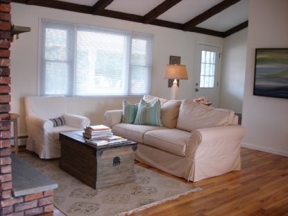 near the bay in Westhampton. This one level, three-bedroom, two-bath home is in perfect move-in condition. The spacious living room with fireplace has a cathedral ceiling. The dining area faces pool and deck. Recently renovated with a new granite kitchen and appliances, new bathrooms, oak floors, den, new central air conditioning, sprinkler system and lawn.. Don't m