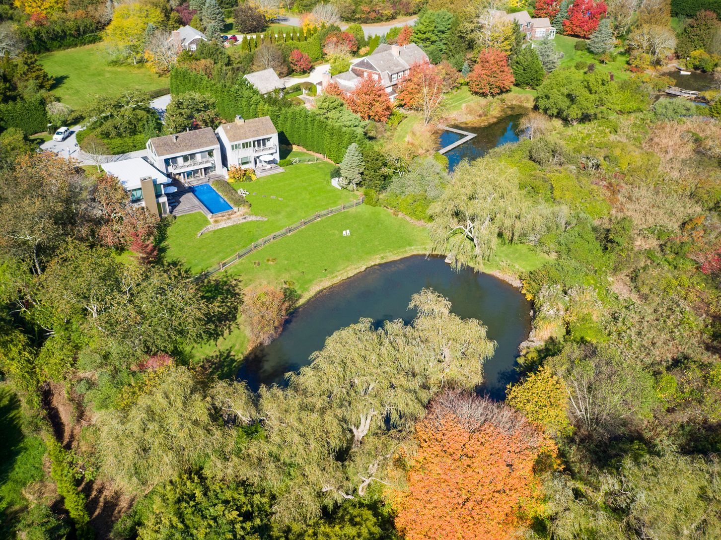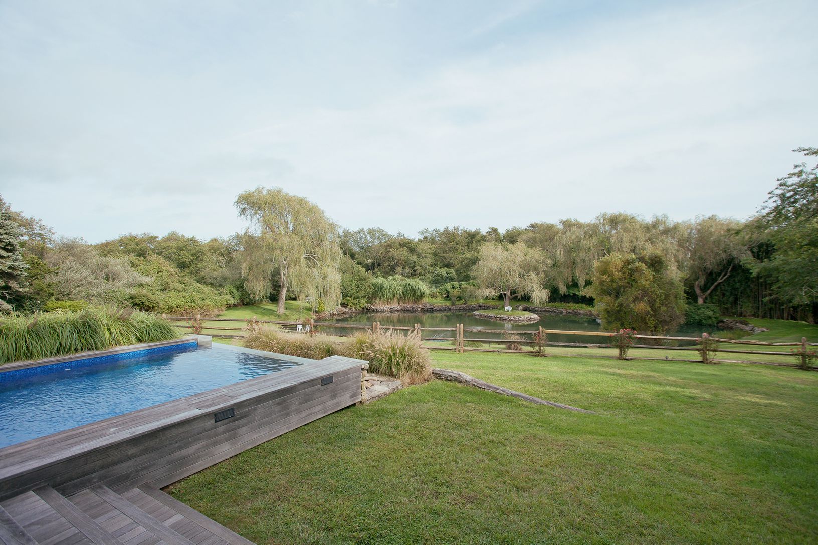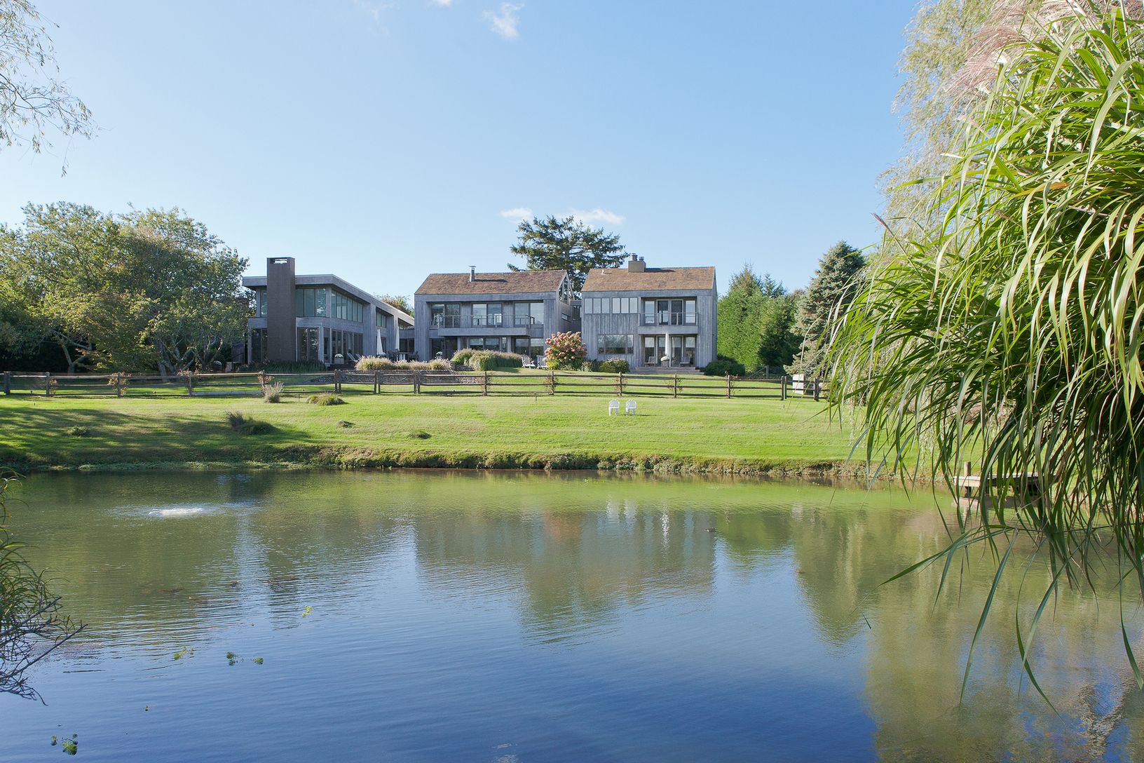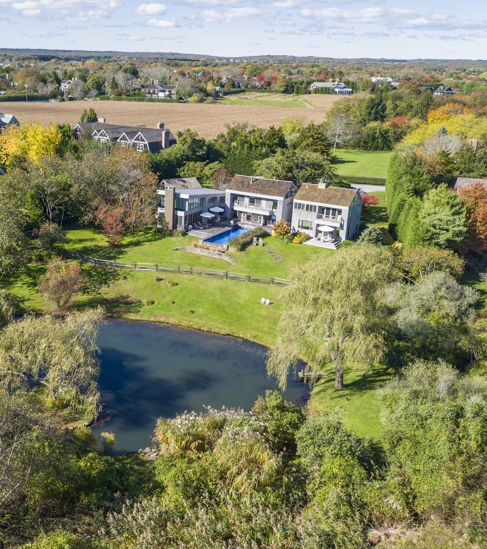 This Bates modern sits on a shy 2 +/- acre lot overlooking a large scenic pond with waterfalls and bridge. Beautifully landscaped with many specimen trees. The home has five bedrooms and four and one-half baths with a vanishing edge pool. An very unique and special property located at the end of a quiet cul-de-sac. What the Hamptons are all about. Peaceful and lovely tranquility!!