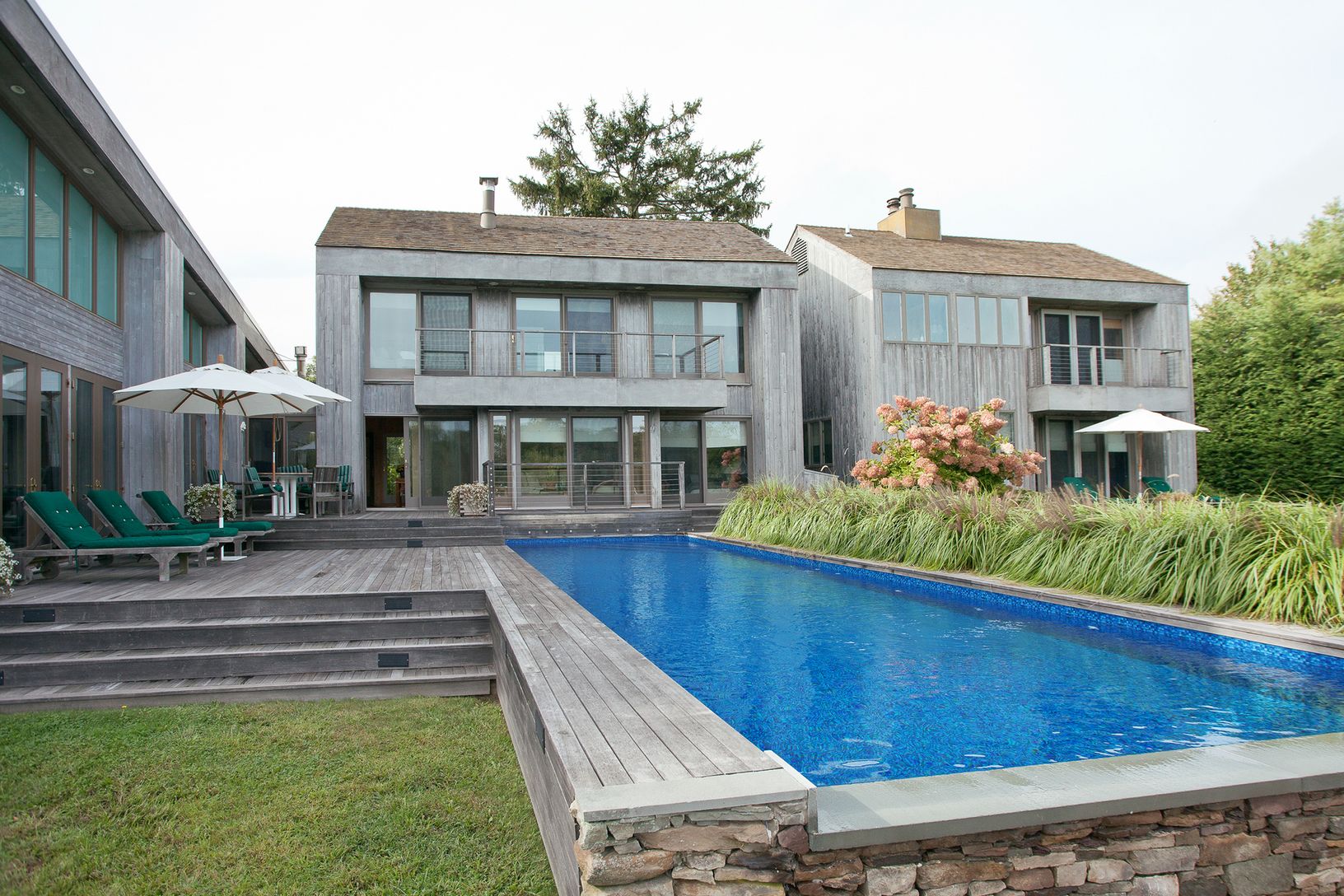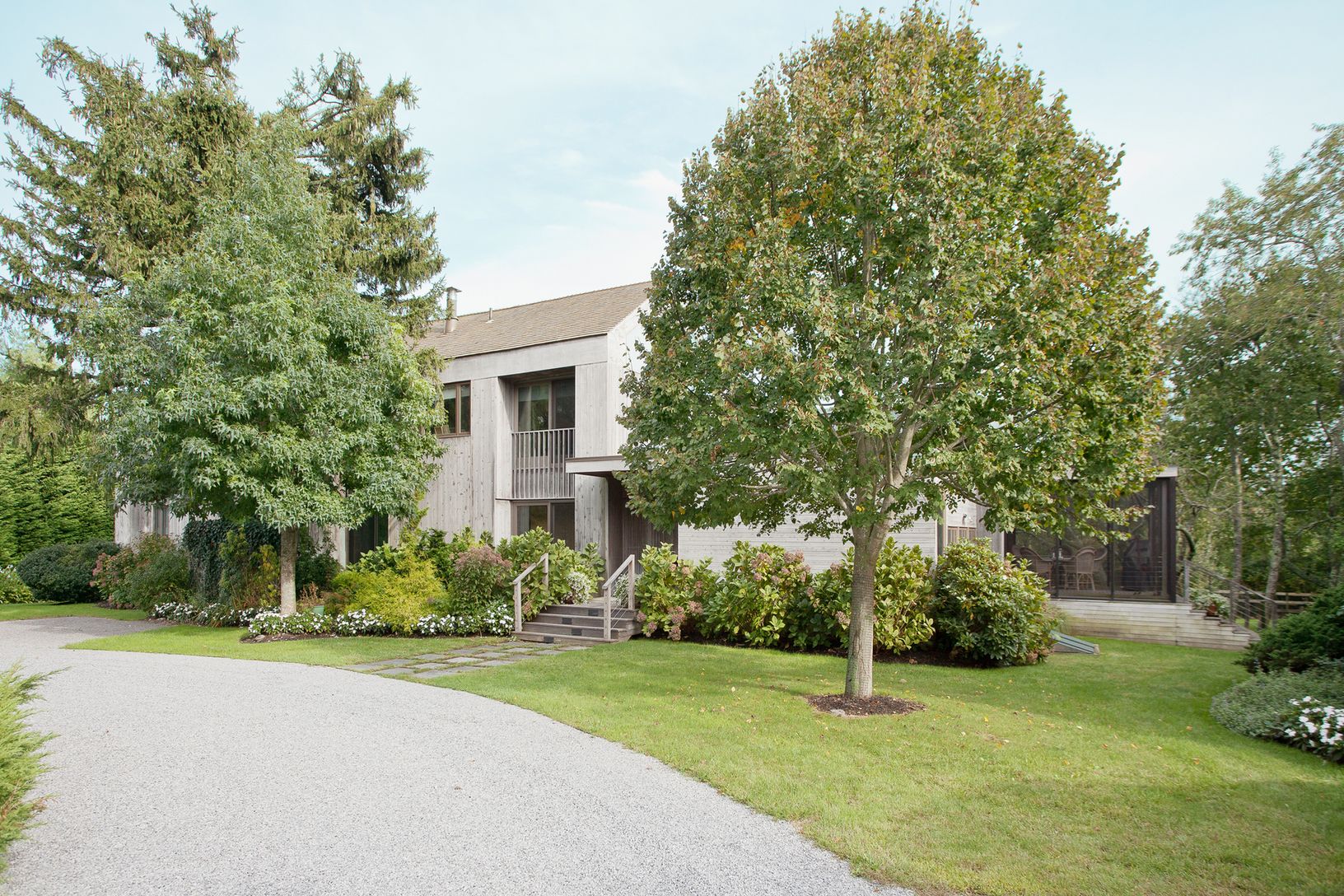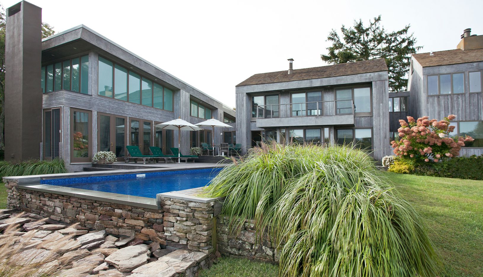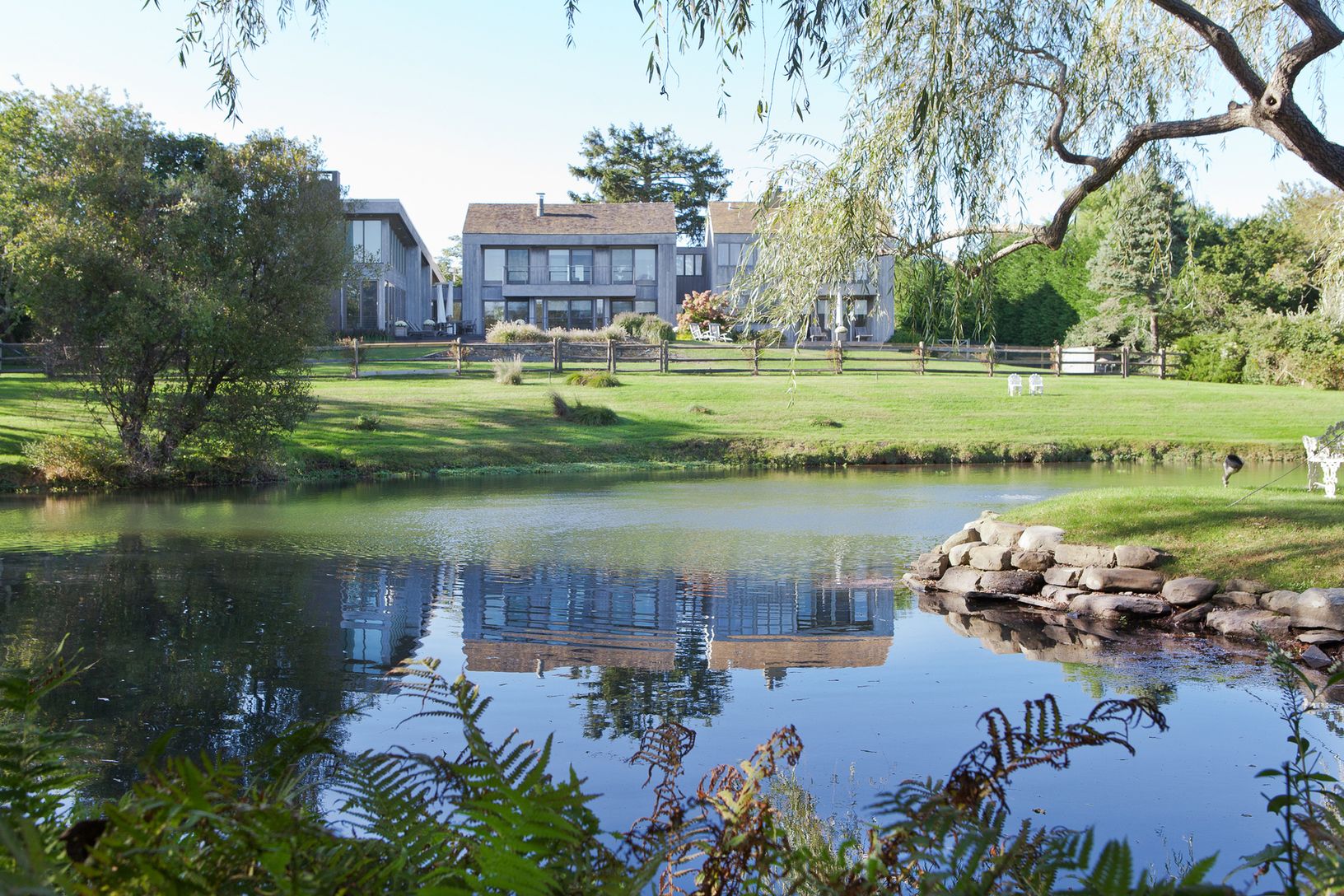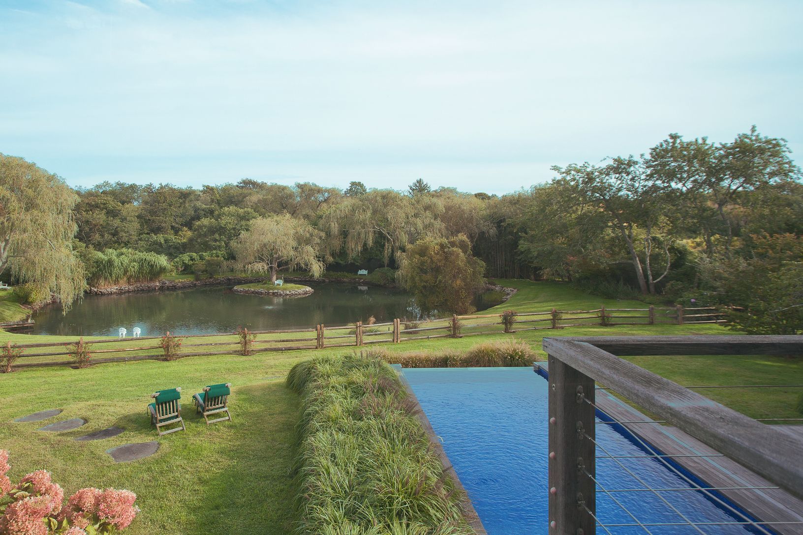 This Bates modern sits on a shy 2 +/- acre lot overlooking a large scenic pond with waterfalls and bridge. Beautifully landscaped with many specimen trees. The home has five bedrooms and four and one-half baths with a vanishing edge pool. An very unique and special property located at the end of a quiet cul-de-sac. What the Hamptons are all about. Peaceful and lovely tranquility!!