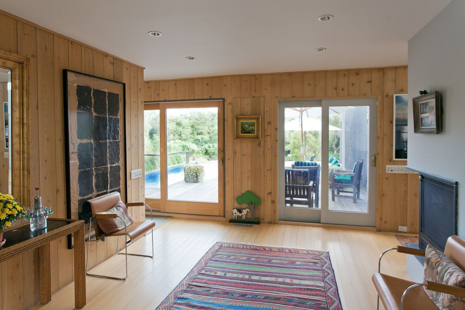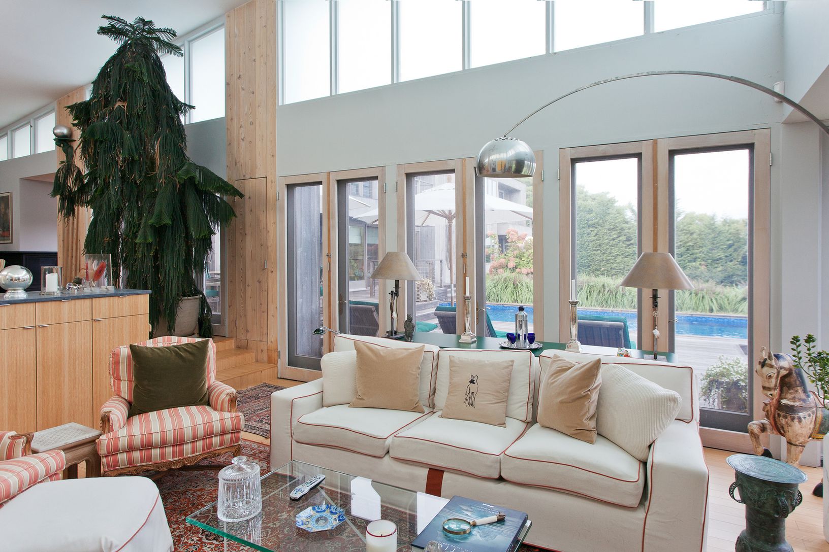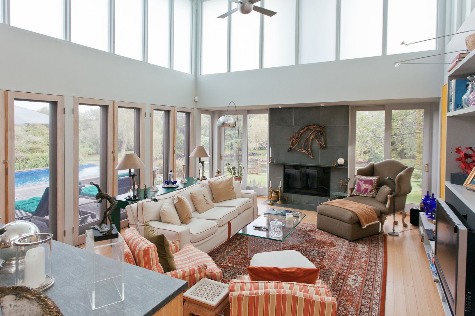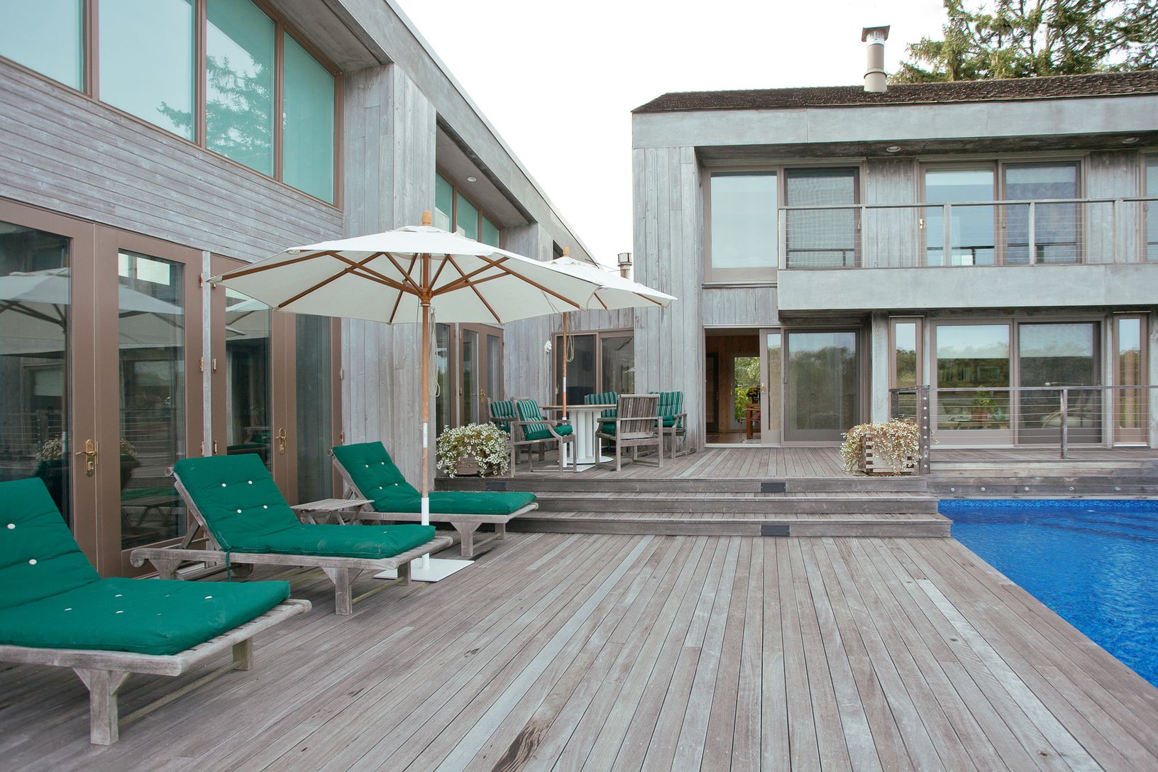 This Bates modern sits on a shy 2 +/- acre lot overlooking a large scenic pond with waterfalls and bridge. Beautifully landscaped with many specimen trees. The home has five bedrooms and four and one-half baths with a vanishing edge pool. An very unique and special property located at the end of a quiet cul-de-sac. What the Hamptons are all about. Peaceful and lovely tranquility!!
