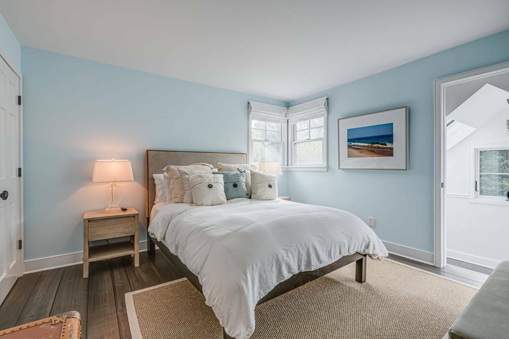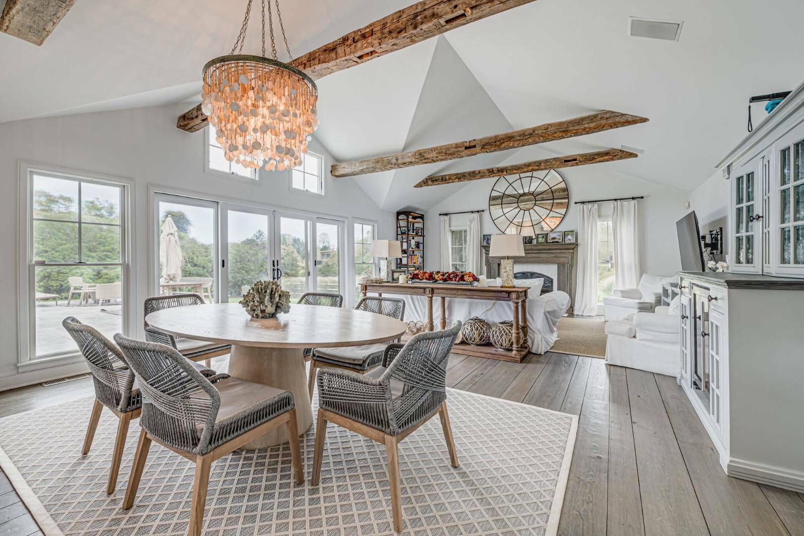 This newly renovated traditional south of the highway in Water Mill sits on a just-shy acre. The 5 bedrooms and 4.5 baths include a spacious first floor master suite with glass doors to a rear patio and luxe bath with frameless glass shower with bench, shelf, marble floor and subway tile walls. Open concept living areas with high beamed ceilings and glass doors to the patio, pool and grounds include a living room with fireplace, dining, and be