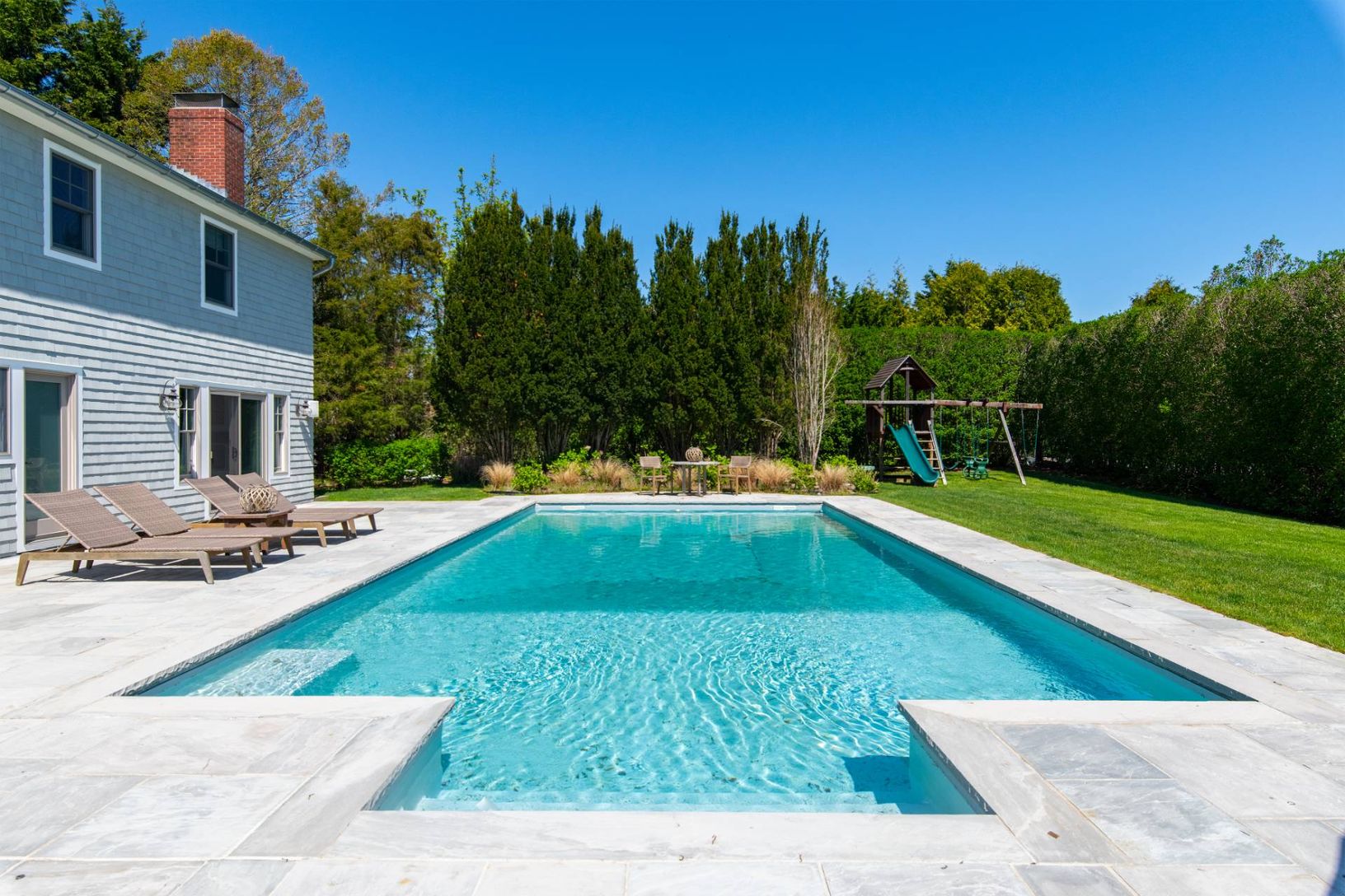 Sited on a full acre well south of the highway in Water Mill, this Hamptons Beach House has been renovated and updated, and is a perfect Summer rental. Featuring five bedroom - including a first floor primary suite - and four full and one half bath, the home is everything you need. As you enter the home, a welcoming foyer leads to bright and open spaces, with kitchen, dining and living all overlooking the pool. Upstairs, four guest rooms are s