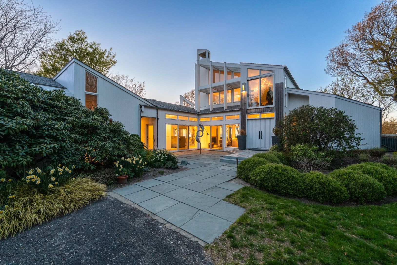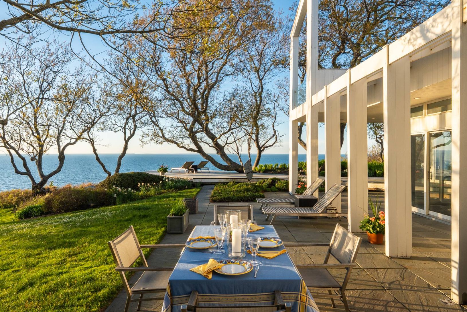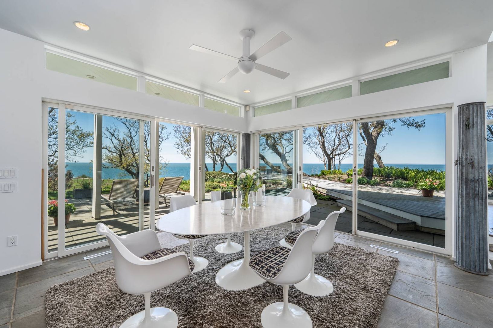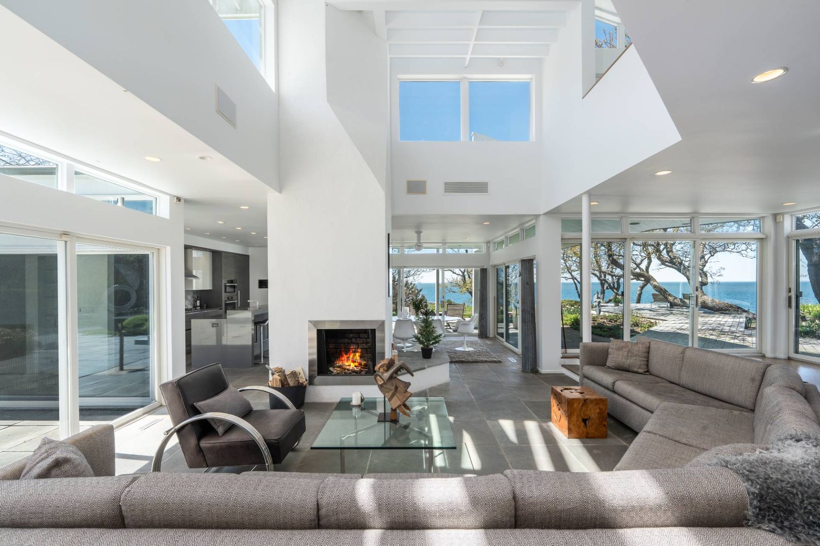 Perched on a 100-foot-high bluff with commanding views of Long Island Sound, this exceptional 3 + bedroom, 5 bath contemporary home is a rare fusion of design, privacy, and natural beauty. Originally designed and built in 1986 by architect Sanford Hanuer for his own use, the 3,348 sq ft residence was completely reimagined in 2011, preserving its architectural integrity while introducing luxurious modern updates. Set on 2.45 acres with 190 feet