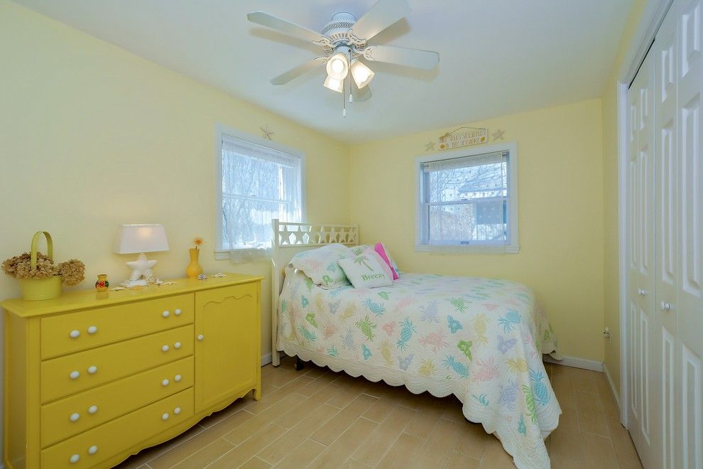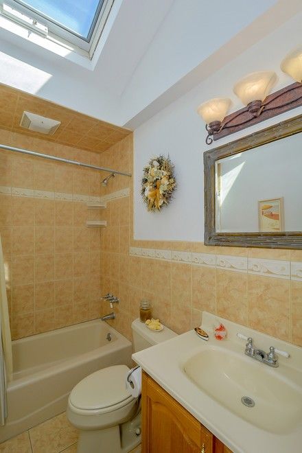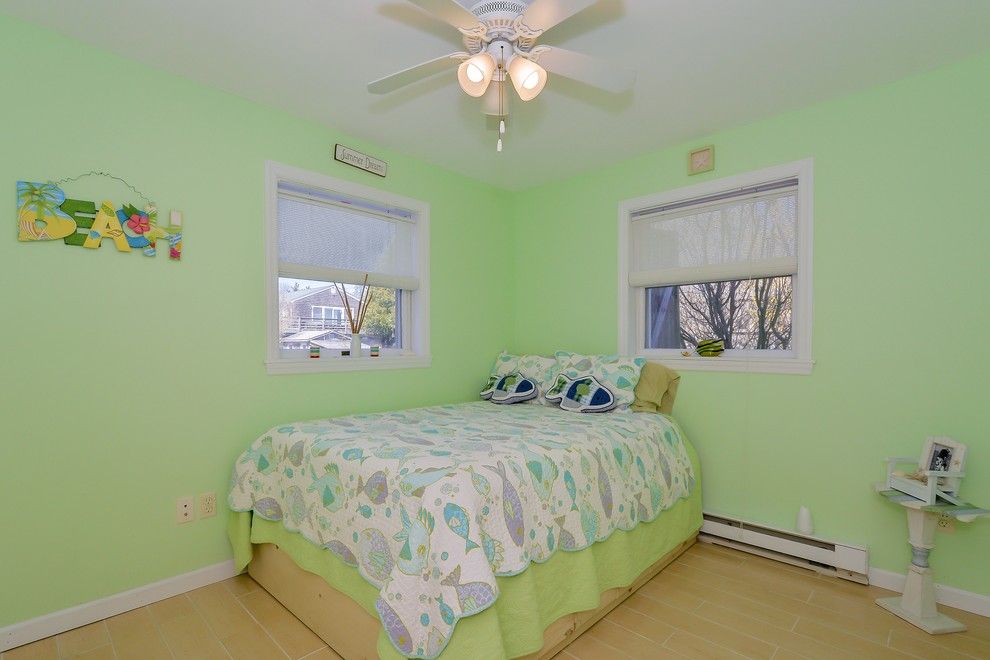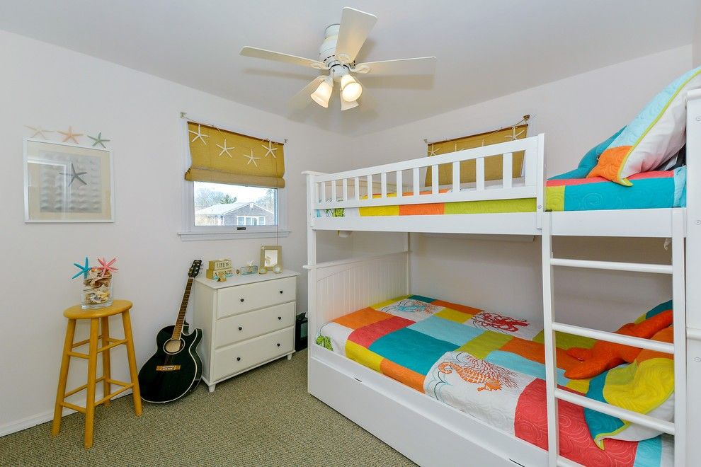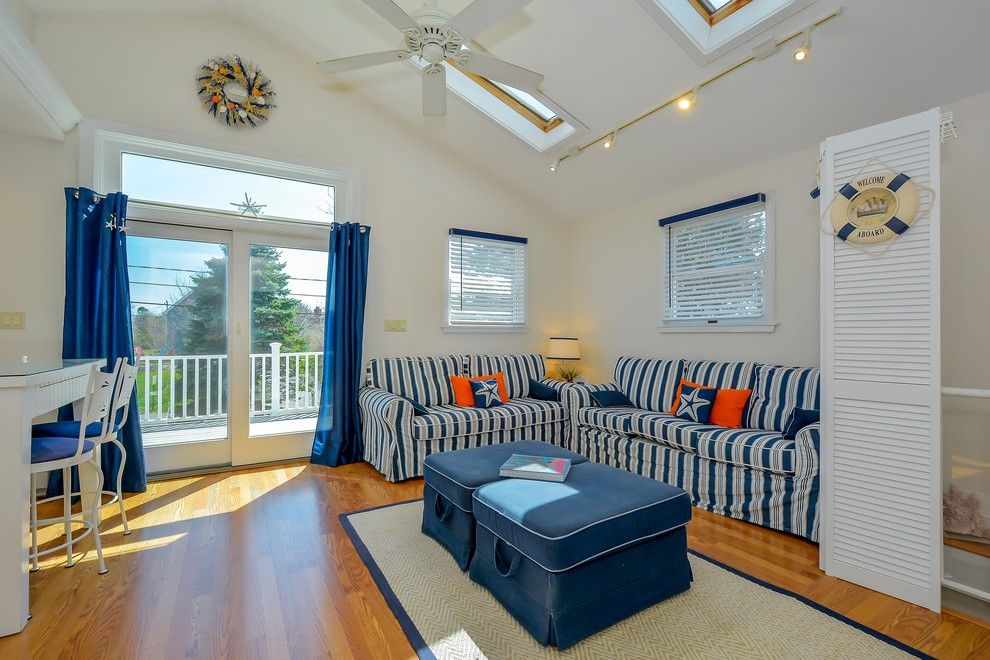This beautifully appointed five (plus) bedroom/ two bath home is presently one of the best values in the Montauk Real Estate Market. Located on a quiet street in the heart of Ditch Plains, just a minute from Ditch Plains beaches and surf. "Upside down" design with a delightfully sunny and open kitchen/living/dining area leading to a spacious south facing deck. The master bedroom, a guest room, and a sparkling full bathroom complete the upper