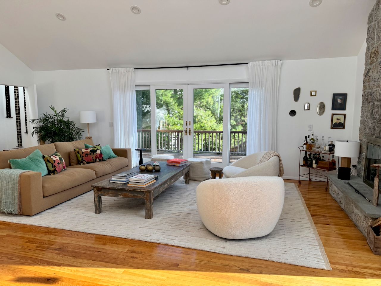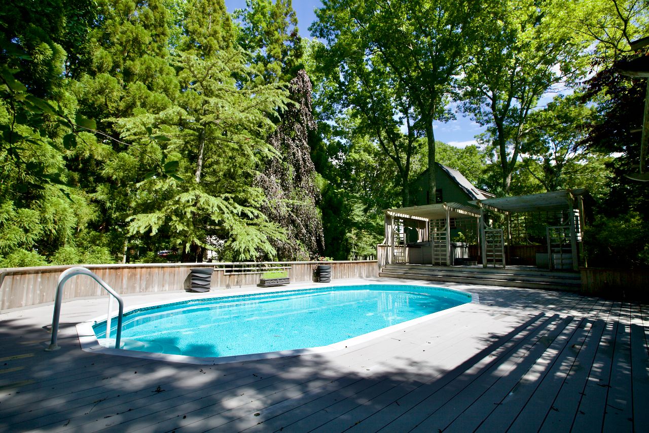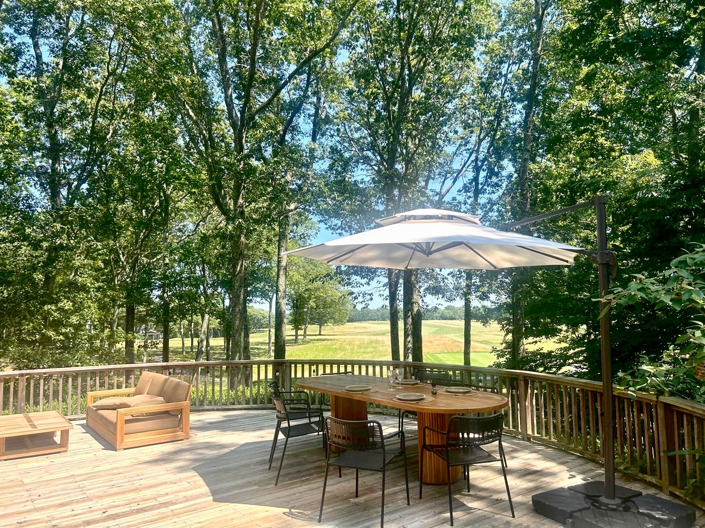 This lovely home is situated on almost and acre of land overlooking the fairways of Gardiner’s Bay Country Club. Four bedrooms, 3 full baths, 30’ x 15’ swimming pool, and expansive decks. A chef’s kitchen with stone countertops that opens to a large light filled dining and family room. The living room has a vaulted ceiling with a stone fireplace. The lower level has an ensuite bedroom and living space with private walk out. Close to public bea