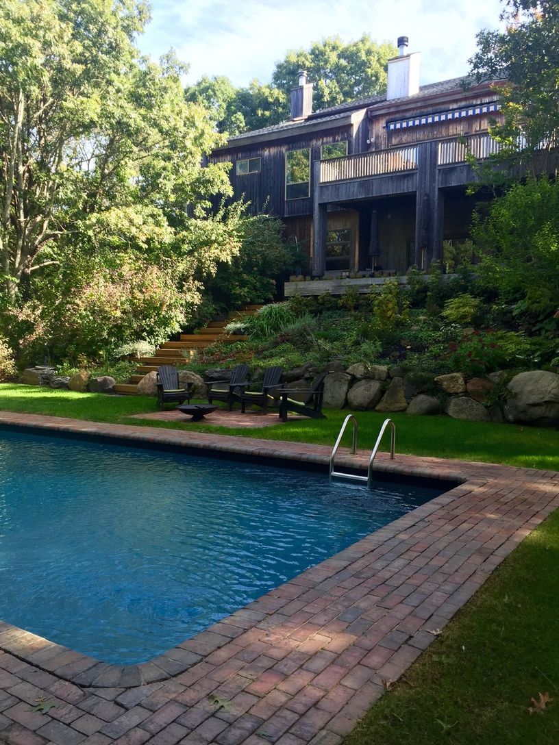 Enjoy this Modern home featuring four bedrooms and three full and one half baths on a secluded acre +/-. The first floor features heated concrete floors, mid-century style furnishings, in-ceiling speakers, large living room and dining room, gourmet eat-in kitchen, beautiful half bath, large pantry/laundry room and through double sliding doors an oversized deck with outdoor dining for eight overlooking the pool. Third floor loft features a mast