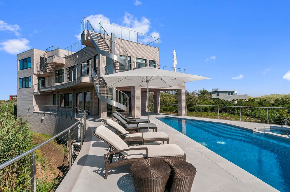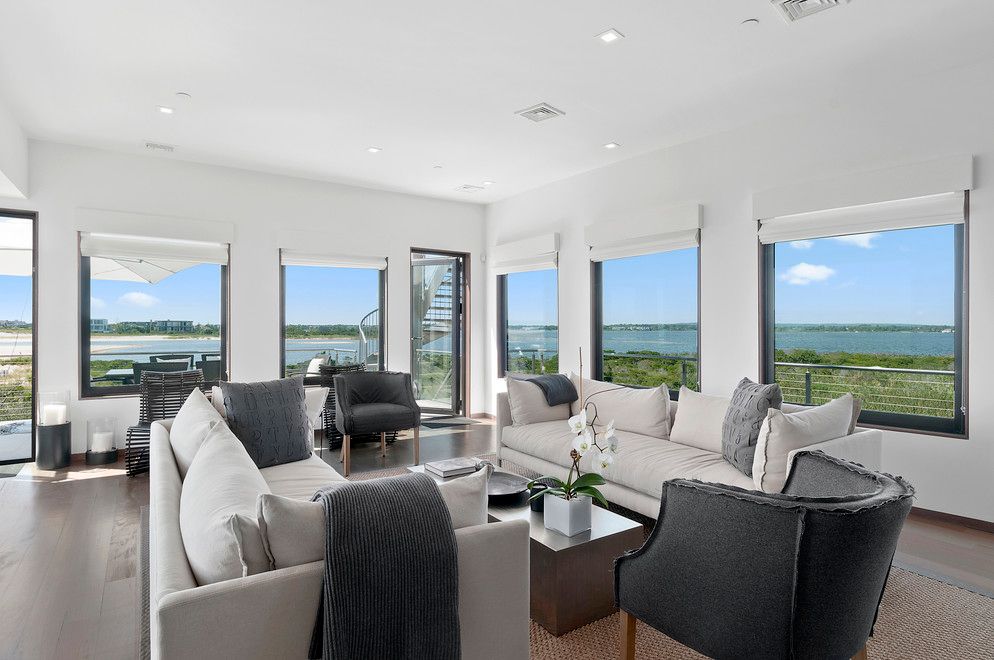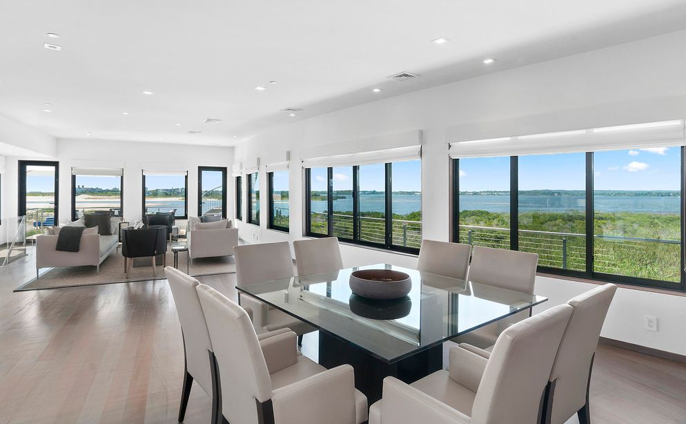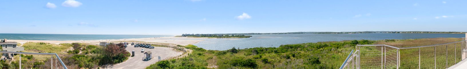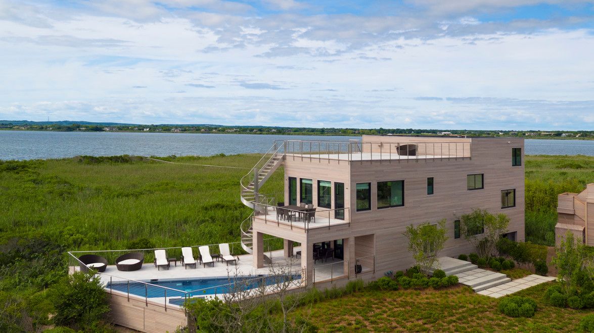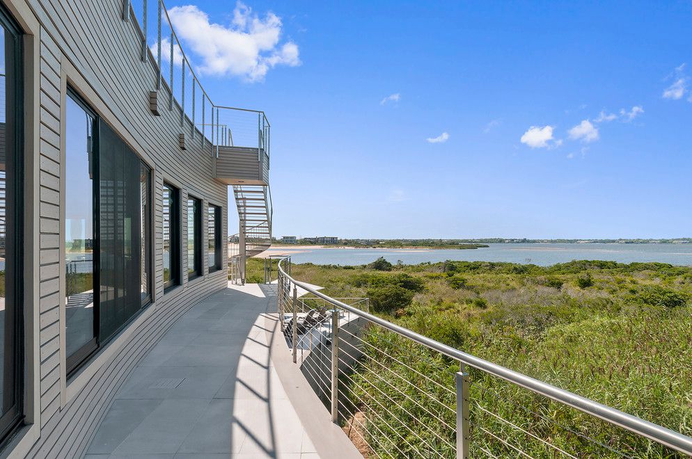At the end of Dune Road in Bridgehampton this smartly designed and finely crafted modern beach house is situated with the ocean on one side and the bay on the other. Designed to take maximum advantage of the breathtaking water views on both sides, its many large windows and multiple terraces capture spectacular sunrise and sunset vistas. A rooftop terrace presents 360-degree views over the water. Located on just shy of two bayfront acres. The