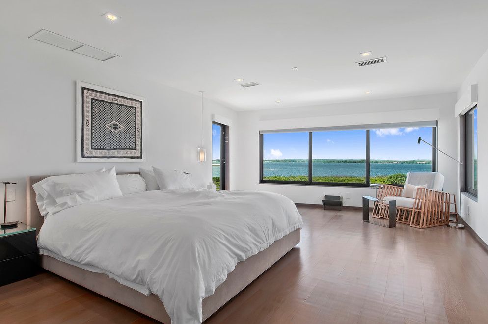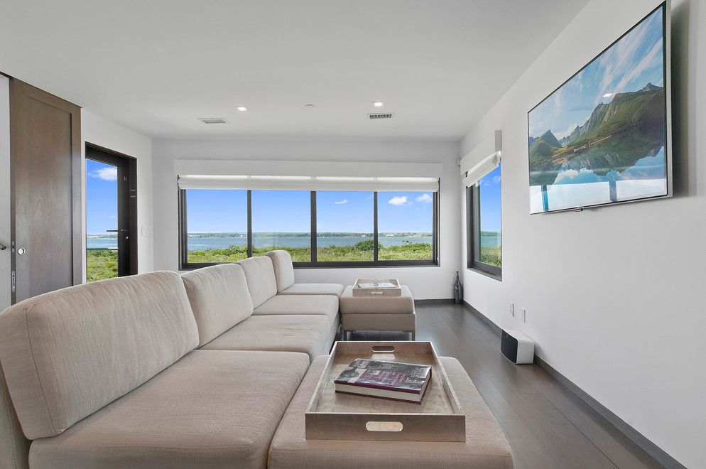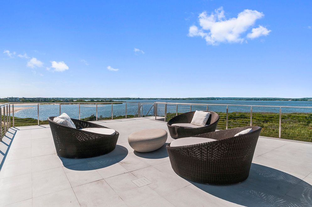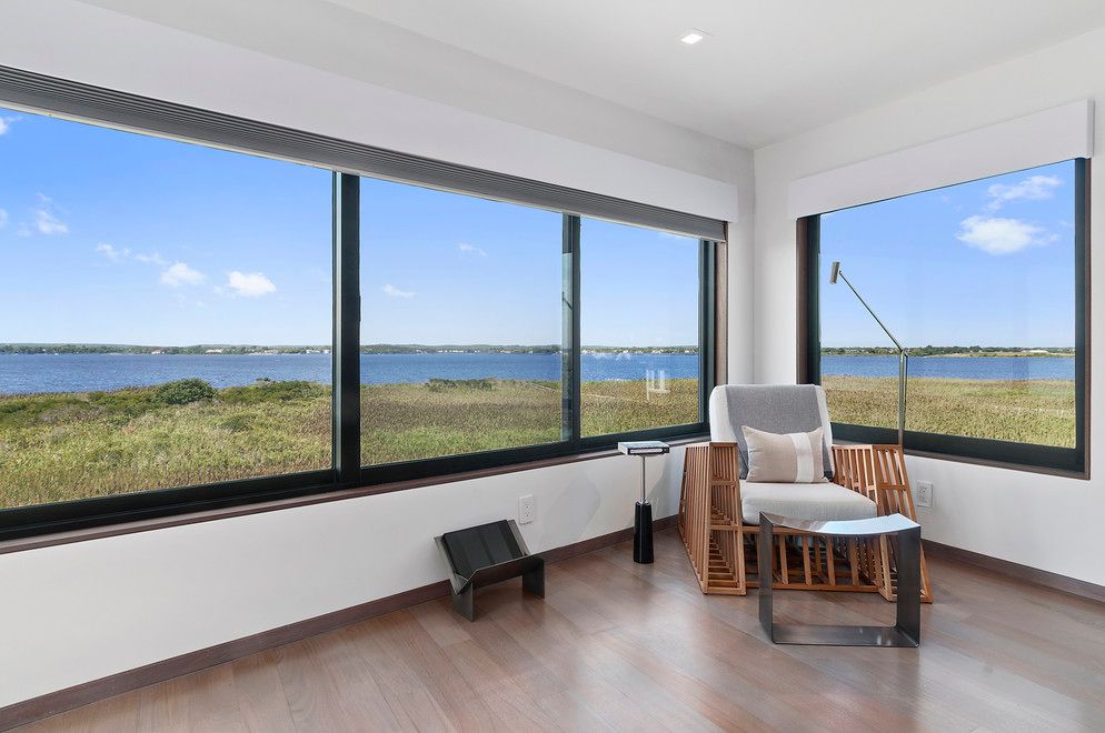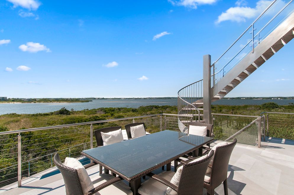 At the end of Dune Road in Bridgehampton this smartly designed and finely crafted modern beach house is situated with the ocean on one side and the bay on the other. Designed to take maximum advantage of the breathtaking water views on both sides, its many large windows and multiple terraces capture spectacular sunrise and sunset vistas. A rooftop terrace presents 360-degree views over the water. Located on just shy of two bayfront acres. The