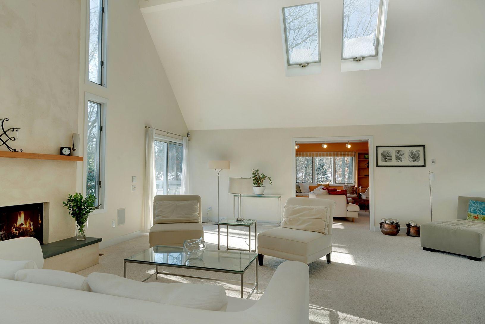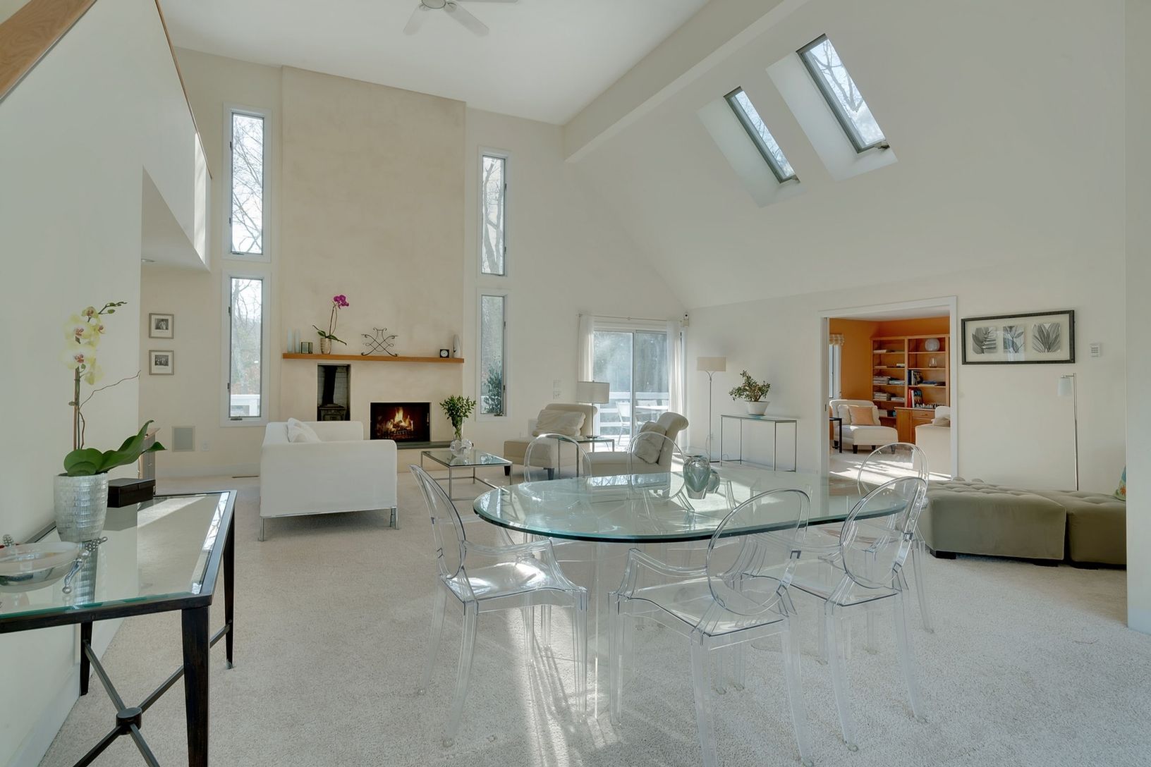 Modern Contemporary set high above the road. Immaculate, bright, light, open, airy, beautiful home in Water Mill. This wonderfully maintained 3,400 Sq Ft modern contemporary has 4 spacious Bedrooms, 4 Baths, a large open double height Living Room with skylights, windows everywhere and a wood burning fireplace. The entry floor also has a modern Kitchen, Master Bedroom and a large Den finished with light wood built-in shelving. Sliders open to