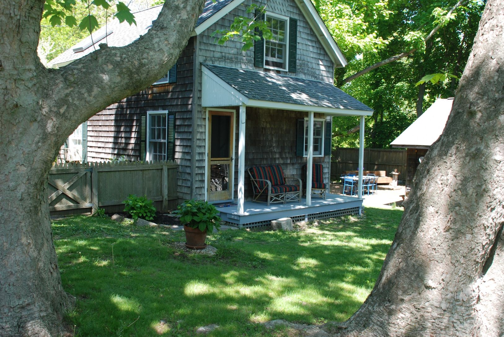 Charming shingled 19th C Farmhouse with 1100 sq ft barn/studio w/ electric heat, coal/wood burning stove, storage lofts, skylight. Cottage has wide plank floors in living room, eat-in-kitchen ,rear porch, 3 skylights. Beautiful brick courtyard & garden w/mature trees & flowering beds makes this an ideal property for working & entertaining. Walking distance to Greenport Village & public transportation.