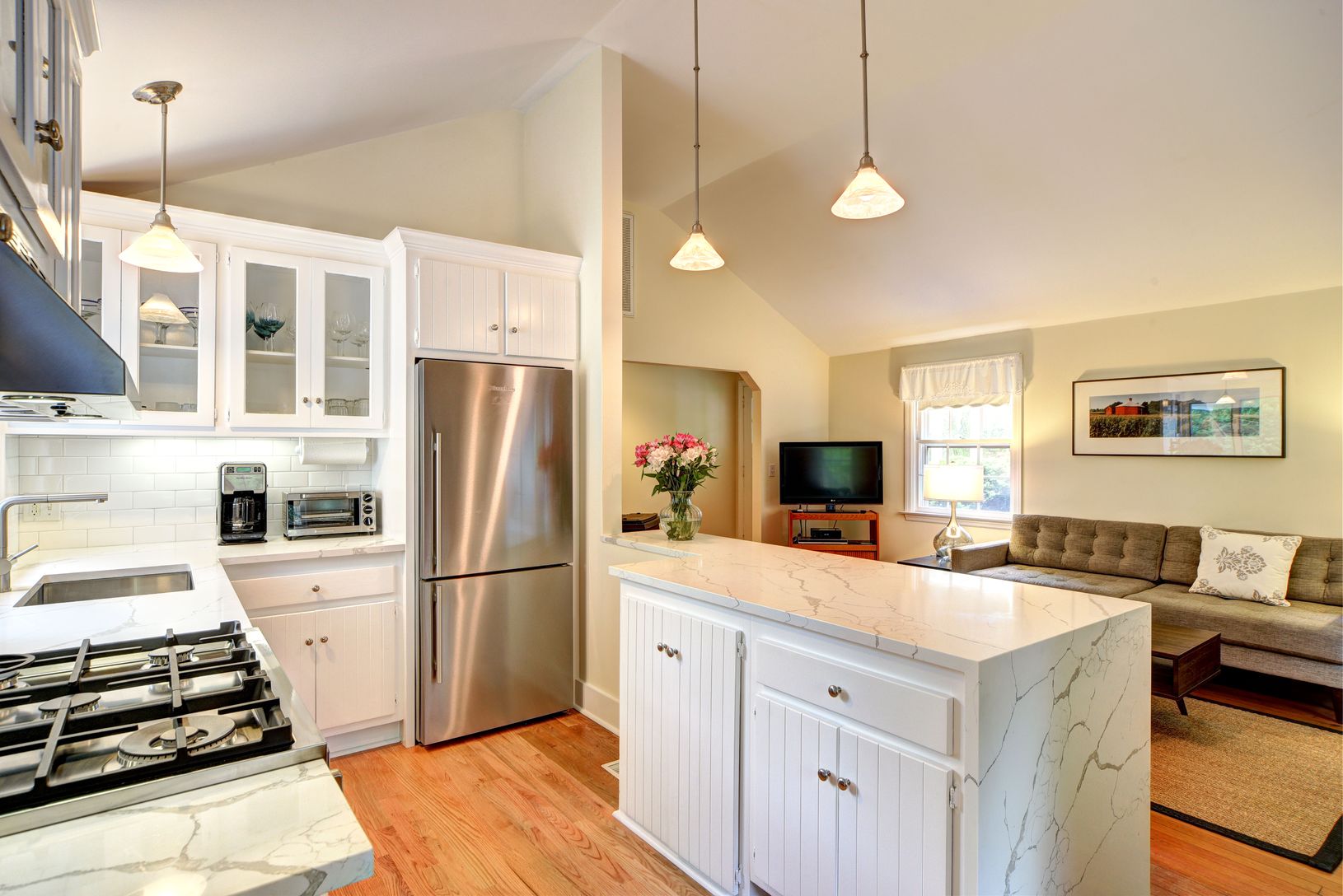 Luxuriously updated for Summer 2022, "The Vacationer" features two brand new, modern bathrooms with Grohe faucets, mid-century vanities, and marble tiling. The modern kitchen features a Bertazzoni dual fuel professional grade range, quartz countertops, custom designed bar stools, and all stainless steel appliances! Mid-century furnishings add comfort and style to the living room.