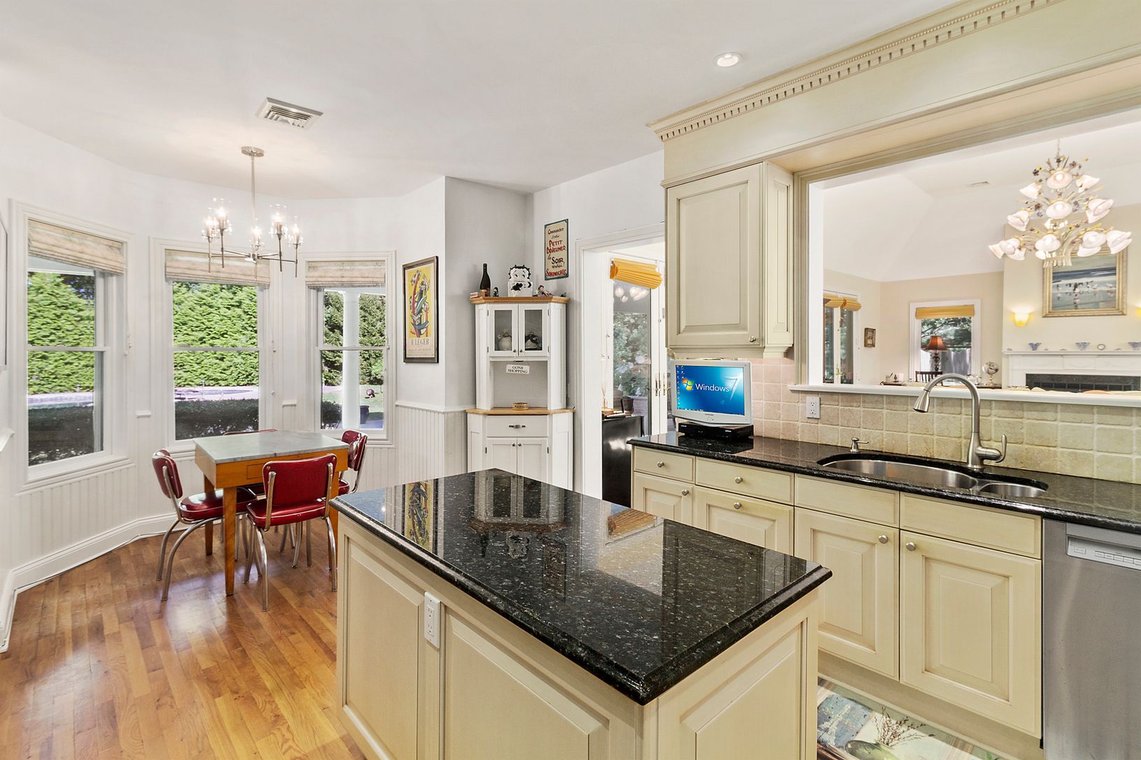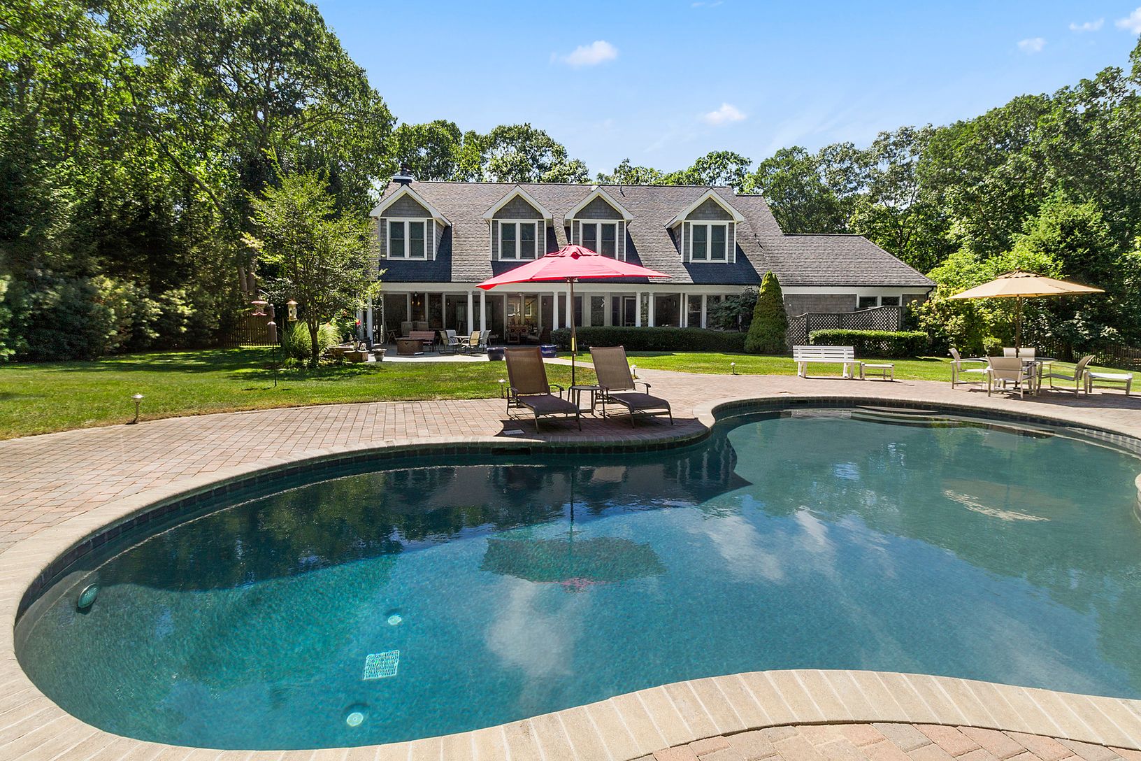 This Robert Stern home offers a relaxed beach vibe. 4 Bedrooms and 4 1/2 baths with master on first floor having a walk-in closet and abundance of closets throughout for ample storage. Great flow with high ceilings throughout and a gourmet kitchen with breakfast area. Large finished lower level with wine room, bathroom and large work room. The property is on 1.4 acres with a heated gunite free form pool and covered porch. Can't beat the locati