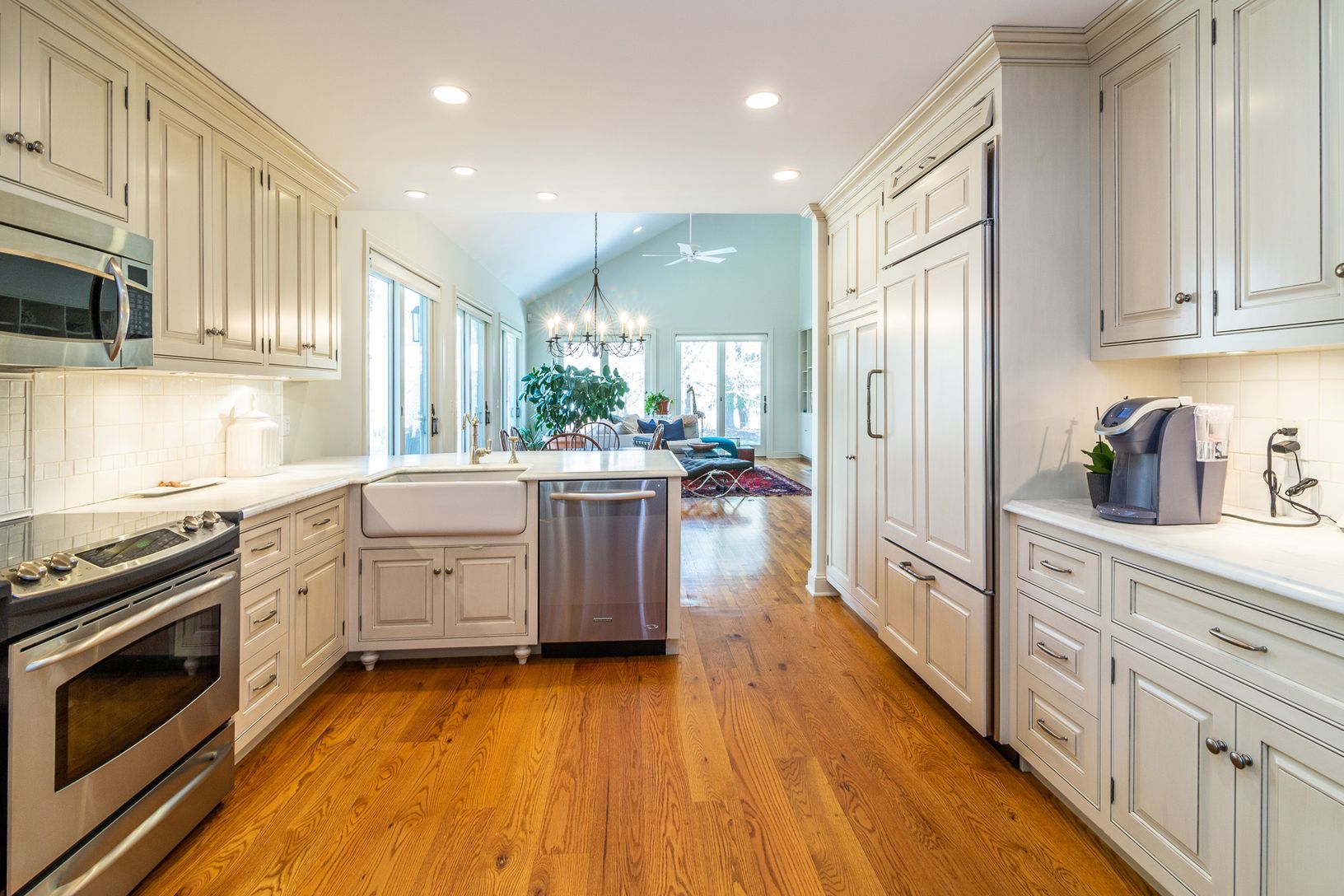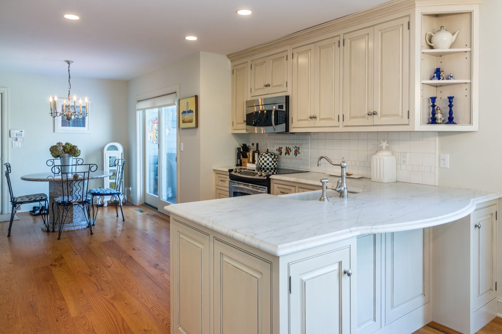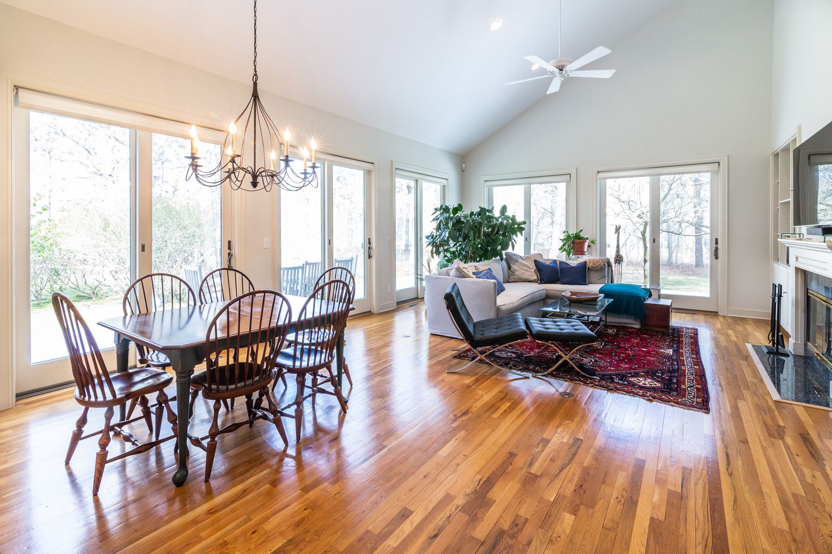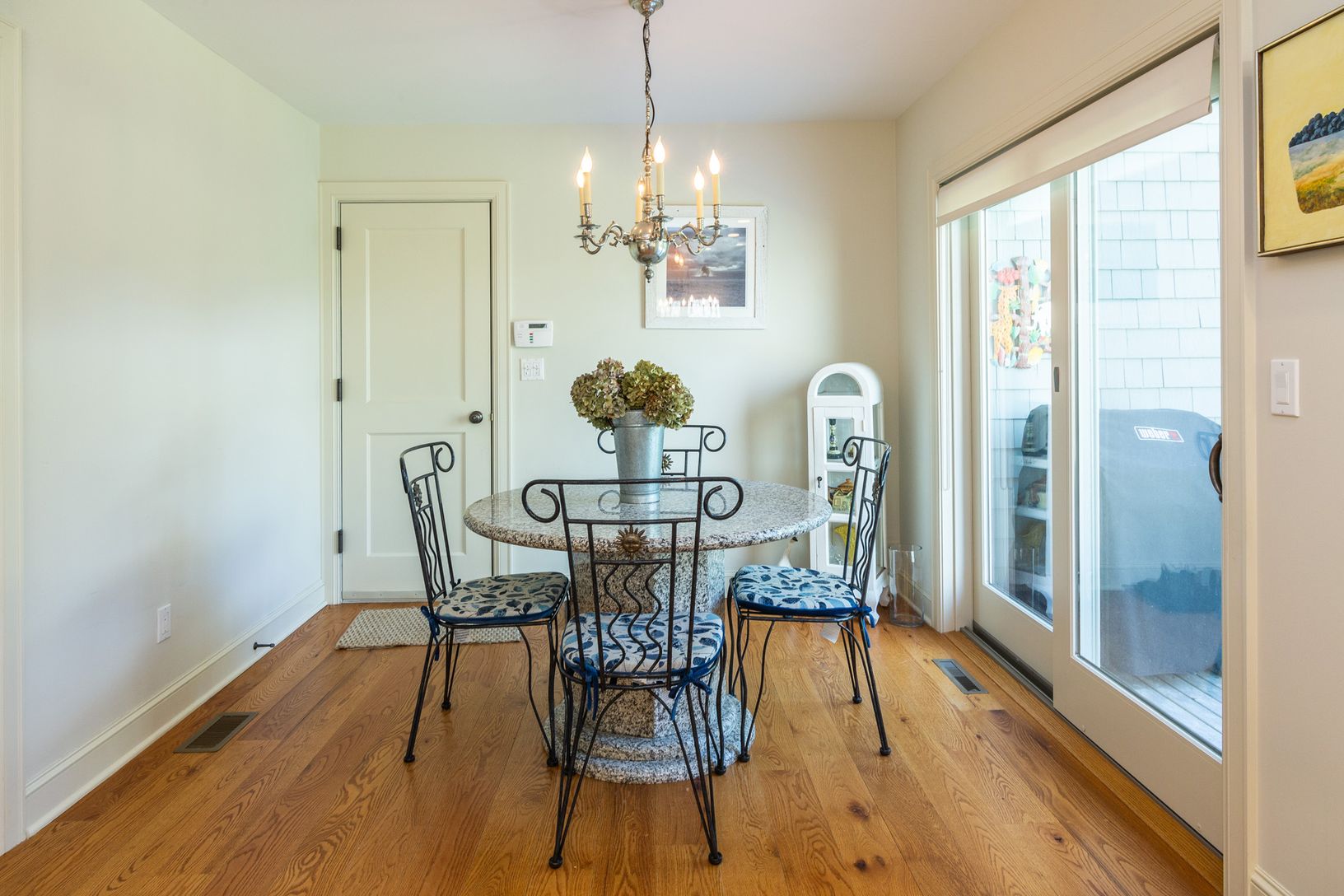 Bring a toothbrush and move right into this spacious four bed/three and a half bath home in Georgica Estates. Enter the home through a foyer which opens to bright living room with soaring ceilings, a dining area, and a fireplace. The living room opens to an inviting deck with outdoor seating and grill. The beautifully appointed white kitchen features an eat-in dining nook and breakfast bar. An attached garage, laundry room, and powder roo