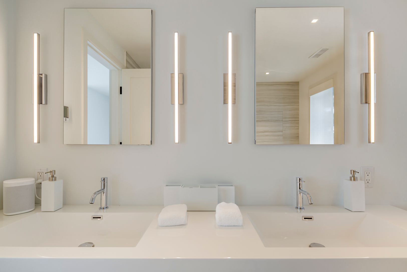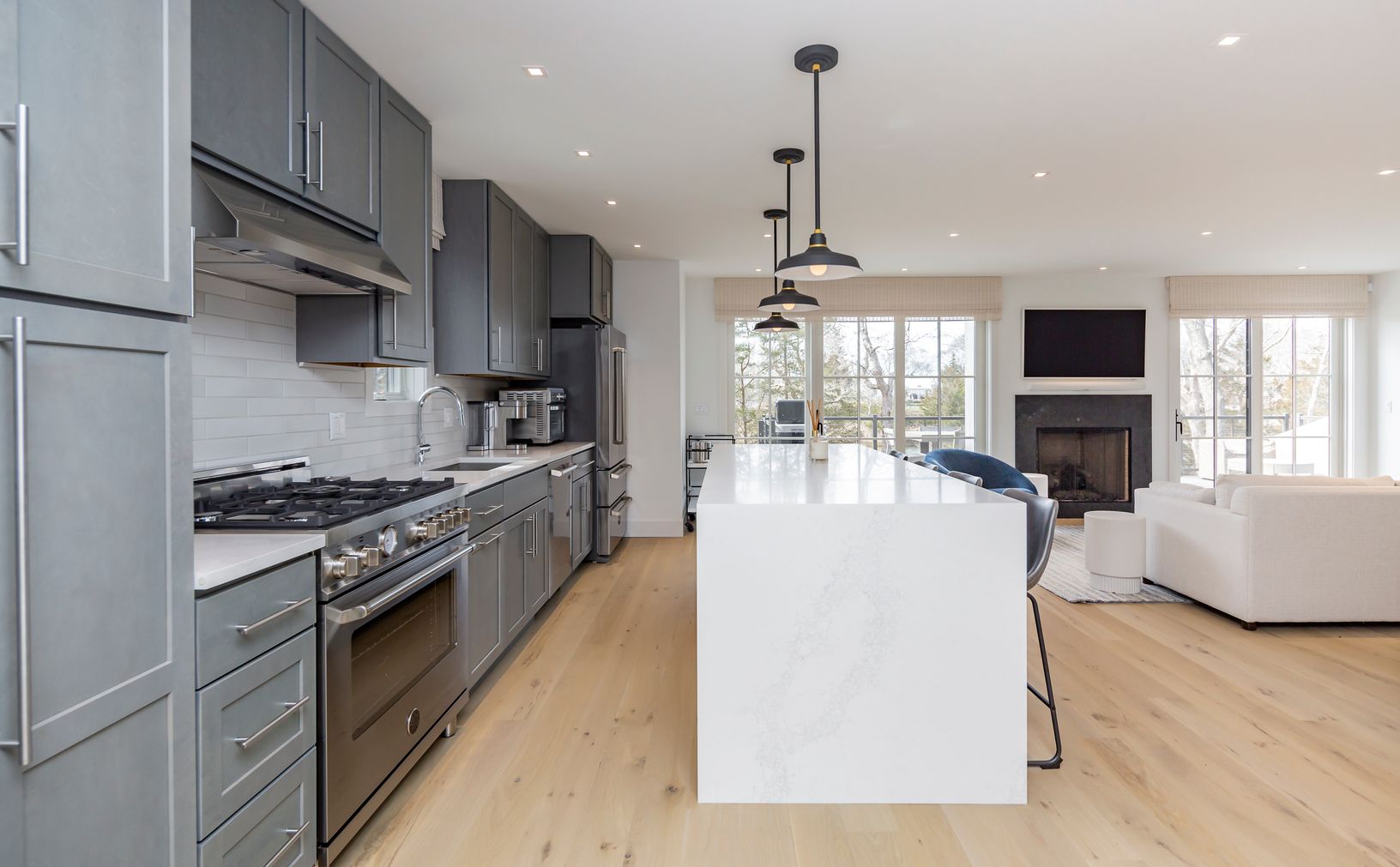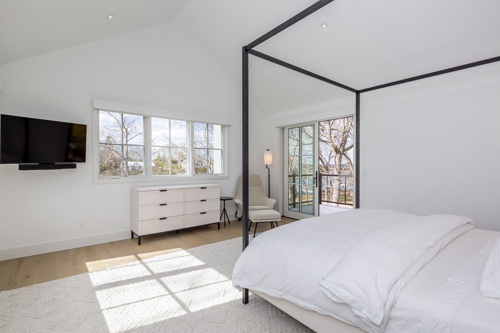 Exquisite modern waterfront home in a quiet Sag Harbor community features water views from every floor and a private dock for the ultimate Hamptons experience. Newly constructed with a palette of calming, neutral tones, the home is bright and stylish, exuding beach resort ease. On the first floor, the open plan features a chef's kitchen with Bertazzoni appliances, living and dining area with gas fireplace, all opening to a large mahogany deck