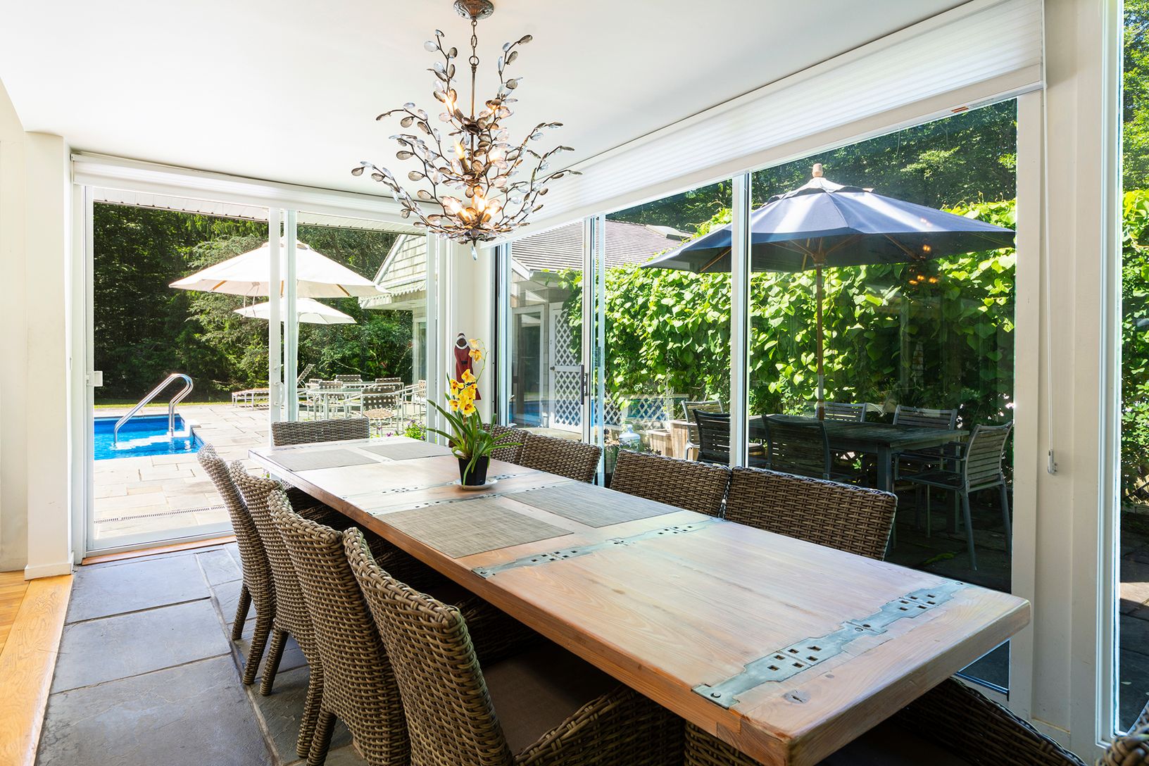 RR# 20-1472. Enjoy two acres of living in a magnificent setting, Specimen trees, Flower Gardens surrounding Heated Salt Water Pool, Pool House and Outside Dining. Open First Floor Living, Brick Wood Burning Fireplace, Vaulted Ceiling, Skylights and walls of glass Stepping out to Salt Water Pool and Patio with Outdoor Furniture. Formal Dining area, Fully Equipped Eat-in Kitchen with Stainless Steel Appliances, Granite top Island with Second Sin