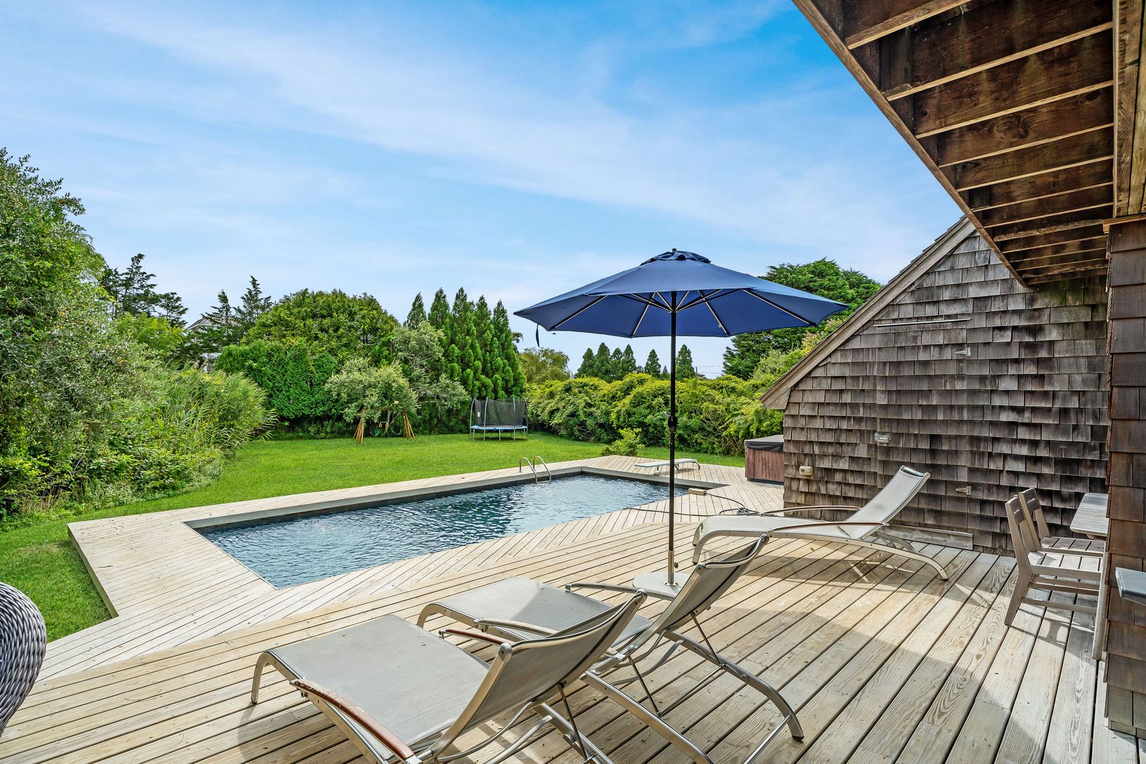 Pointe Mecox Lane, Bridgehampton South available SHORT-TERM 2 WEEKS AUGUST on a private cut-de-sac in a perfect Bridgehampton location. Four bedroom modern beach house on 1 acre on a quiet non-thru street. The open floor plan offers beautiful southern exposure throughout most every room. The living room has soaring ceilings and walls of glass that open out to an expansive deck and back marble dust pool and hot tub. There is a crisp white u