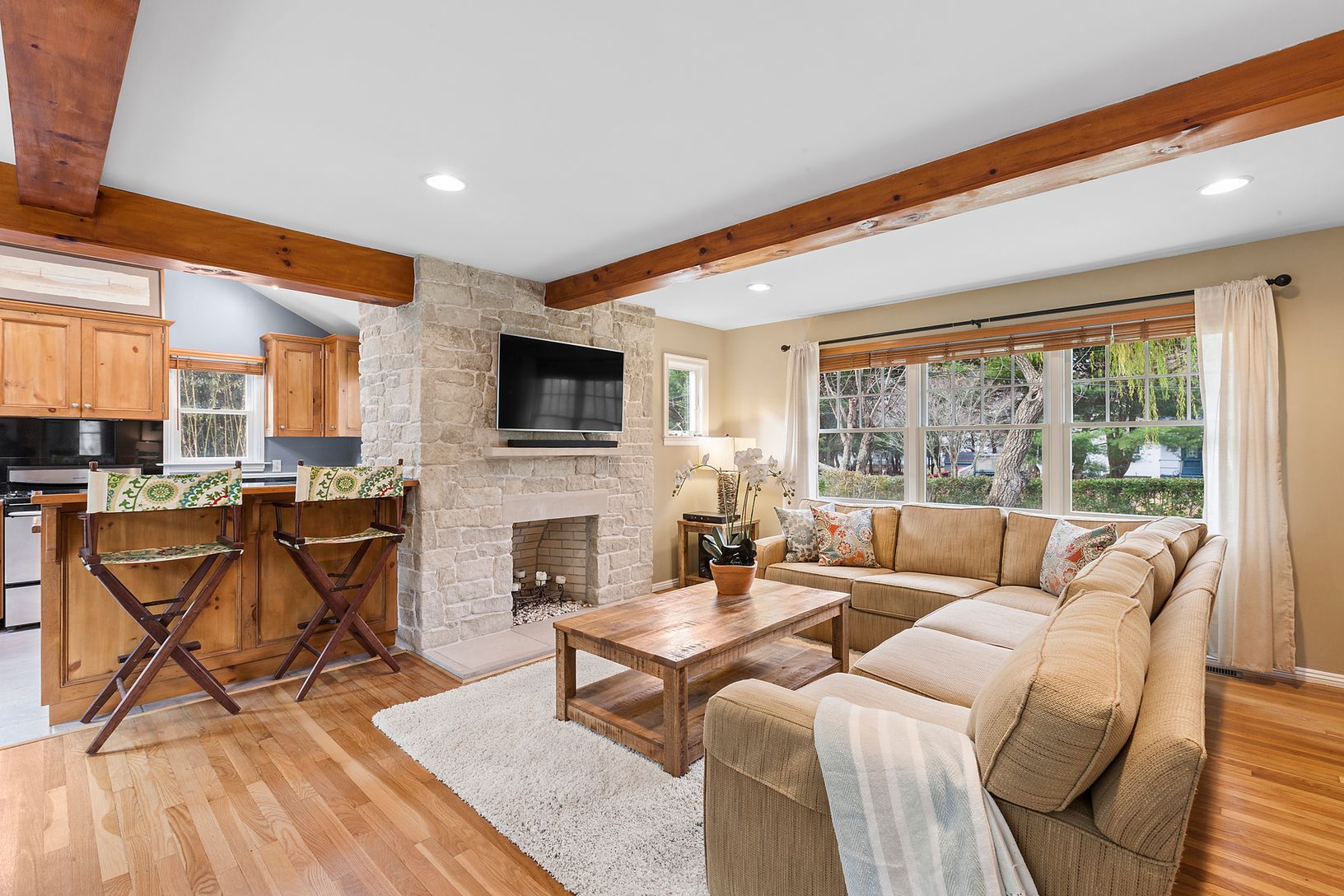 Beautifully renovated Cape conveniently located in North Haven. Featuring 3 spacious bedrooms, 3 baths and a new heated salt water pool with electric safety cover. The sun filled first floor offers an open layout with custom kitchen with vaulted ceiling, skylights and breakfast bar, stylish living room with newly finished wood flooring, rustic beams and wood burning fireplace, bright dining area, powder room, plus a generous first floor mast