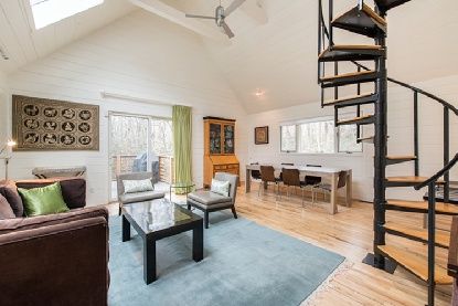 Completely renovated in 2010 with top-of-the-line amenities, and all new Italian Kitchen. Features large loft-like entertaining spaces flowing seamlessly through walls of glass, to expansive covered decks. The twenty-five foot kitchen is open and perfect for entertaining. The kitchen adjoins expansive dining and living areas. There are four en-suite bedrooms and three and one-half baths in the main house. The separate guest cottage features