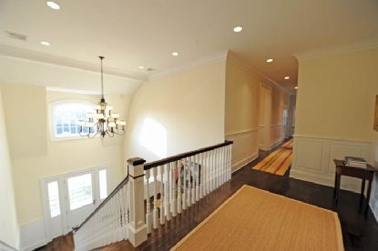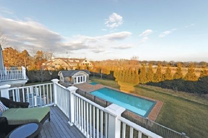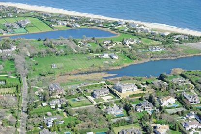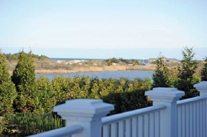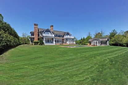 Custom construction in the estate section with Halsey Neck Pond and ocean views, this 6-bed, 9-bath, 8500 s.f. gambrel-style home is built using the highest quality upgrades and finishes. The entry hall with wide oak floors and powder room opens to living and family rooms, both with fireplaces, clerestory windows, and French doors opening to patio and deck. An adjoining chef's kitchen with marble counters is equipped with top appliances, eat-i