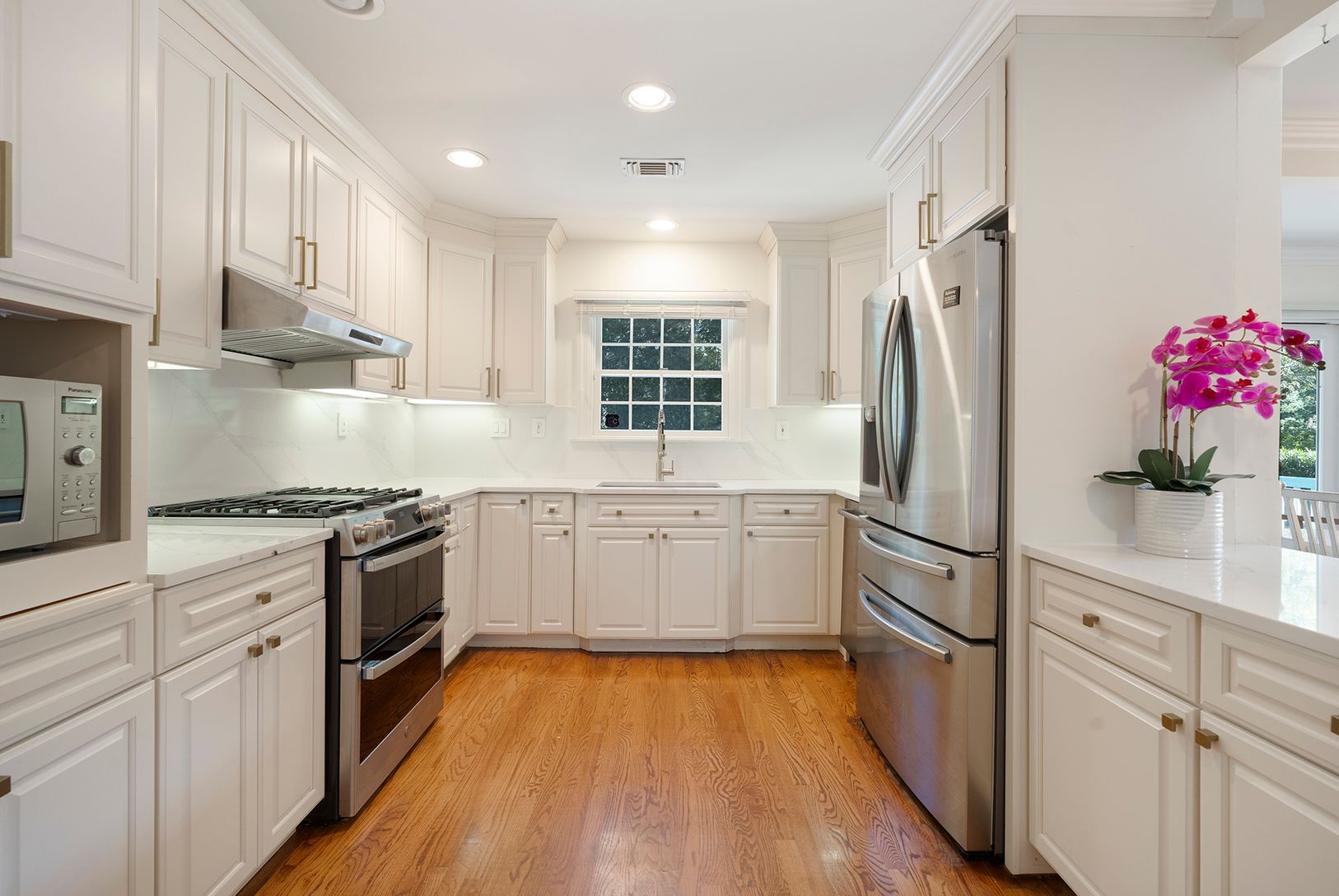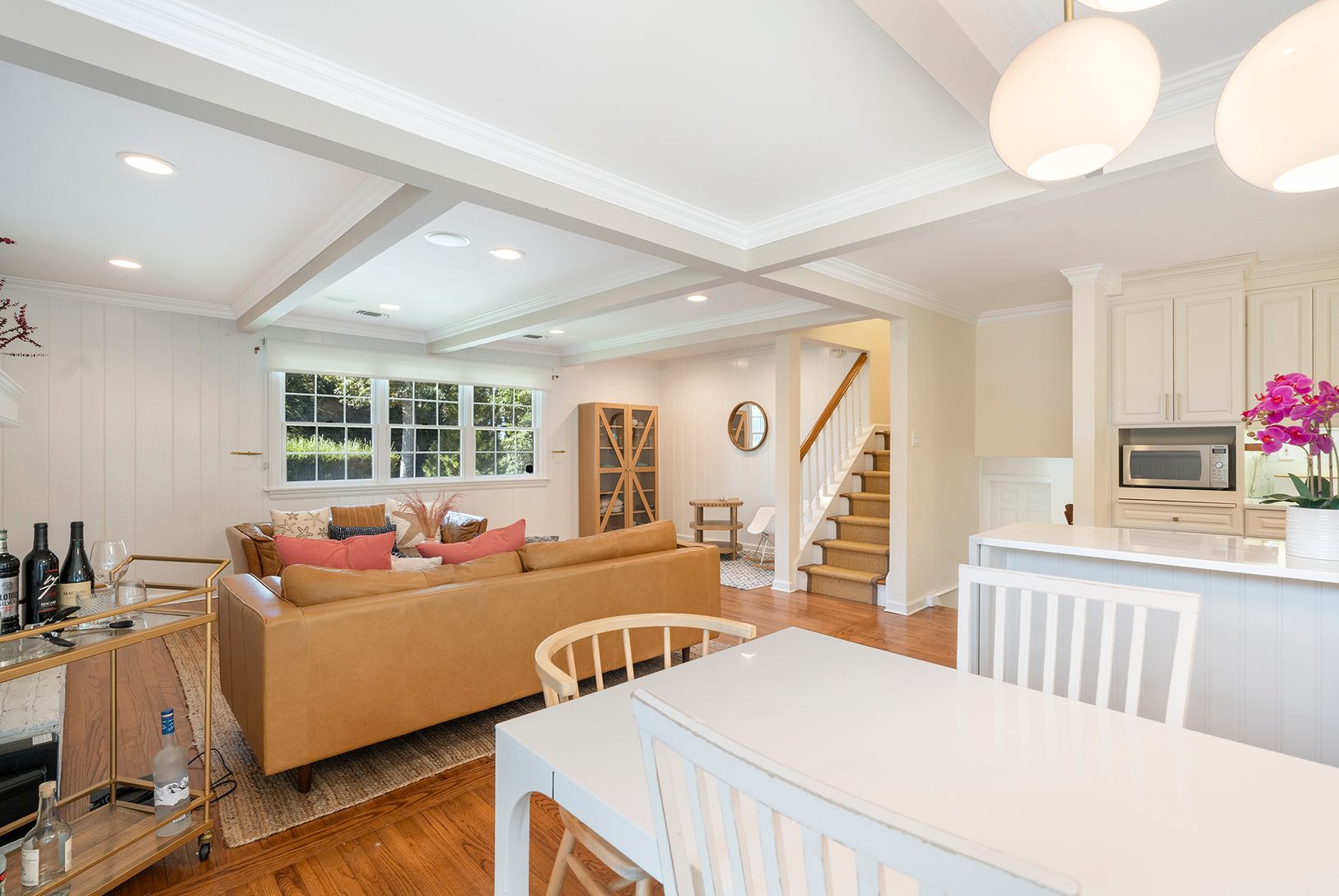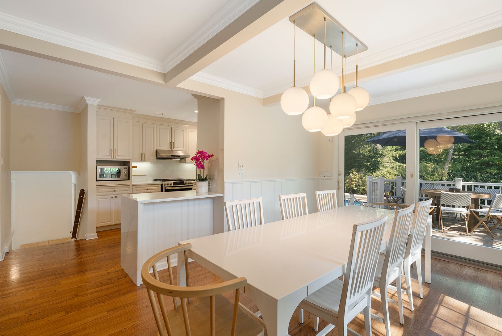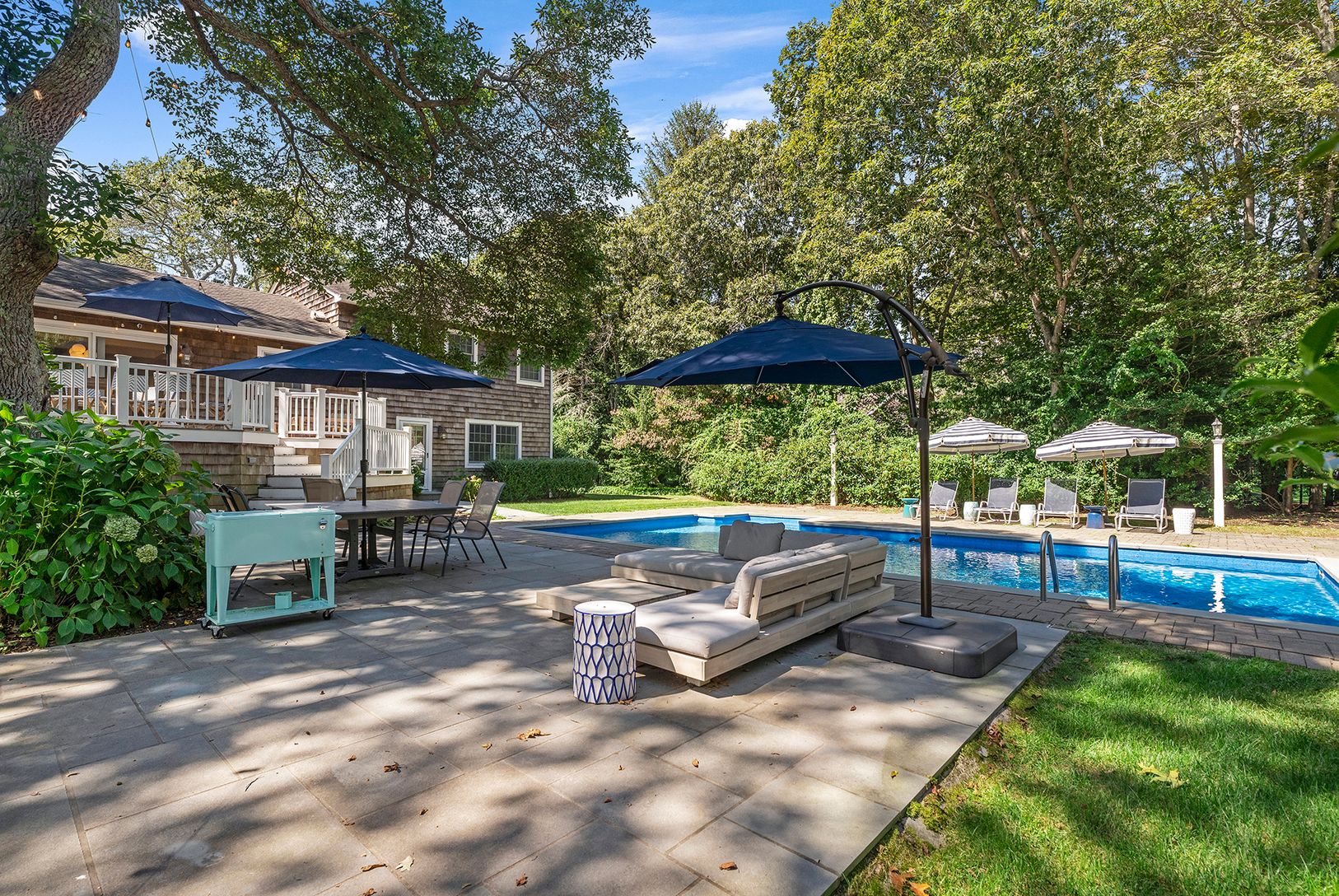 This recently renovated 4 bedroom, 3.5 bath Quogue Village home is filled with light and offers a stunning backyard with an expansive lawn, mature landscaping, heated pool and stone patio. Enter through the welcoming foyer and a primary suite with spa bath and powder room, awaits on the first floor. The main level includes a cozy living room with fireplace, dining area, and well-equipped kitchen. Off the dining room is the outdoor deck for din