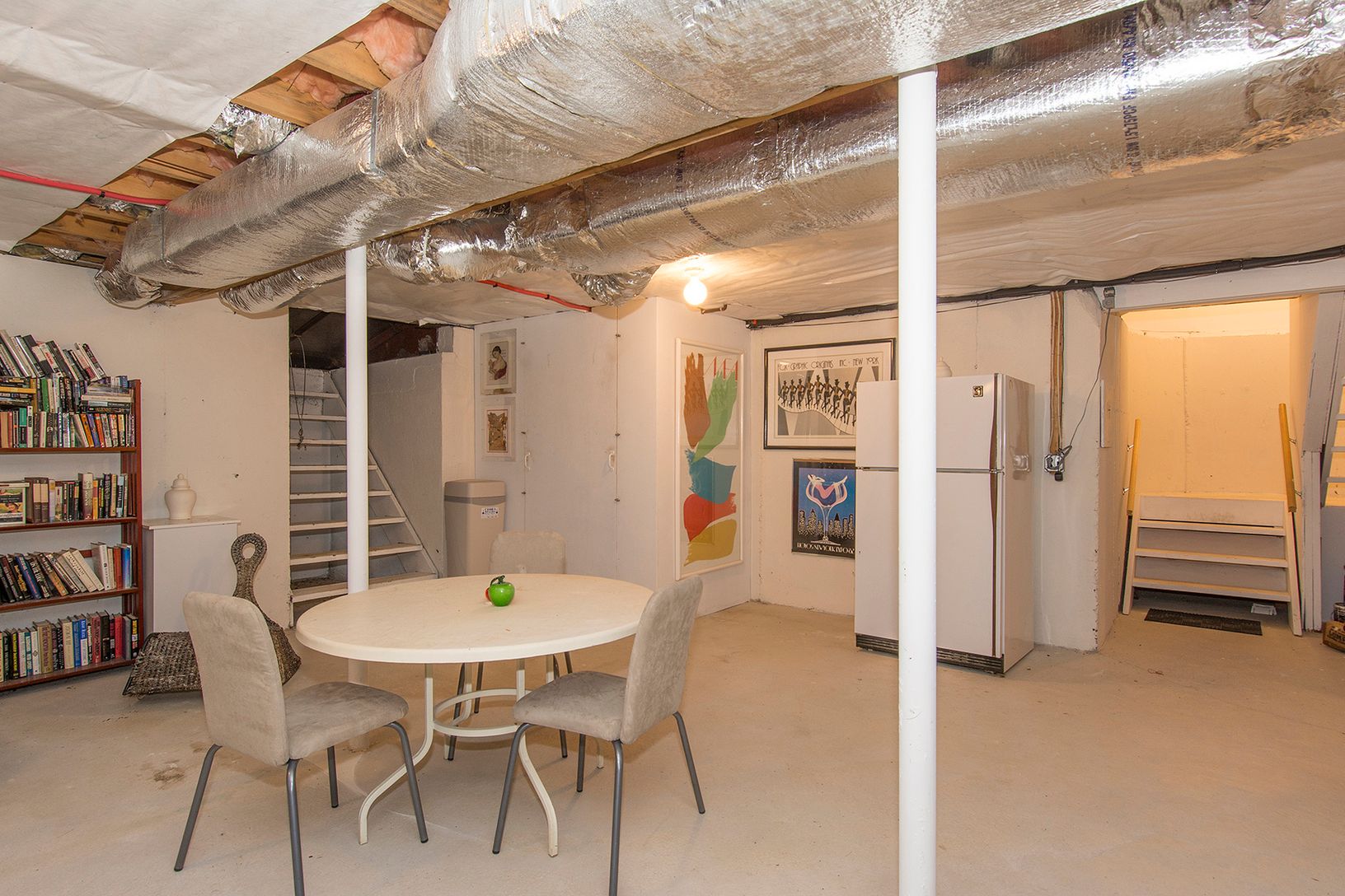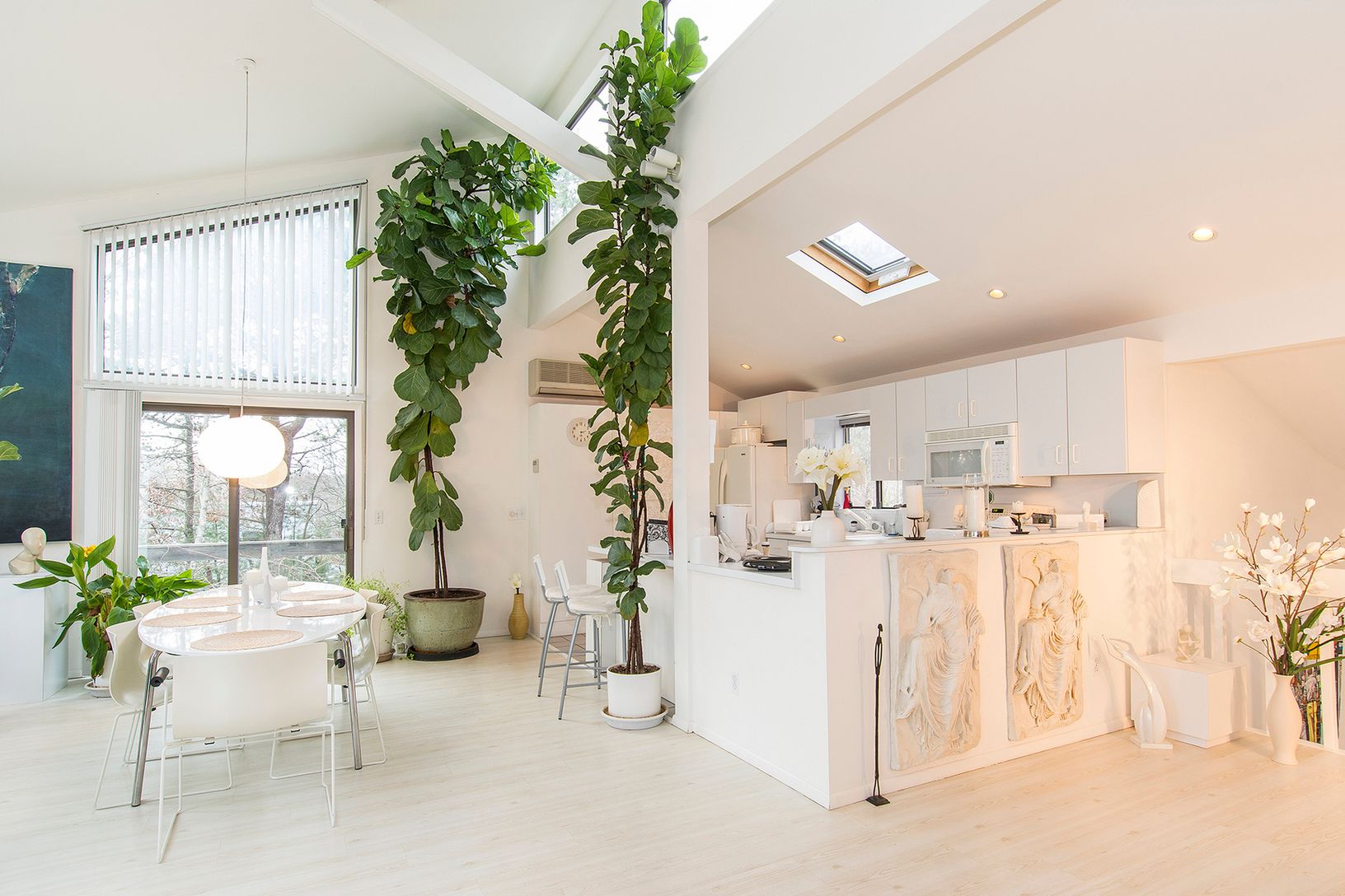 The upstairs boasts a south facing open bright and airy living space with kitchen and dining area. The large windows, skylights and sliding doors bring ample light into the whole space all year round. Relax by the fireplac