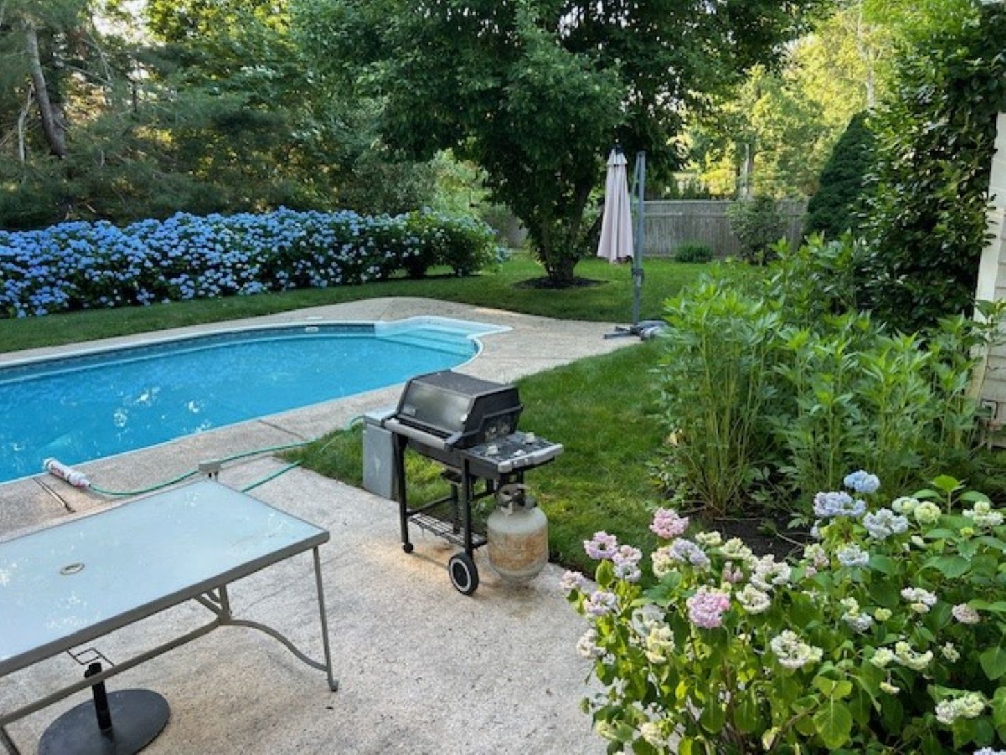 Beautifully renovated, Traditional features three bedrooms and two baths. The layout includes an open living and dining room leading to a brick patio and a heated pool in a nicely landscaped backyard. This house is just the right size for an easy-going summer and includes a first-floor primary master and two bedrooms upstairs with a beautiful large bathroom and a fully stocked reading loft. Located in an attractive and highly sought-after l