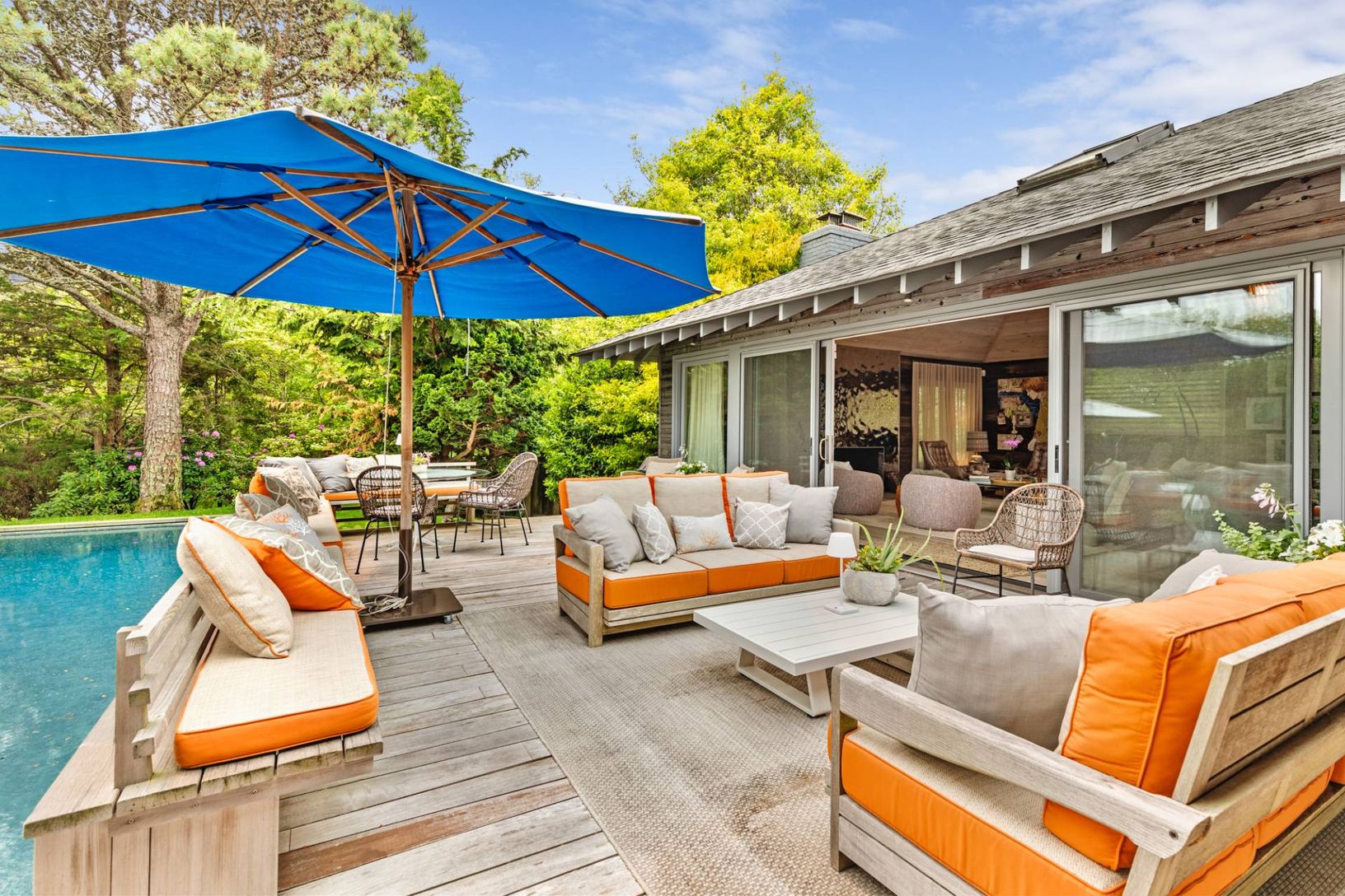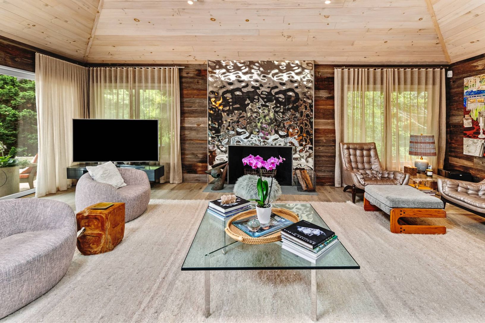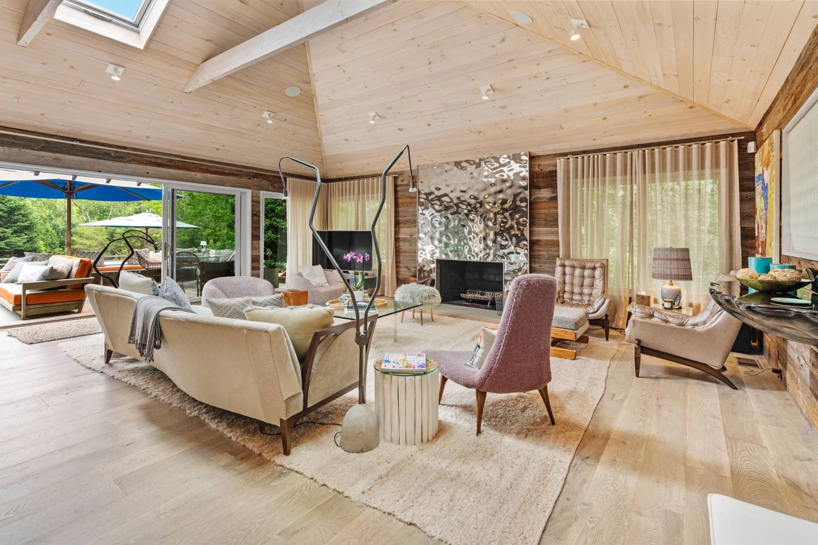 Tucked away on a private lane south of Further Lane, this chic oceanfront retreat offers direct access to a stunning Atlantic beach. Designed by AD100 architect Joe Nahem, this mid-century-inspired home is set on nearly an acre of meticulously landscaped grounds. The four-bedroom, five-and-a-half-bath sanctuary blends sophistication and comfort, featuring a state-of-the-art kitchen, soaring wood-clad ceilings, and curated modern and vintage fu