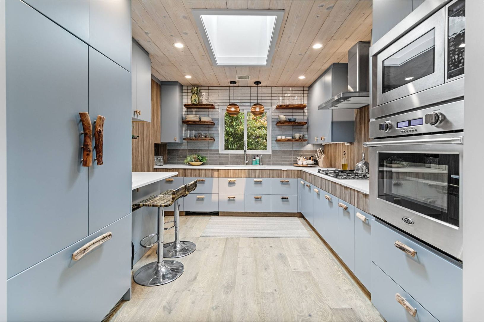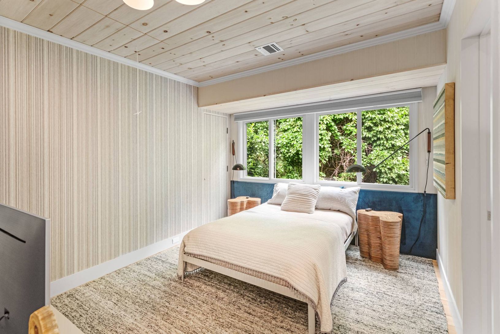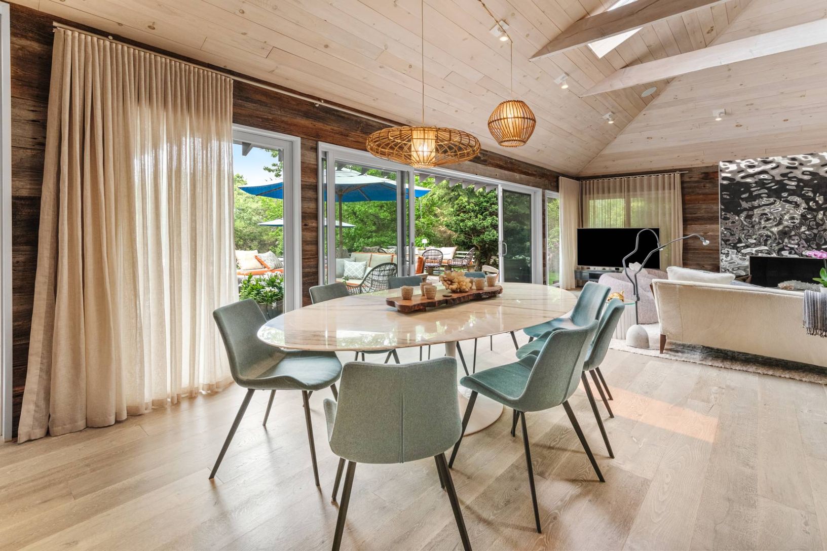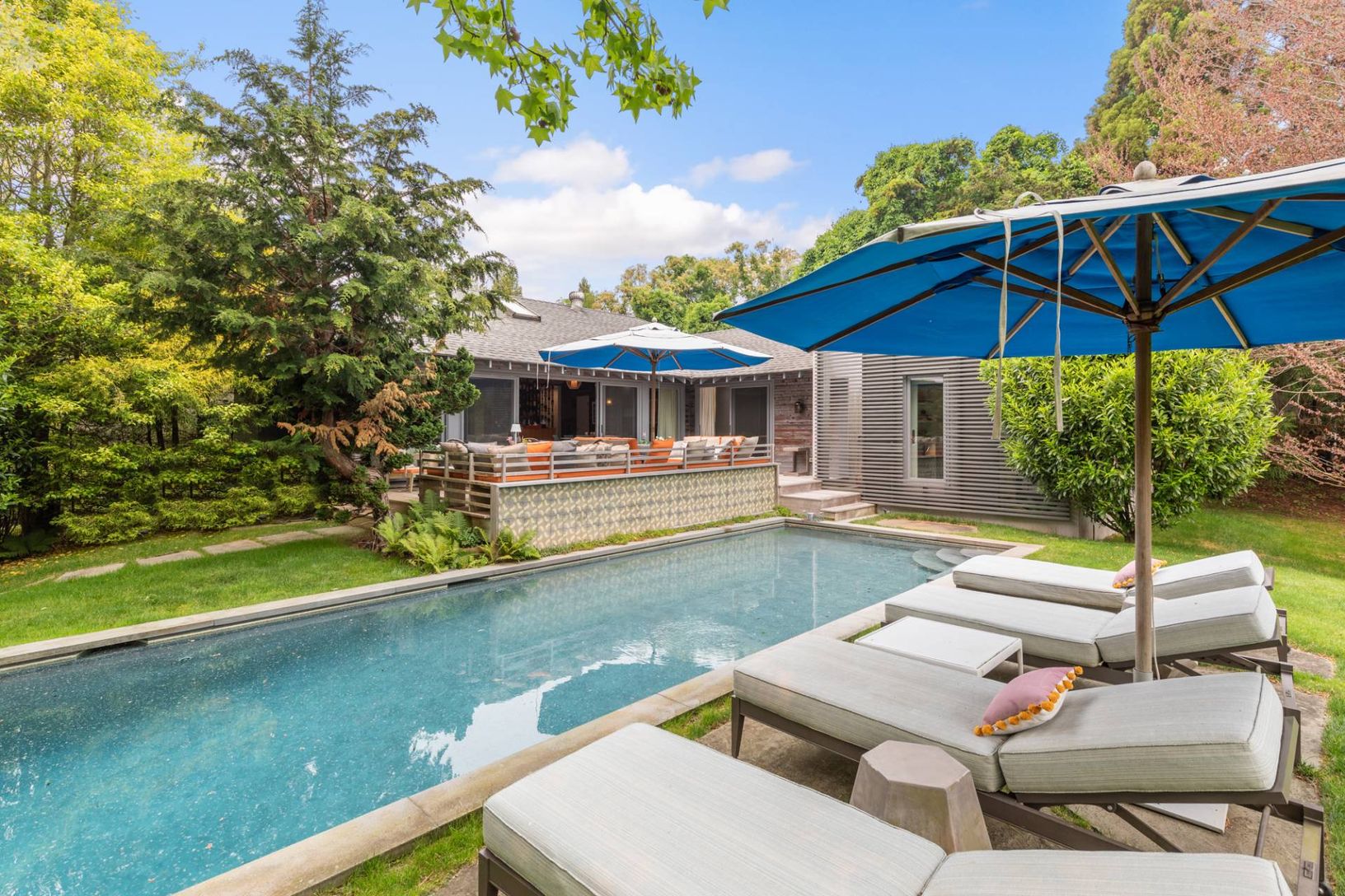 Tucked away on a private lane south of Further Lane, this chic oceanfront retreat offers direct access to a stunning Atlantic beach. Designed by AD100 architect Joe Nahem, this mid-century-inspired home is set on nearly an acre of meticulously landscaped grounds. The four-bedroom, five-and-a-half-bath sanctuary blends sophistication and comfort, featuring a state-of-the-art kitchen, soaring wood-clad ceilings, and curated modern and vintage fu