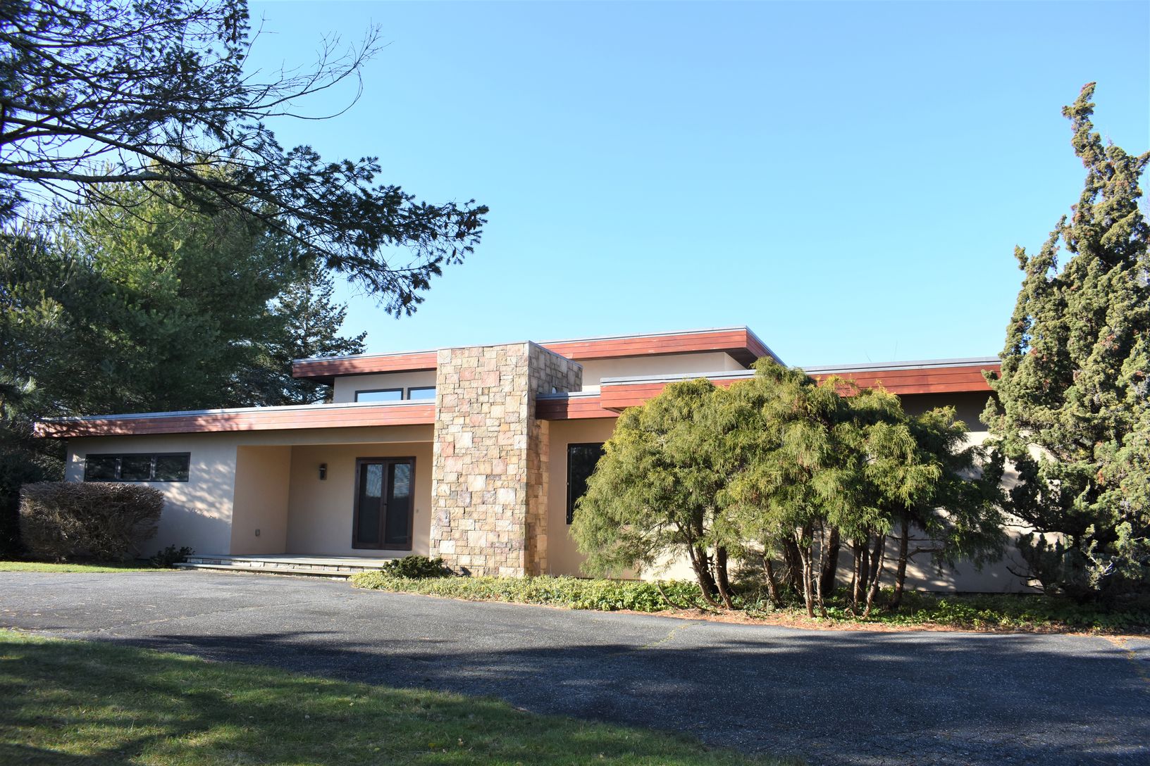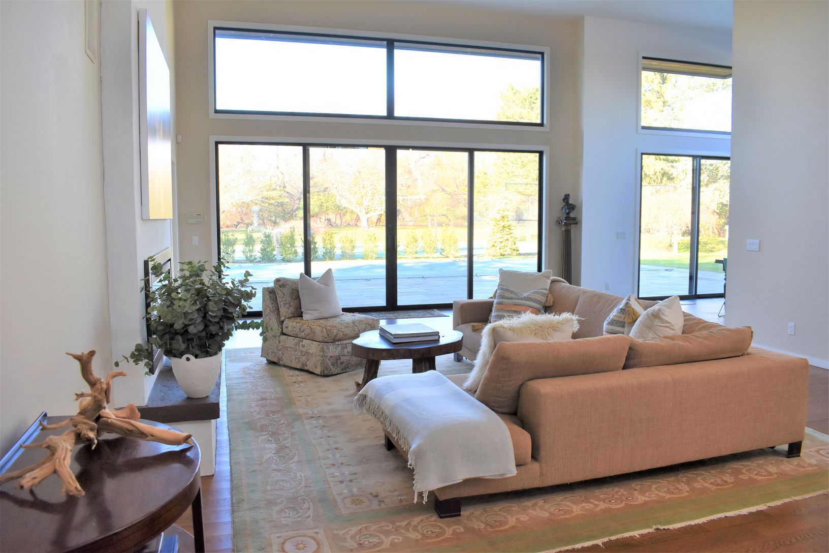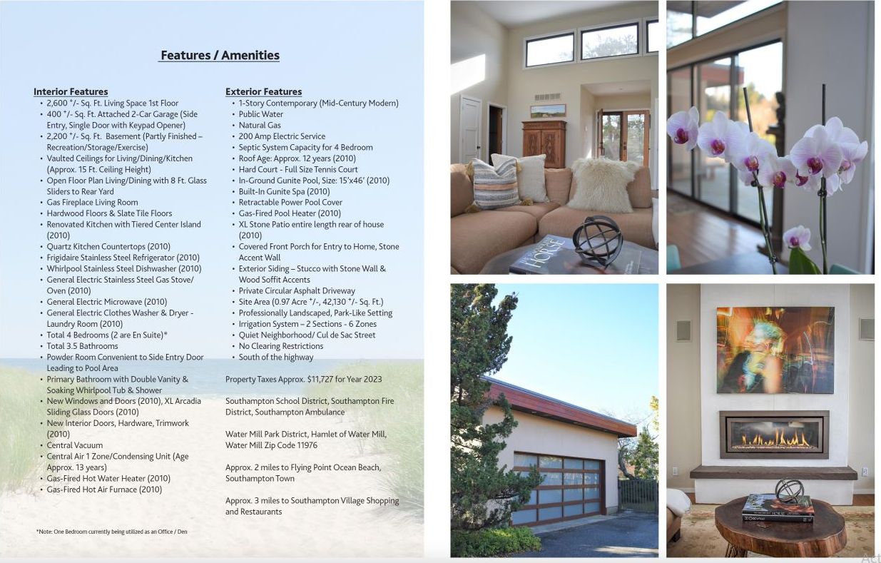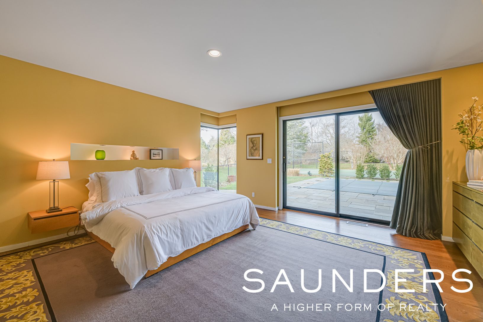 Welcome ... this Midcentury-Modern style home can now be yours. Renovated in 2010, the residence sits on a deep .97 acre lot in a desirable south of the highway location. The power of the interior space, which features 4 bedrooms and 3.5 baths, is intensified by soaring 15-foot ceilings in the living room and dining area that are enhanced by huge sliding glass doors (and 4-foot-high transom windows) that recall the indoor-outdoor relationship