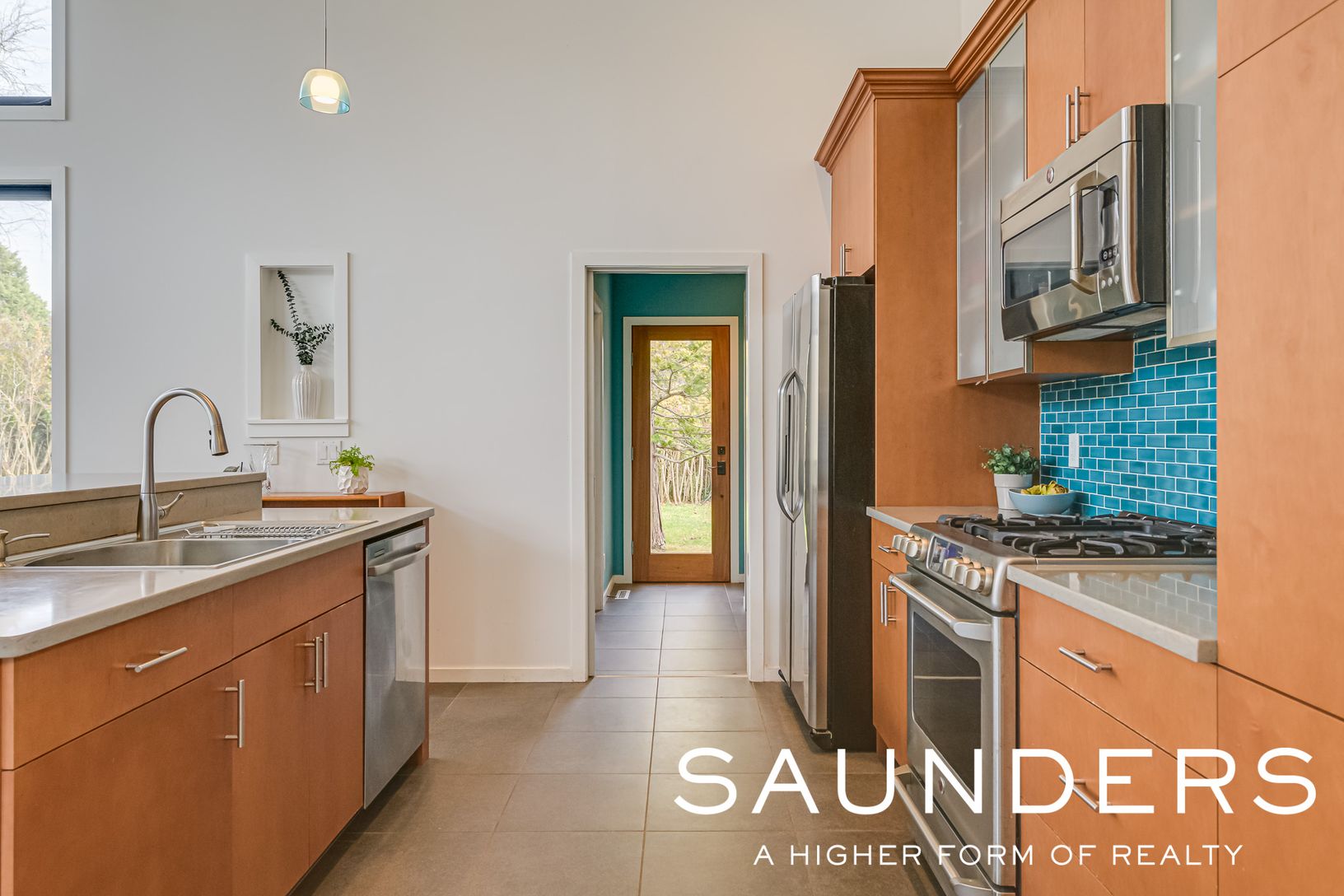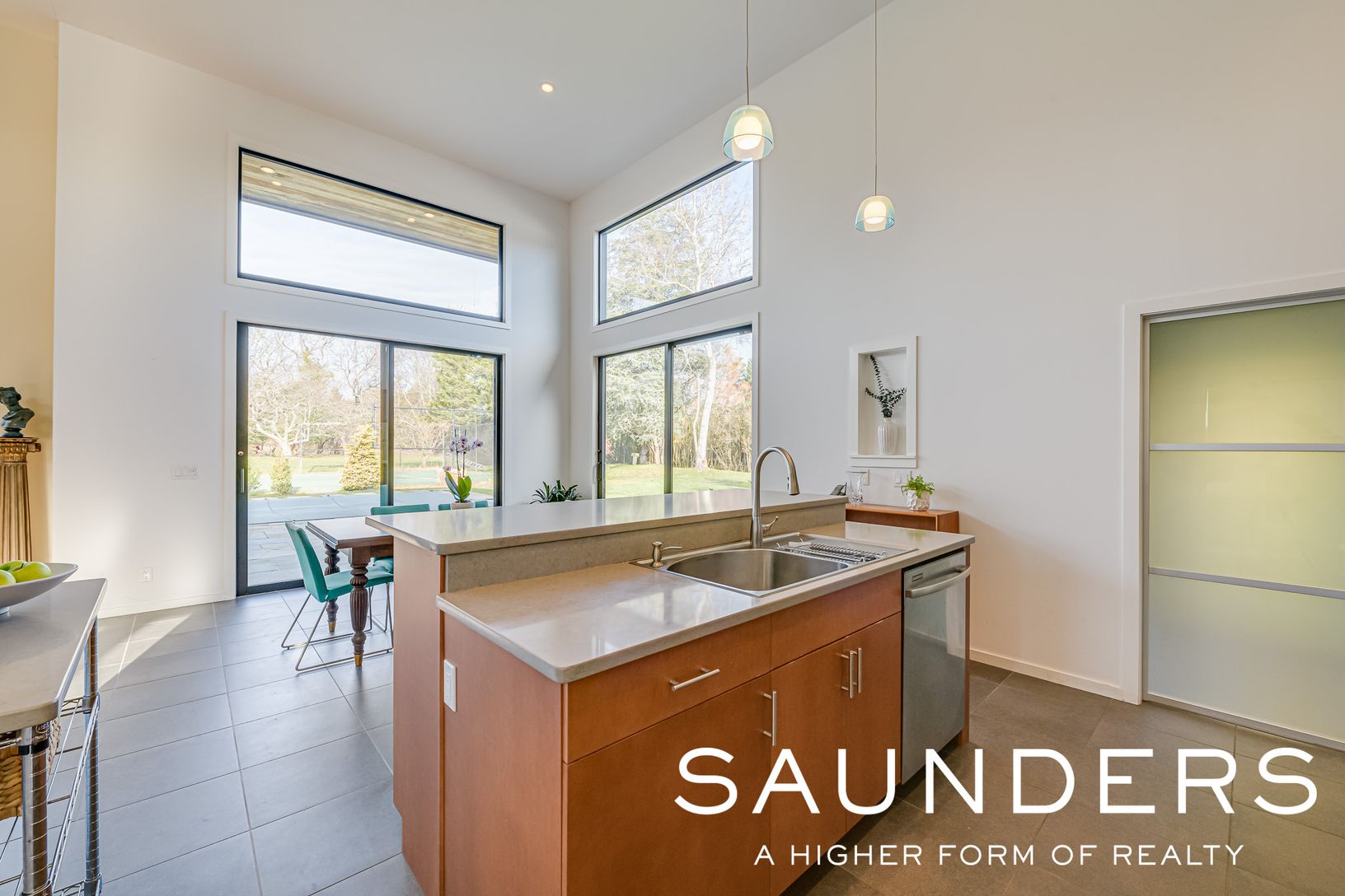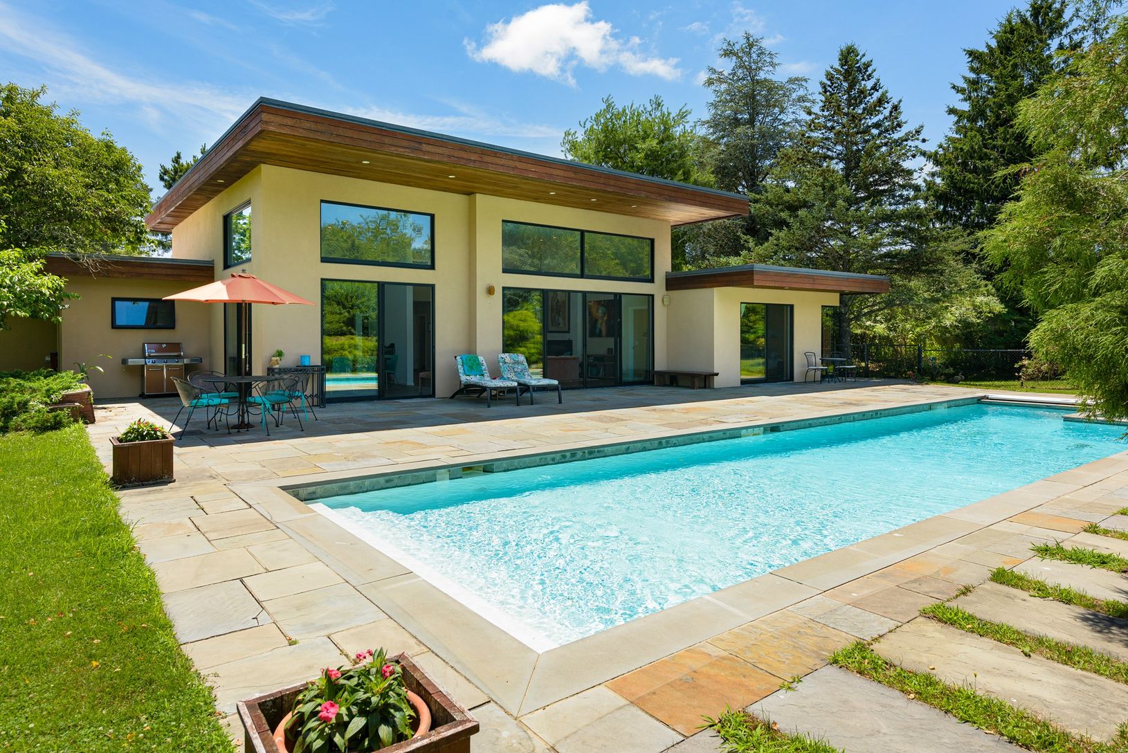 Welcome ... this Midcentury-Modern style home can now be yours. Renovated in 2010, the residence sits on a deep .97 acre lot in a desirable south of the highway location. The power of the interior space, which features 4 bedrooms and 3.5 baths, is intensified by soaring 15-foot ceilings in the living room and dining area that are enhanced by huge sliding glass doors (and 4-foot-high transom windows) that recall the indoor-outdoor relationship