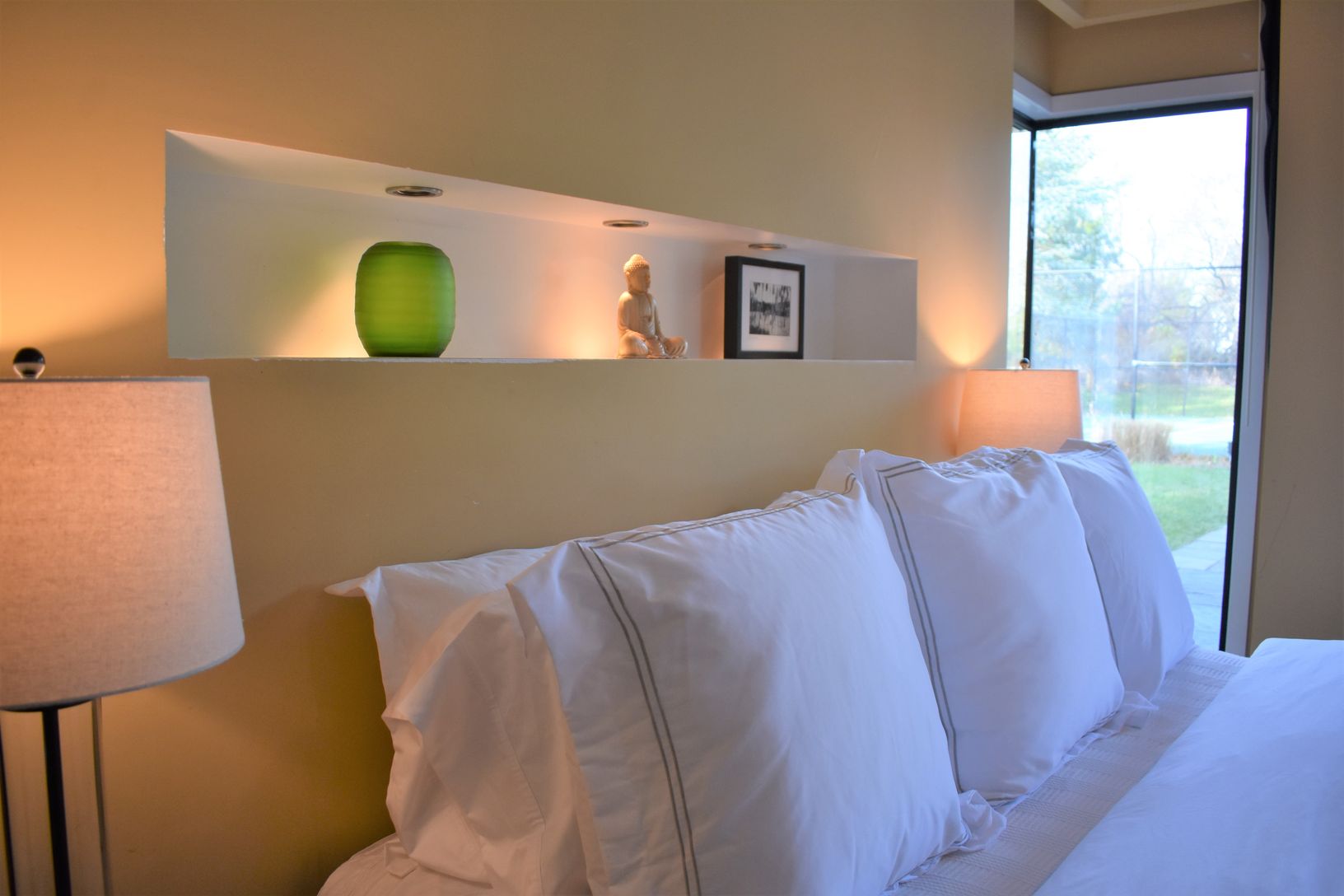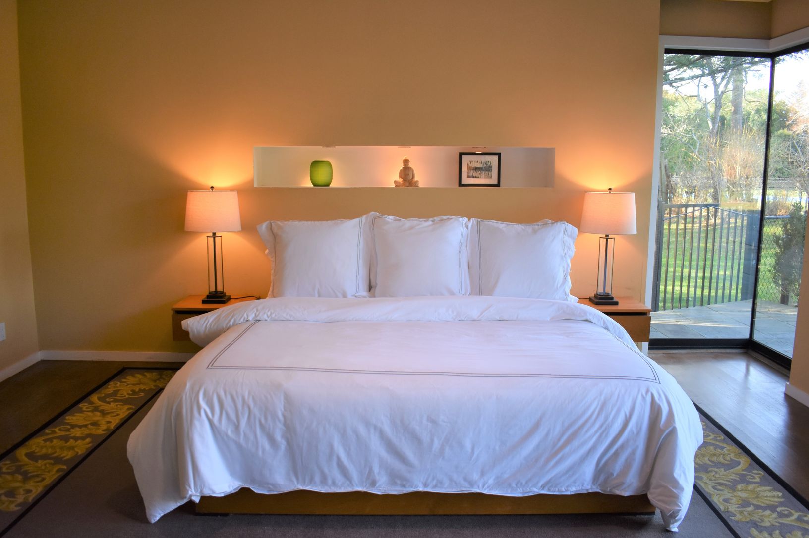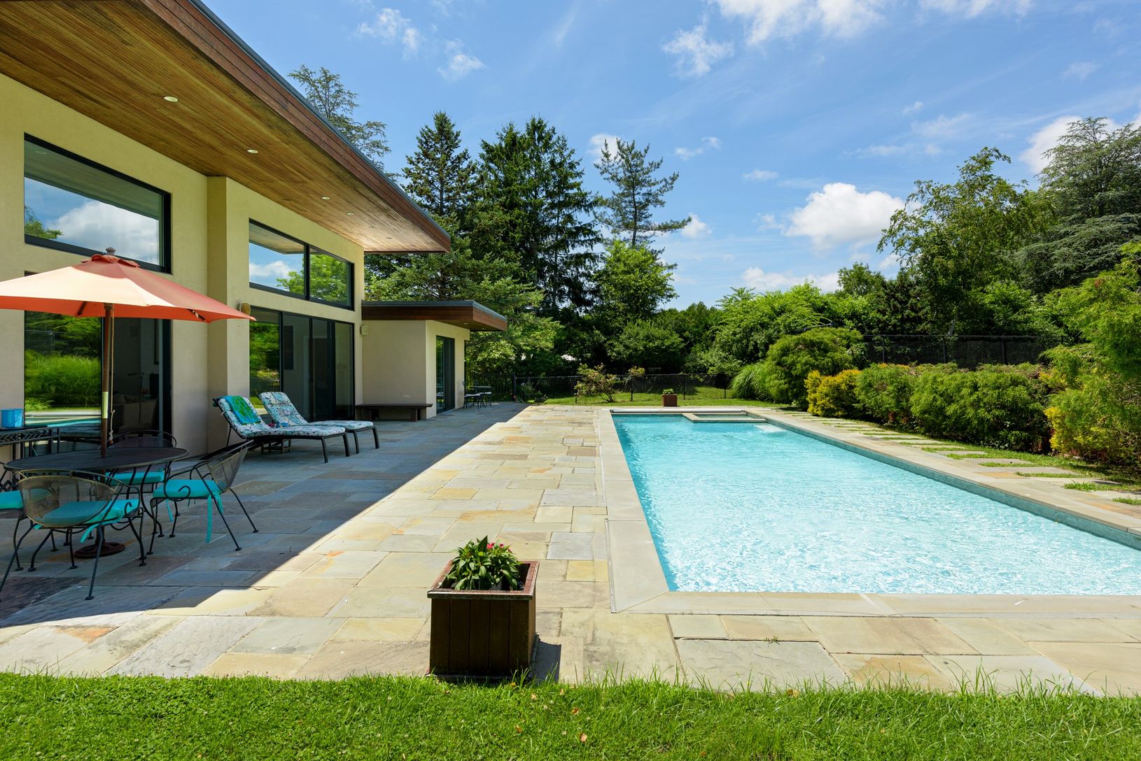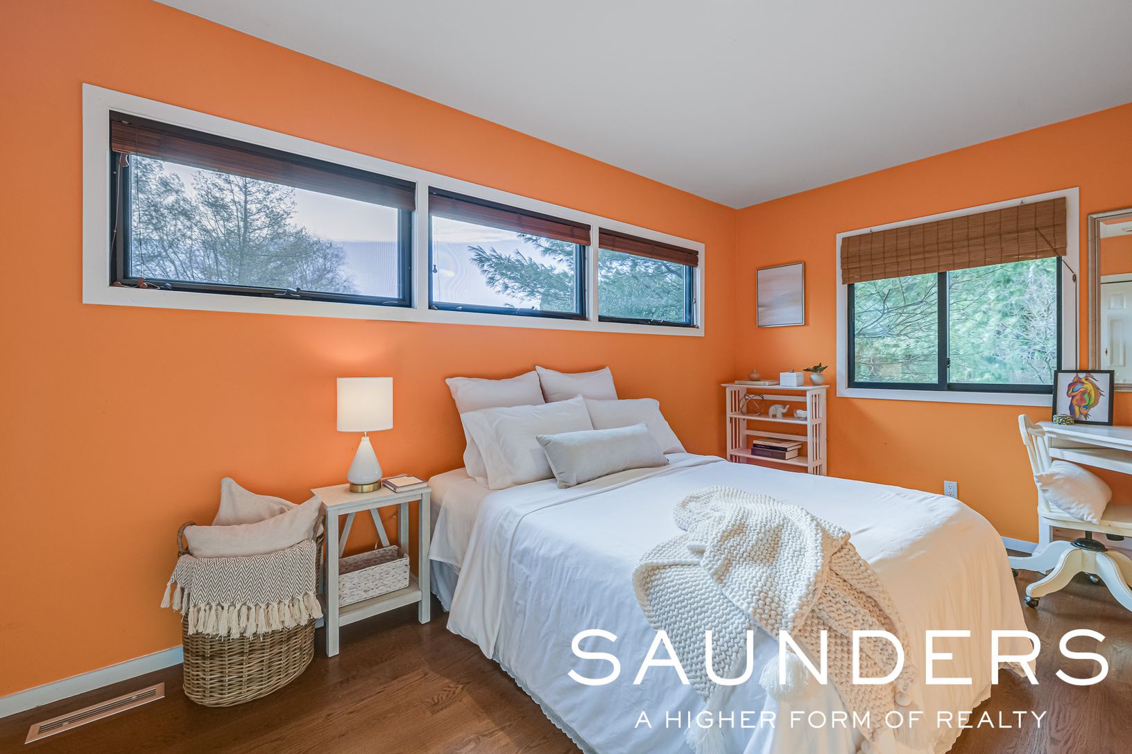 Welcome ... this Midcentury-Modern style home can now be yours. Renovated in 2010, the residence sits on a deep .97 acre lot in a desirable south of the highway location. The power of the interior space, which features 4 bedrooms and 3.5 baths, is intensified by soaring 15-foot ceilings in the living room and dining area that are enhanced by huge sliding glass doors (and 4-foot-high transom windows) that recall the indoor-outdoor relationship