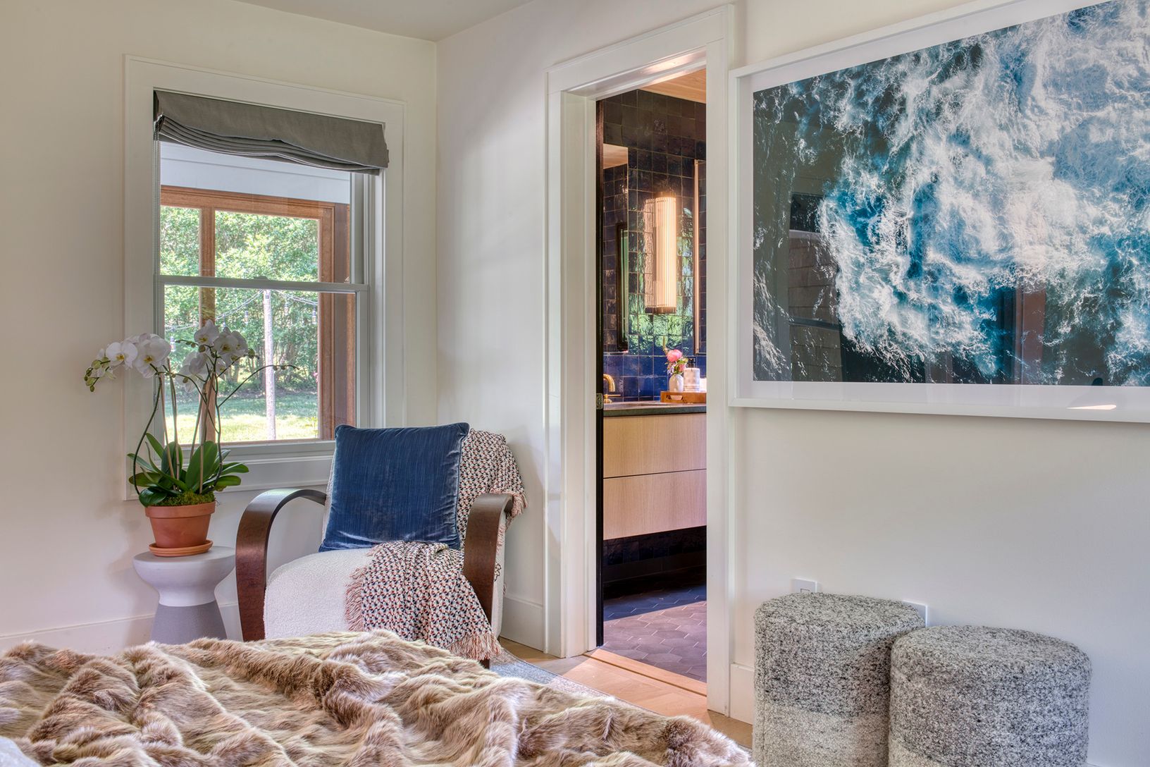 No details spared in this impeccably renovated Village Classic 4-bedroom spacious home with water views of Chase Creek in the heart of Shelter Island Heights and down the street from shops, restaurants, The Chequit Hotel, Eccentric Bagel, Stars Cafe, Marie Eiffel, Leon 1901, Sunset Beach, Shelter Island Golf Club and more. The first floor graciously flows from the living room with new raised fireplace with custom floating stone seating to t