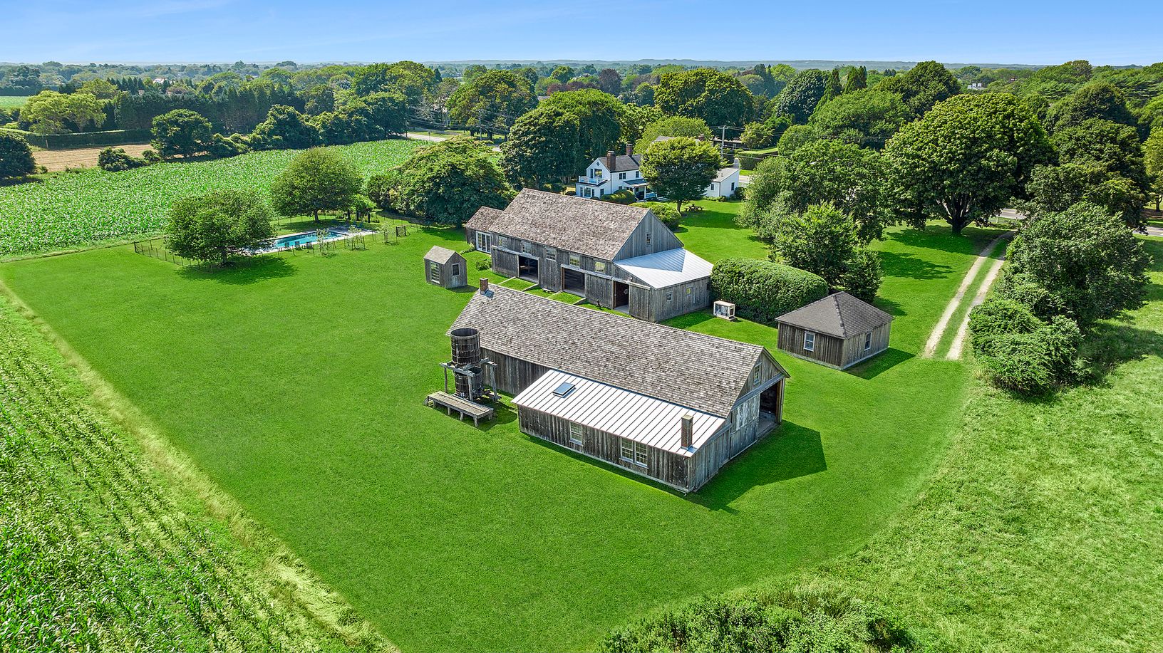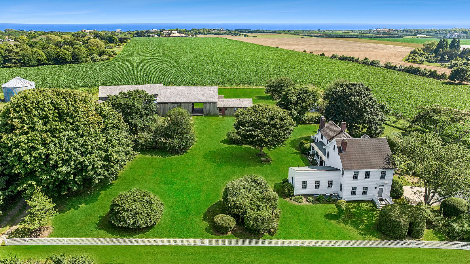 Newly available, this unique offering presents the rare opportunity to own one of the only parcels in existence with 270 degrees of protected farm and ocean views. Set on 2.8 +/- acres on prestigious Hedges Lane and bordering over 30 acres of protected farm fields to the south, the compound affords multiple legal structures with endless possibilities for customization. Positioned at the forefront of the property, the 3,329 +/- sq. ft. main res