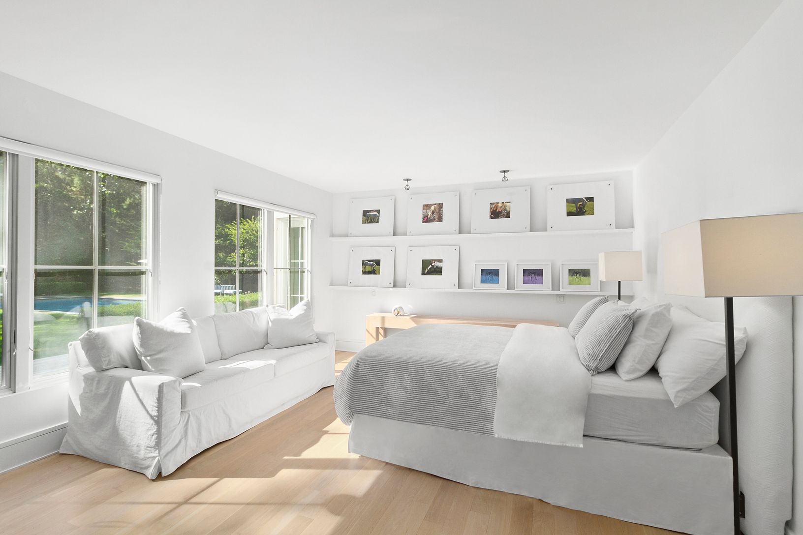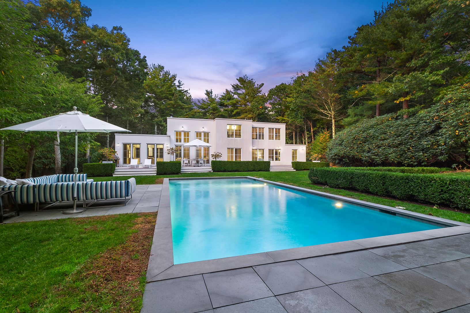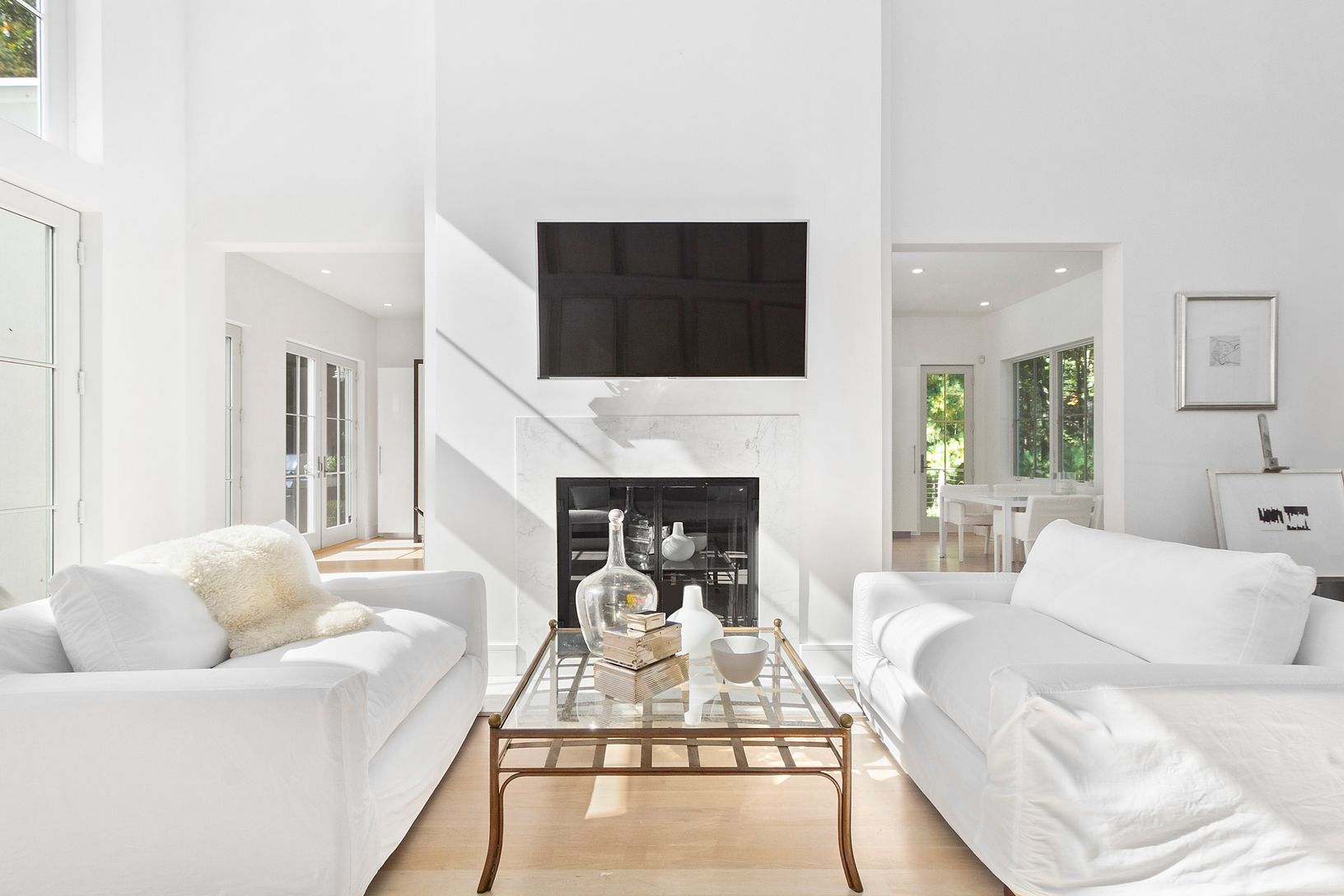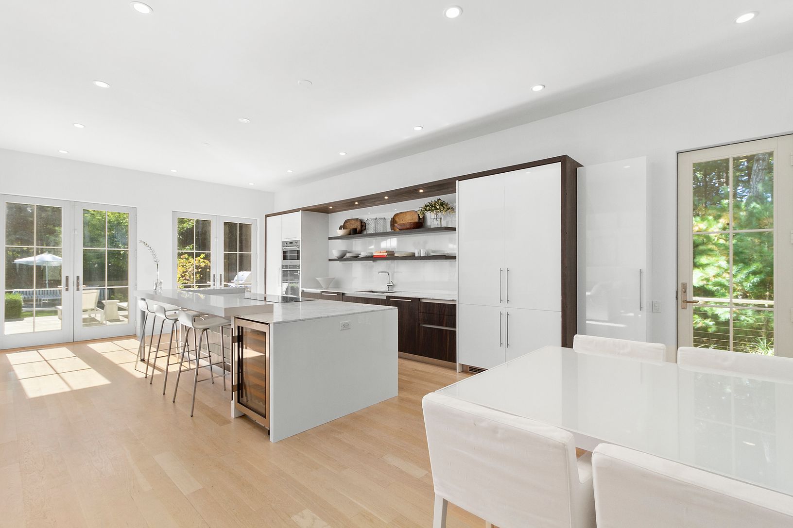 Fully renovated and light-filled modern home on over two acres along prestigious Bull Path. A double height foyer leads to an open living and dining space with wood burning fireplace. The eat-in chef’s kitchen features Smeg appliances and high-end Italian fixtures and finishes. A den off the entrance can double as an office space. The main level also features a powder room, laundry room, and three ensuite guest bedrooms, including a private ju
