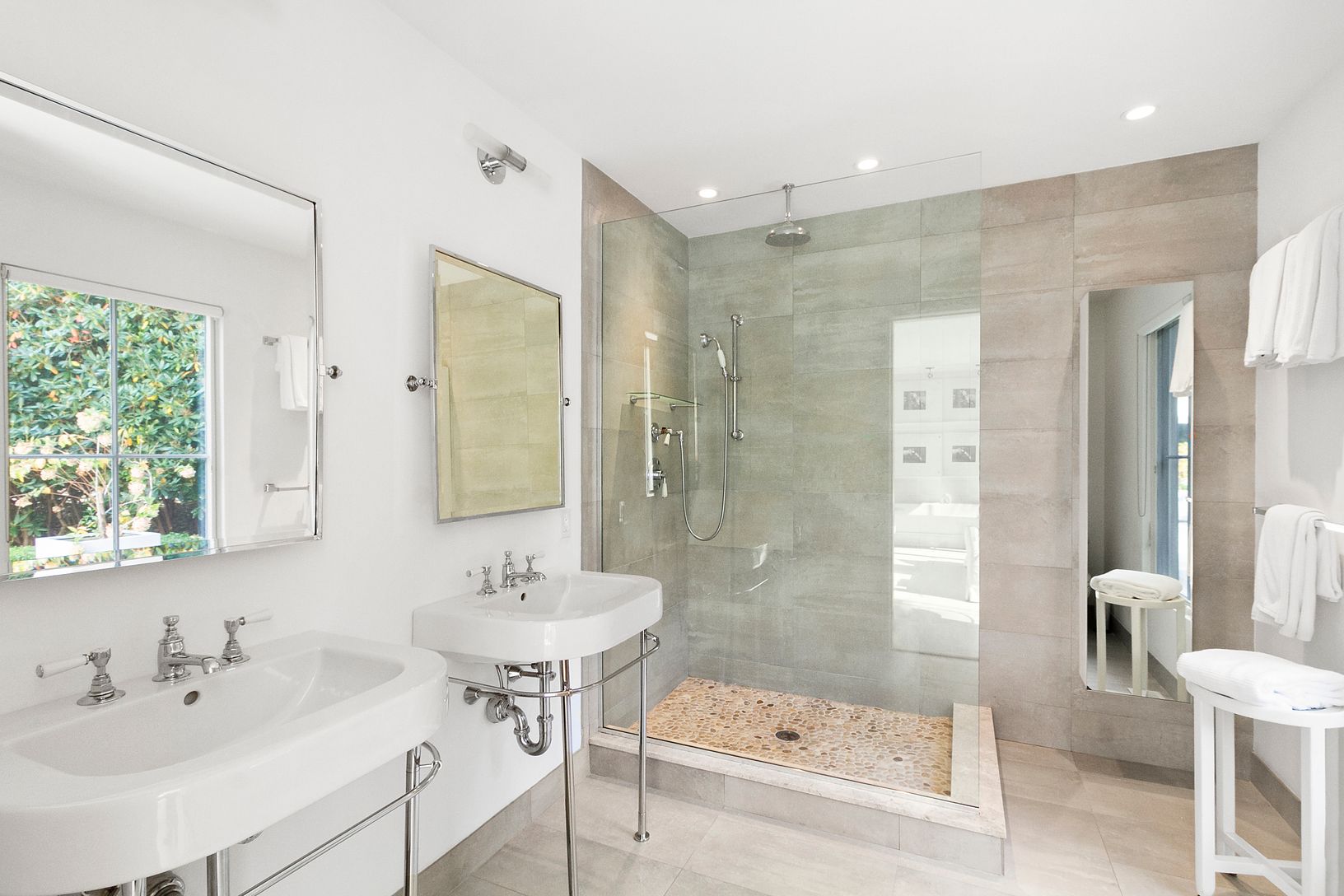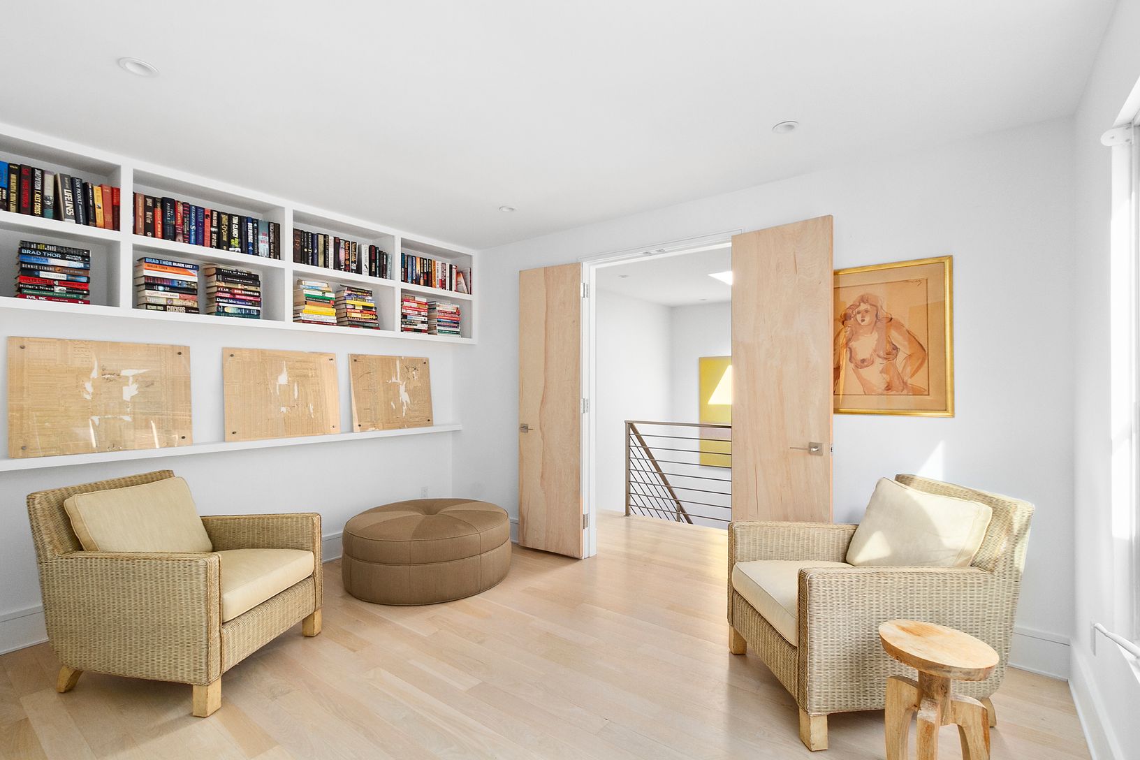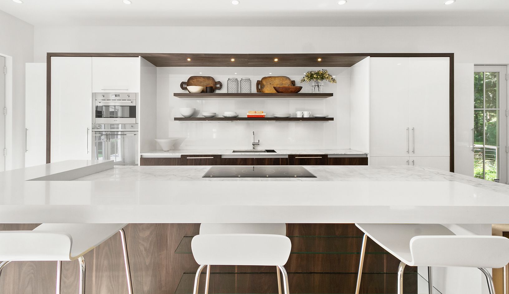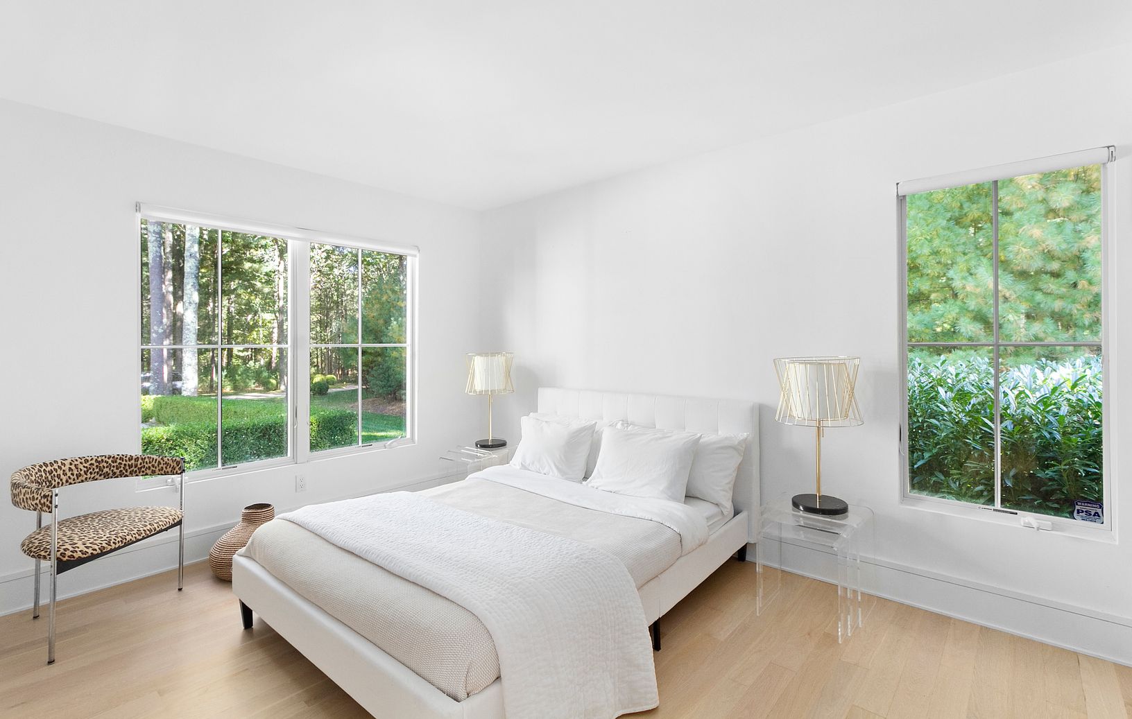 Fully renovated and light-filled modern home on over two acres along prestigious Bull Path. A double height foyer leads to an open living and dining space with wood burning fireplace. The eat-in chef’s kitchen features Smeg appliances and high-end Italian fixtures and finishes. A den off the entrance can double as an office space. The main level also features a powder room, laundry room, and three ensuite guest bedrooms, including a private ju