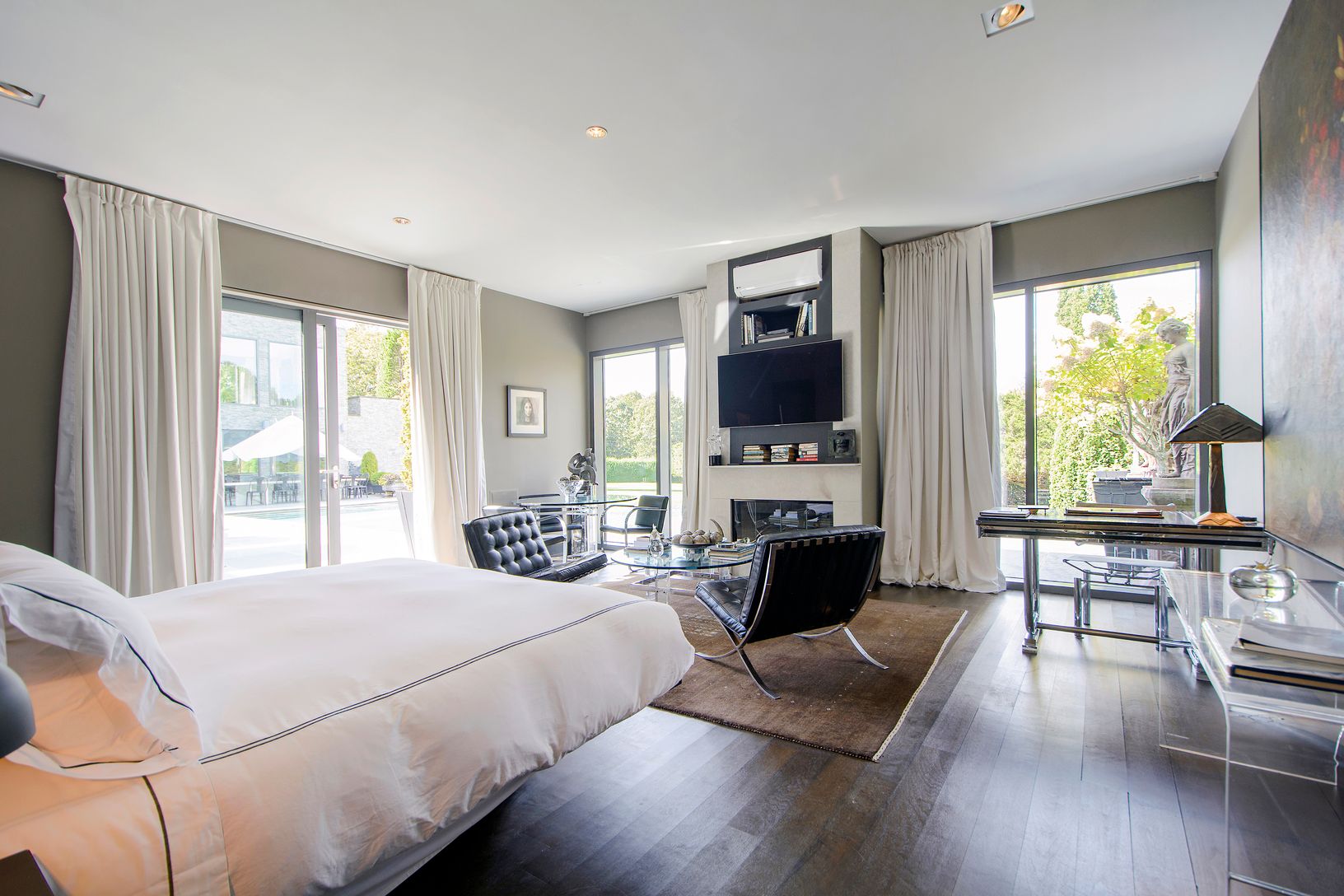 Exquisitely executed 8,300 +/- sq. ft. 2 story modern, perfectly sited on 1.25 +/- acres. 8 bedrooms, 11 bathrooms, grand chefs kitchen with top of the line appliances, wine cellar, private theater, library, full bar, all built to the finest standards and reflecting masterful craftsmanship. Second story deck offers panoramic views across manicured grounds to the pond. Gunite infinity edge pool. Impeccably decorated. Completely private, surroun