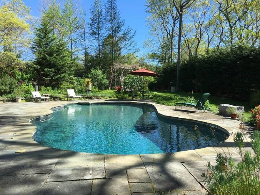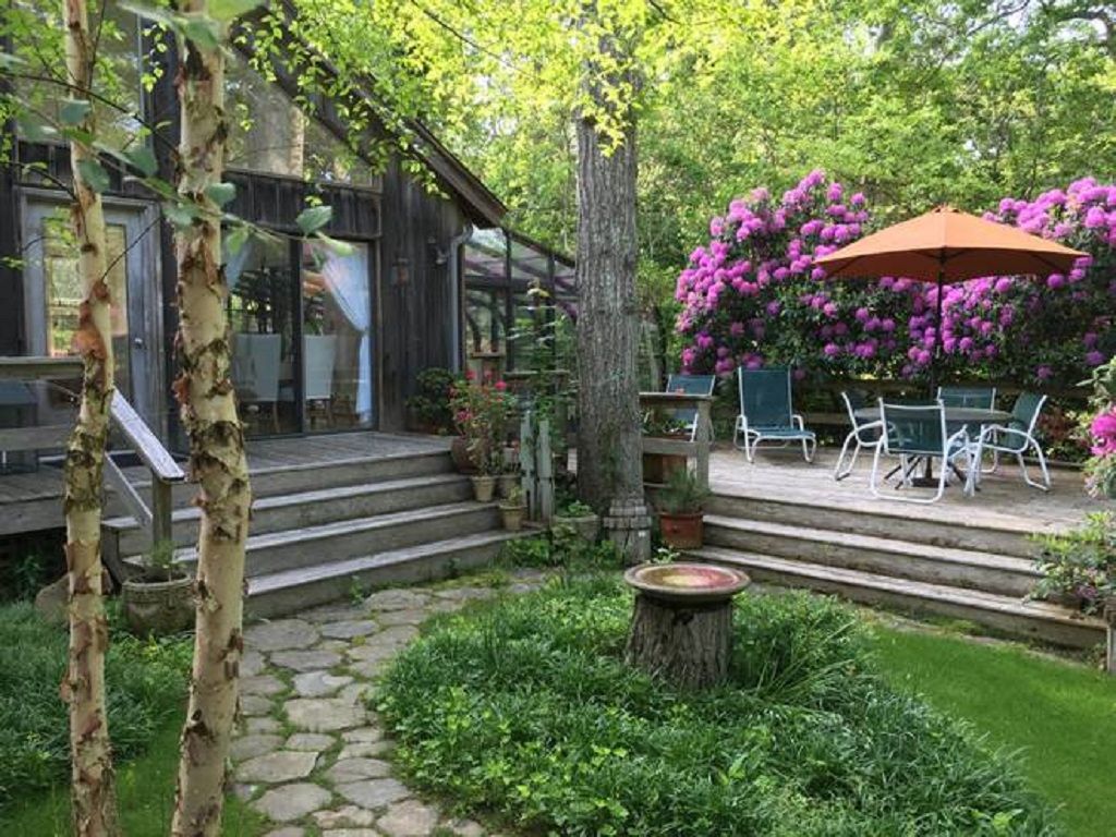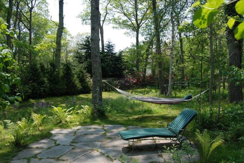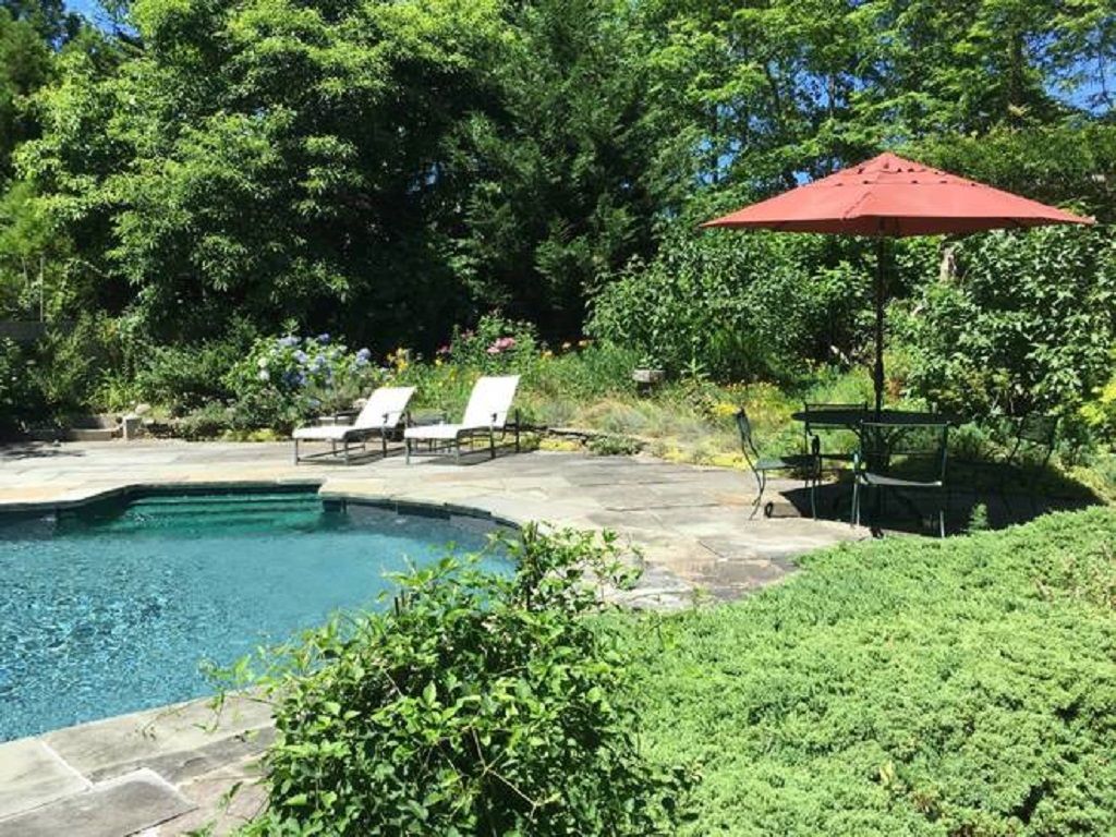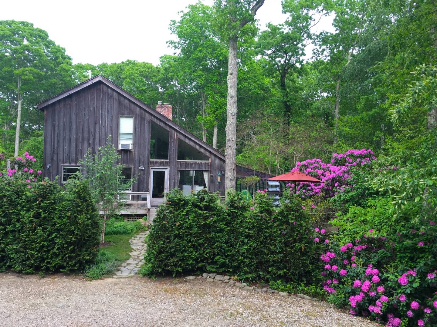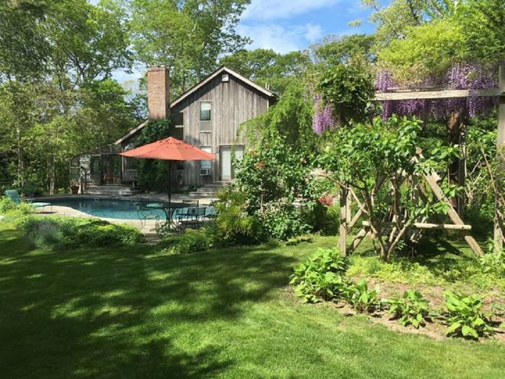 Conveniently situated between East Hampton and Amagansett villages, this artfully decorated house sits off a long driveway, on a 1.3-acre private flag lot in a quiet neighborhood. This spacious and light filled contemporary saltbox offers an open living room with high ceilings, three bedrooms, two baths, fireplace, eat-in-kitchen, dining area and all amenities. An expansive solarium overlooks the large blue-stone patio with outdoor shower, hea