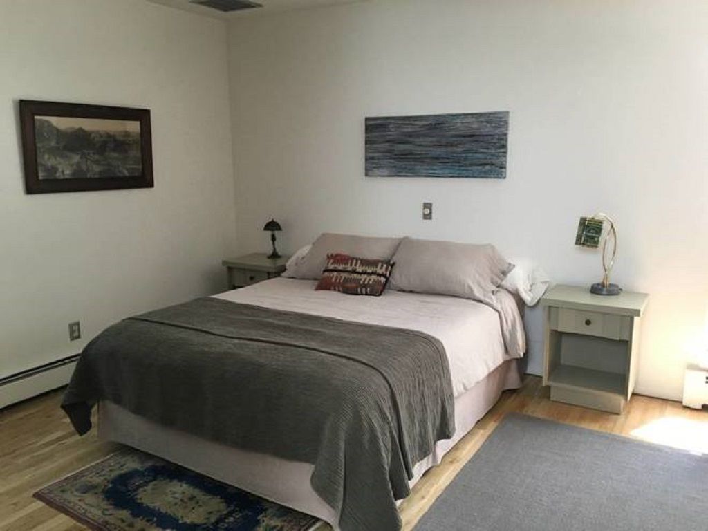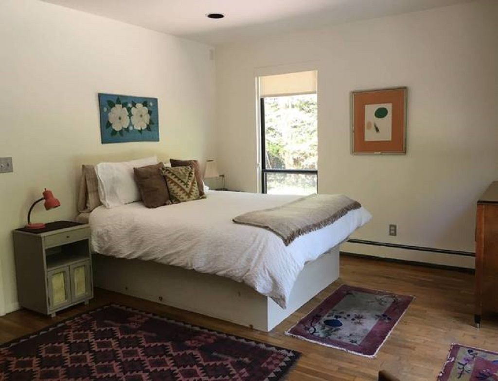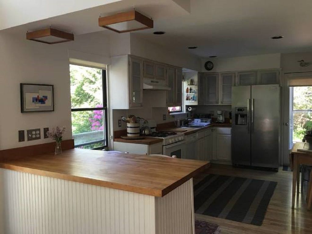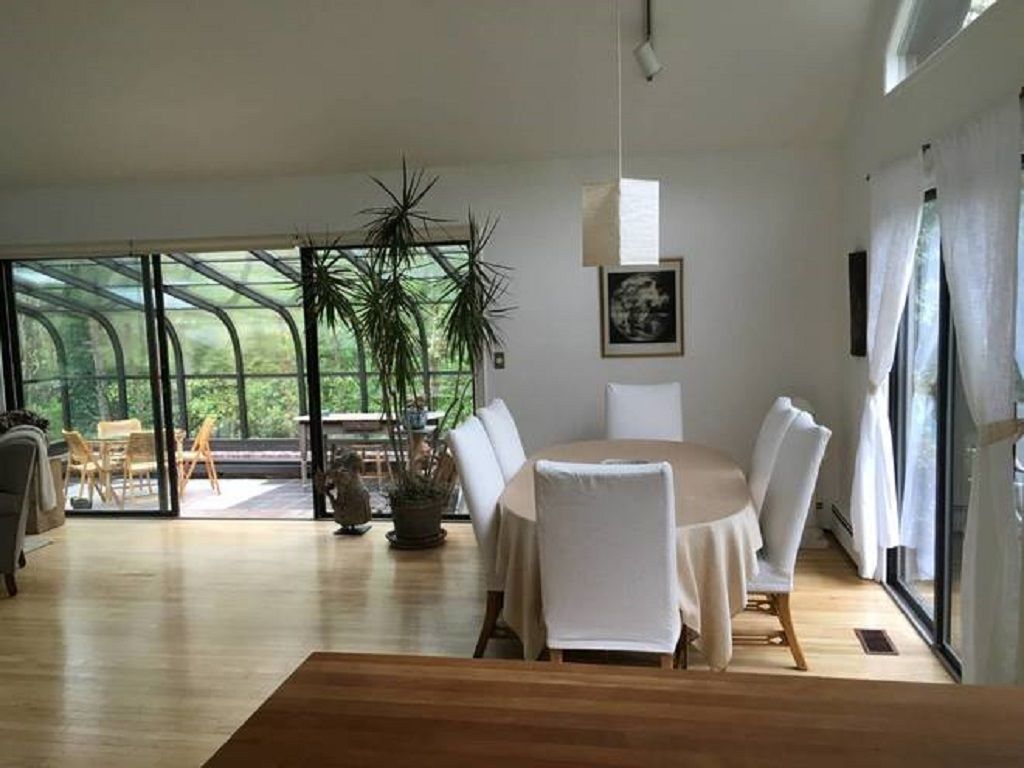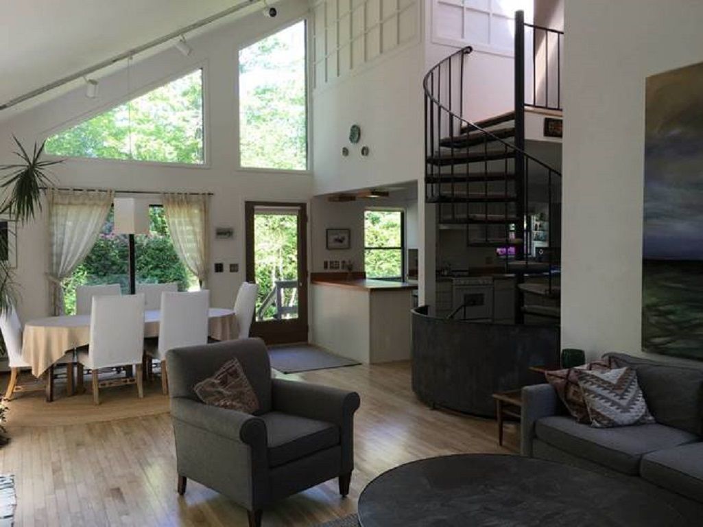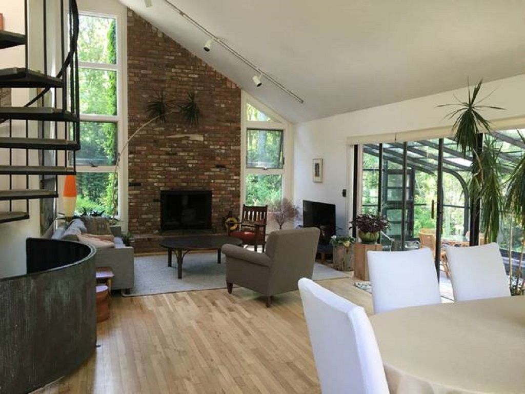 Conveniently situated between East Hampton and Amagansett villages, this artfully decorated house sits off a long driveway, on a 1.3-acre private flag lot in a quiet neighborhood. This spacious and light filled contemporary saltbox offers an open living room with high ceilings, three bedrooms, two baths, fireplace, eat-in-kitchen, dining area and all amenities. An expansive solarium overlooks the large blue-stone patio with outdoor shower, hea