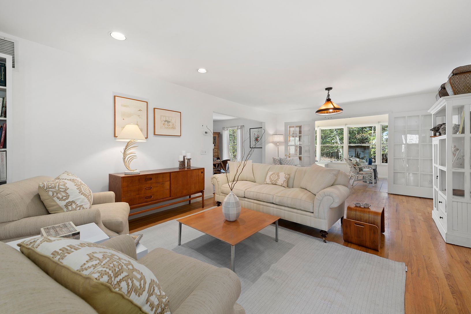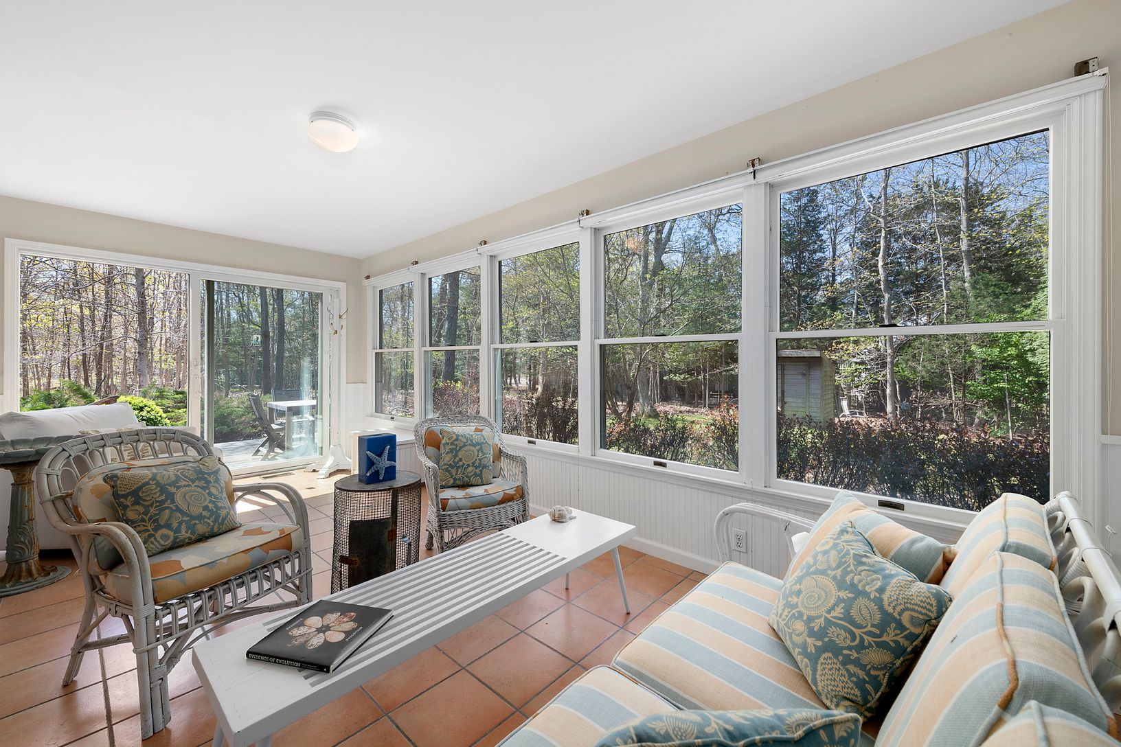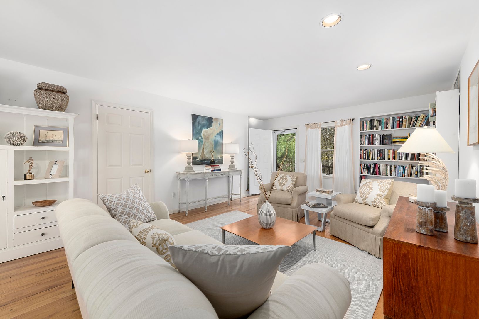 Tucked away behind the Chapel in Barnes Landing, sits this Traditional home with four bedrooms and two and a half baths. Set on .48+- of an acre, and surrounded by Nature preserve, this home has a spacious living room, a dining room with masonry fireplace, an all weather sun-room, bright kitchen, front porch, back deck, and outdoor shower. Very close to Markets and bay beaches.